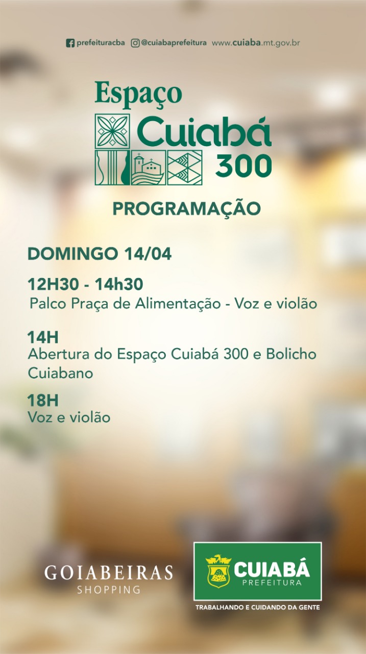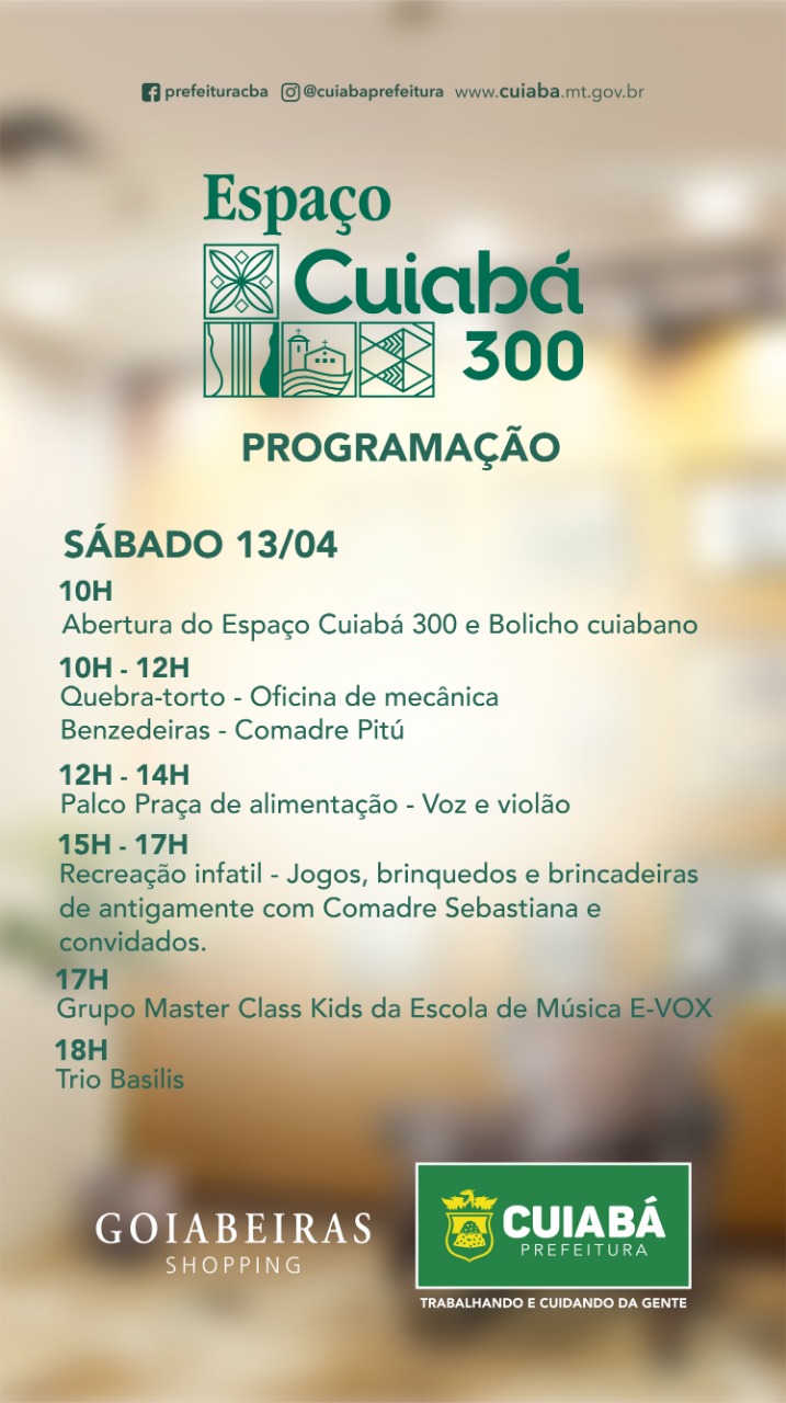 Inaugurado para celebrar a memória da Capital, o Espaço Cuiabá 300, no Shopping Goiabeiras, recebe extensa programação cultural durante todo o final de semana. Já às 10h do sábado (13), o local abre as portas com o bolicho cuiabano. A programação se estende com quebra torto, apresentações de artistas regionais, recreação infantil, palco na praça de alimentação, dentre outros.