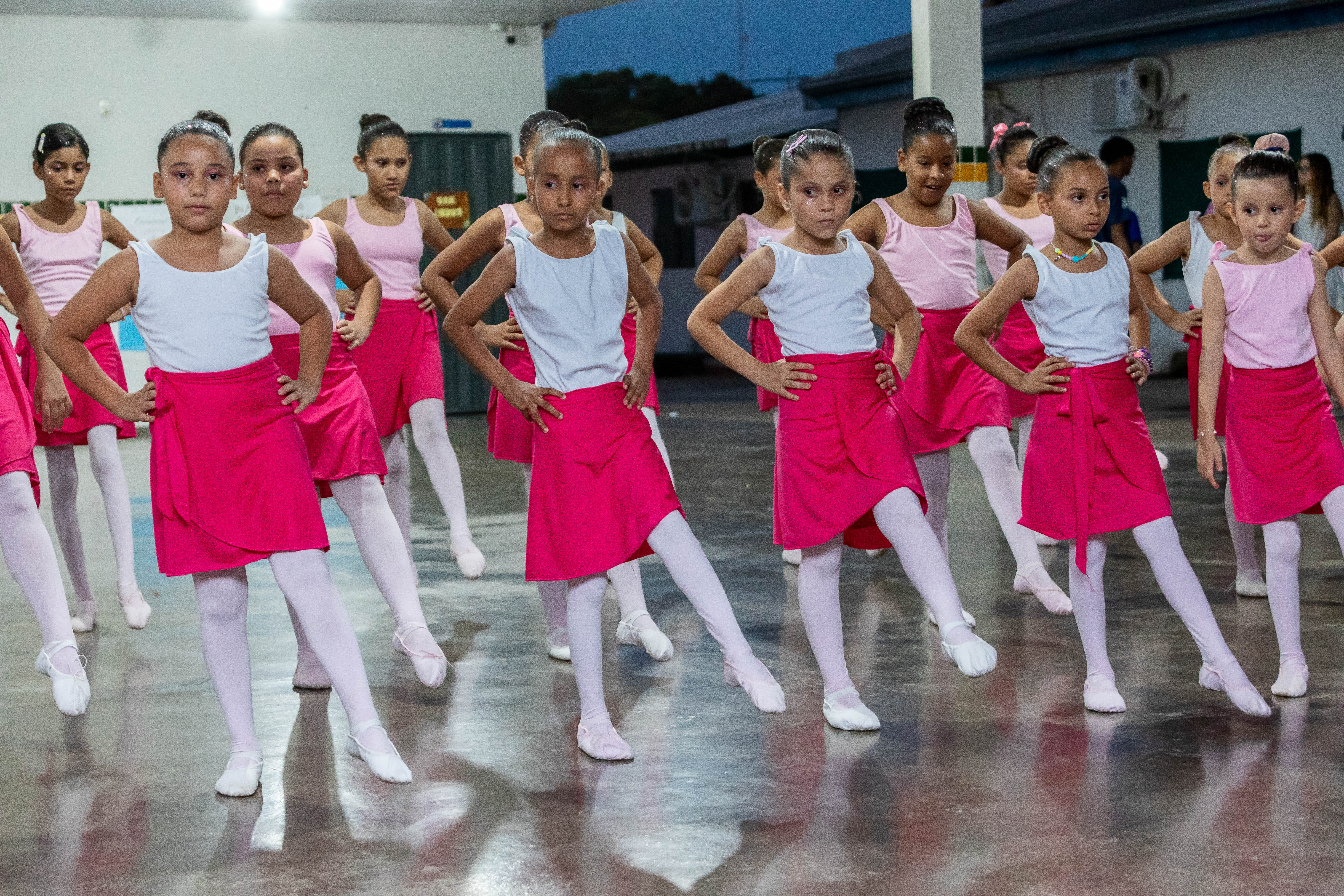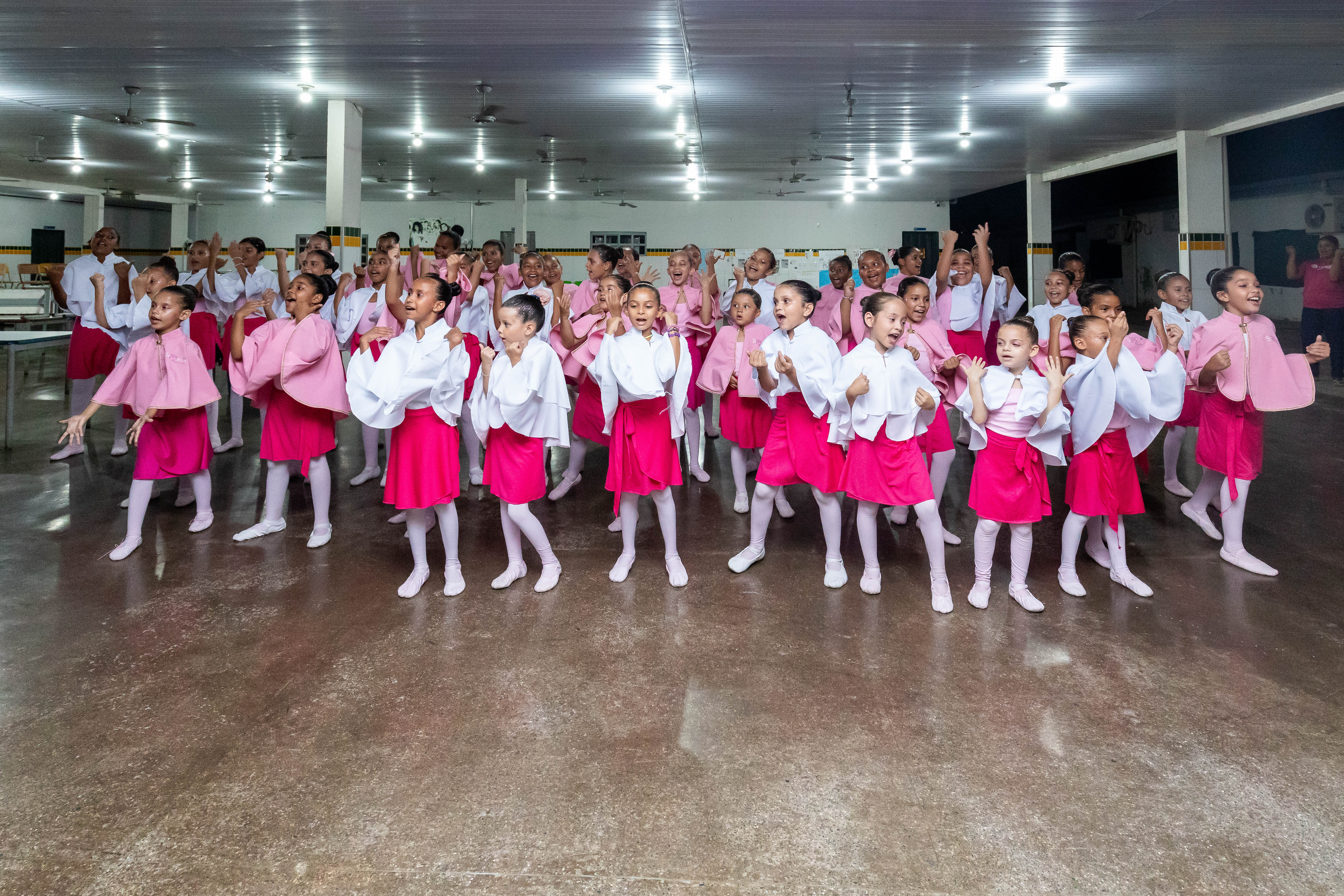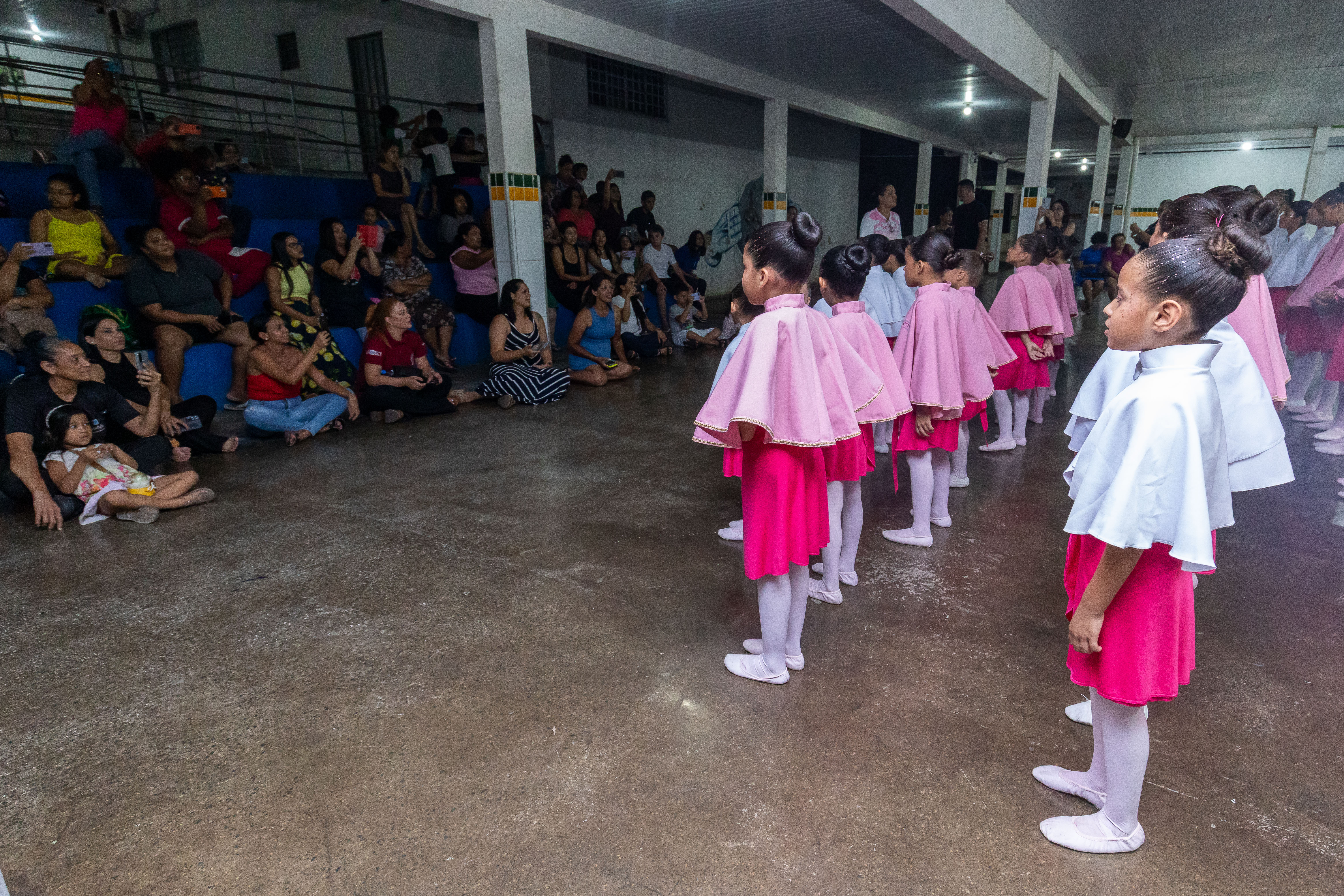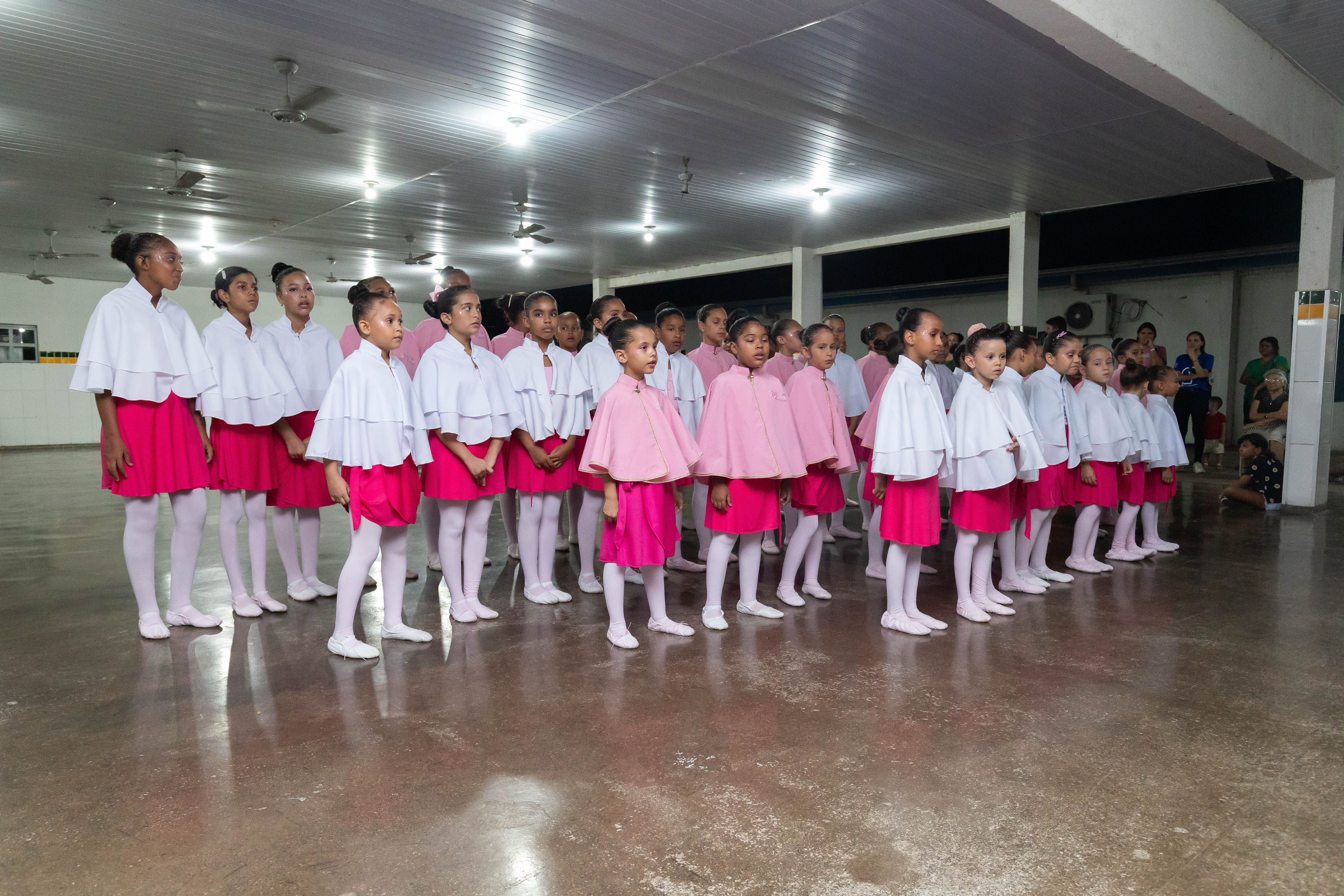 Quarenta e oito meninas atendidas pelo Programa Siminina, no bairro Santa Isabel, proporcionaram uma noite encantadora, de muita emoção e alegria, na terça-feira (25), nas dependências da Escola Professor Ranulpho Paes de Barros. O público presente, entre eles pais, amigos e profissionais envolvidos, não continha o brilho no olhar a cada gesto e passo das apresentações. Além do balé, as meninas que compõem o coral exibiram três canções, entre elas uma de Natal. O elenco protagonista do evento é formado por meninas com idade entre 6 e 14 anos, algumas delas novatas, outras há cerca de 4 anos no Siminina. No total, a Prefeitura de Cuiabá conta com 16 unidades do Siminina distribuídas em diversas regiões da Capital, que compreendem 1.200 meninas atendidas, com o apoio do Núcleo da Primeira-Dama.