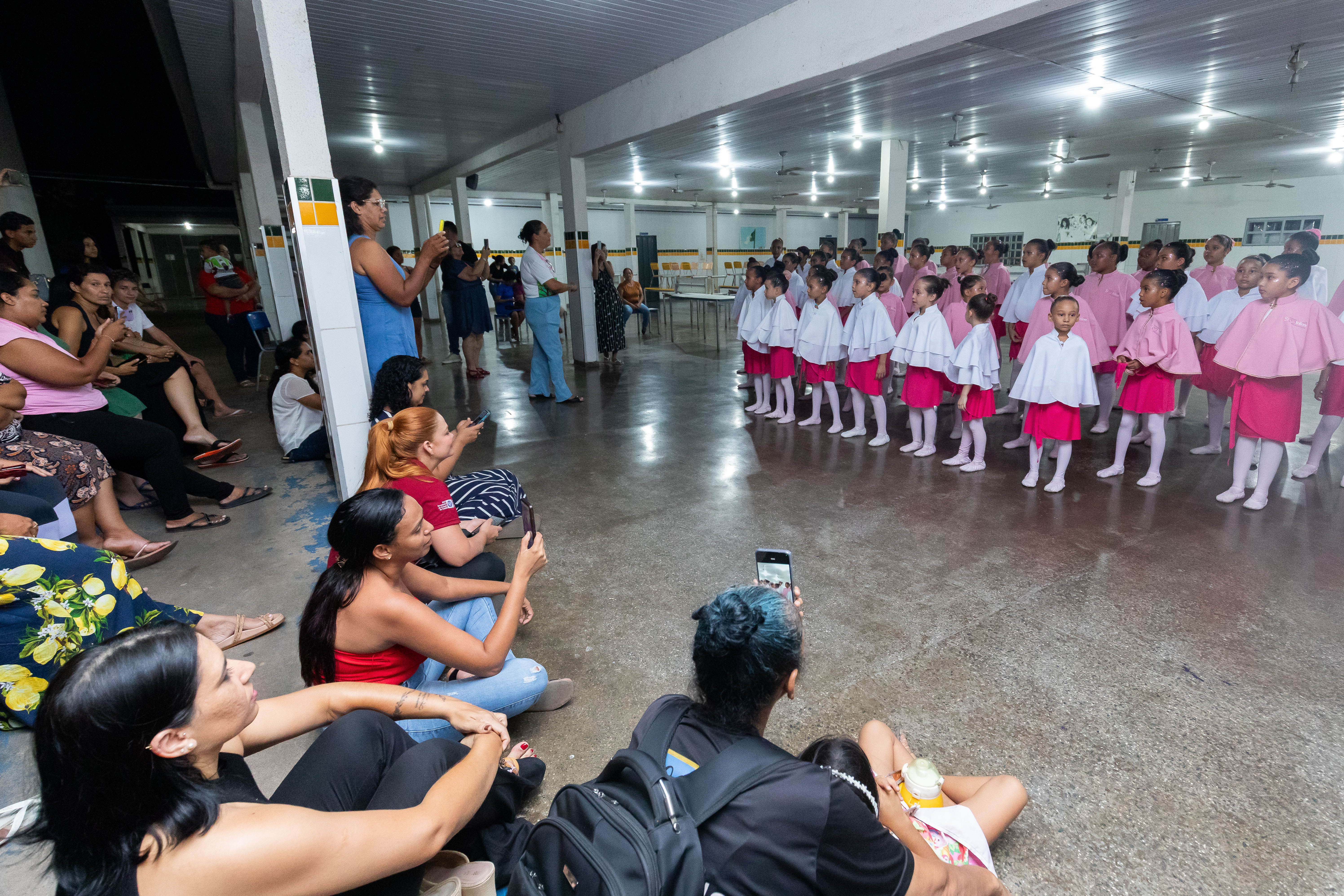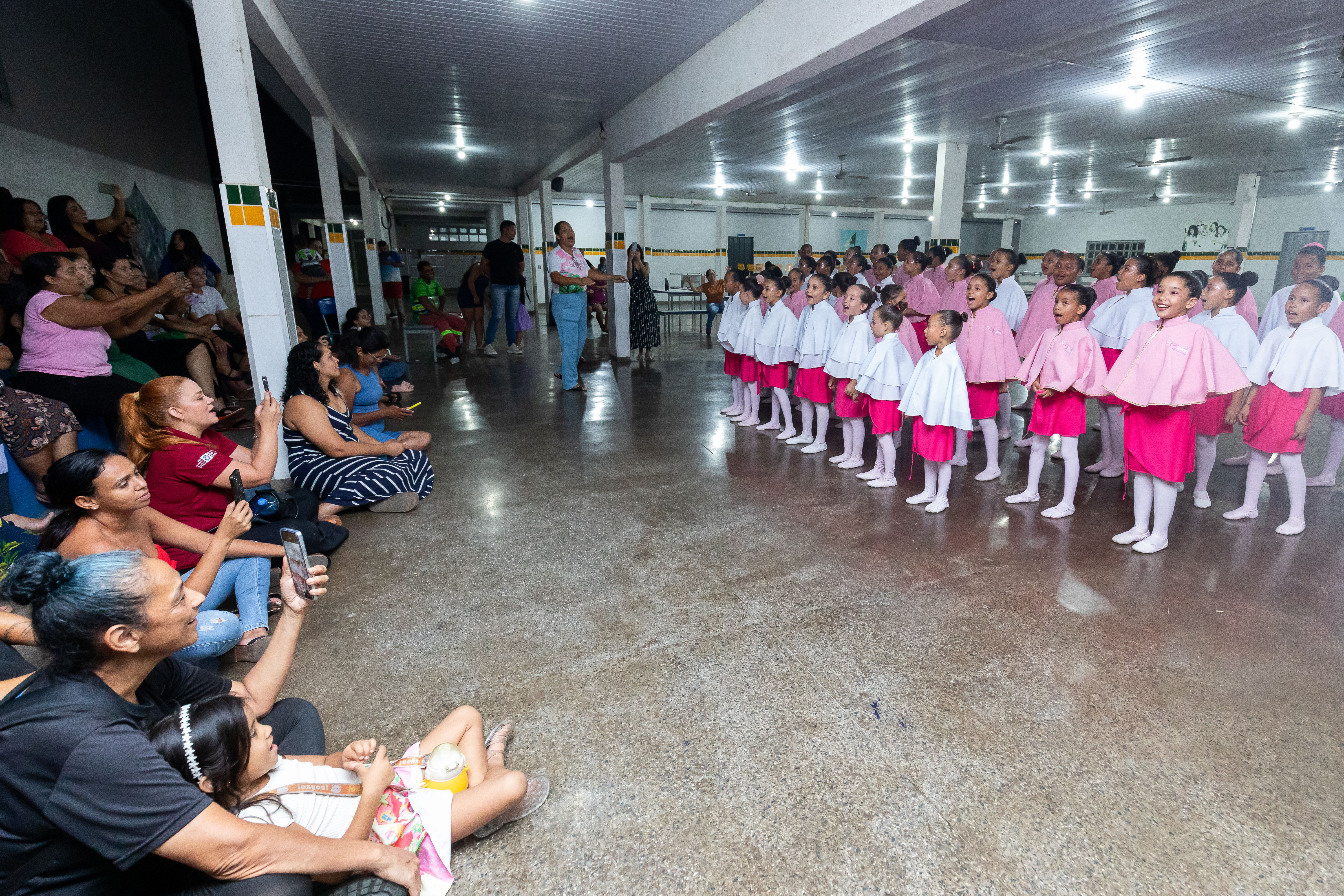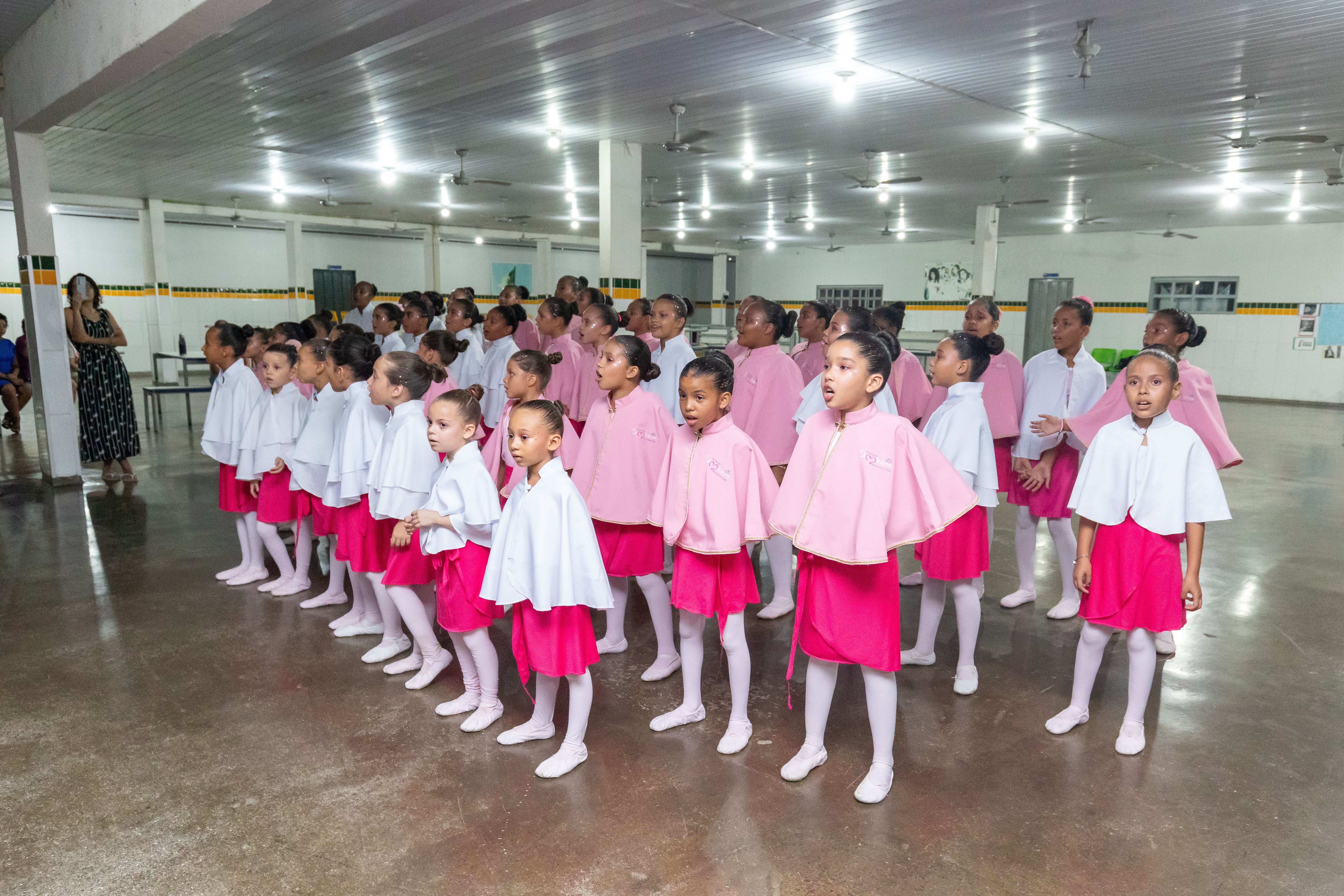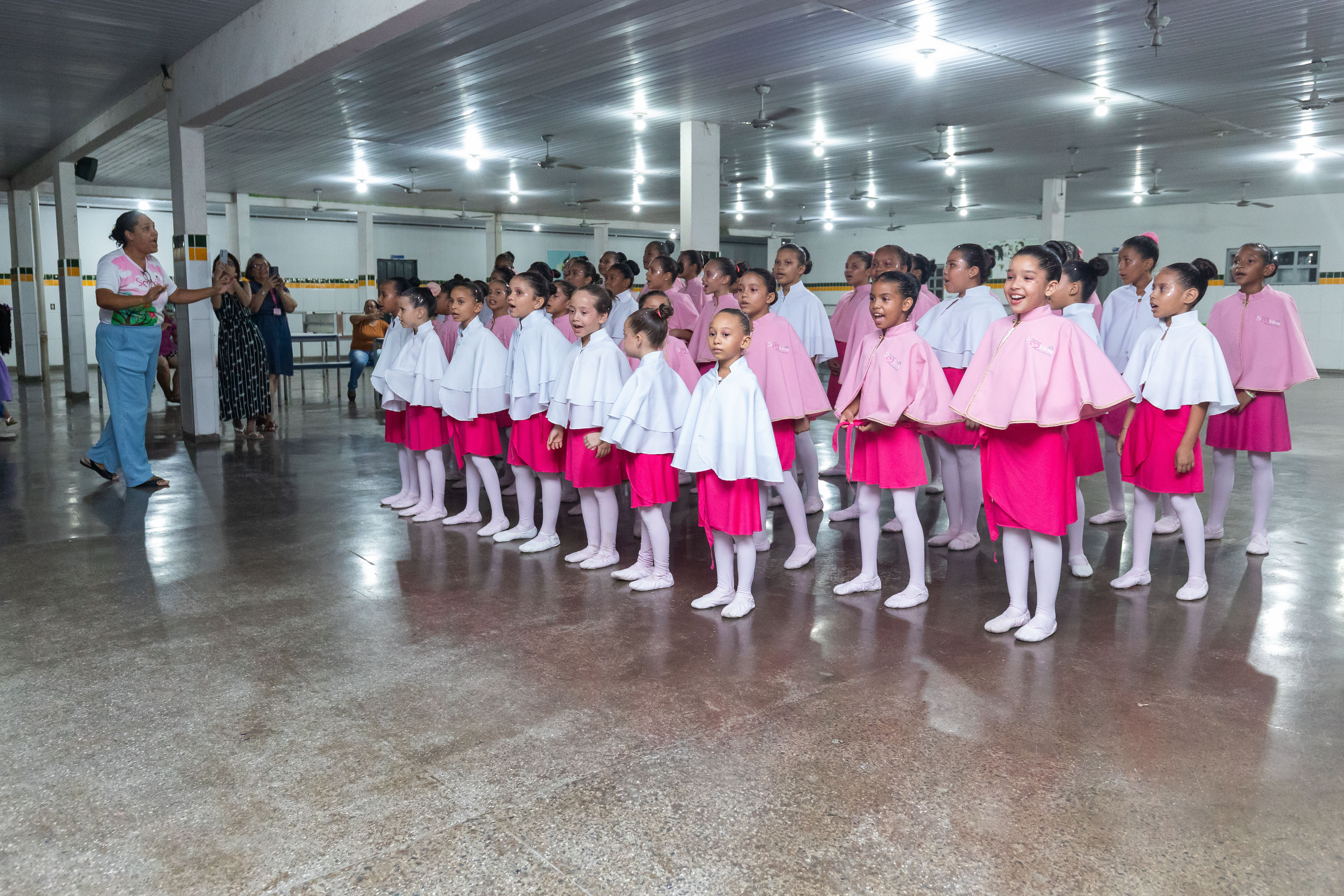 Quarenta e oito meninas atendidas pelo Programa Siminina, no bairro Santa Isabel, proporcionaram uma noite encantadora, de muita emoção e alegria, na terça-feira (25), nas dependências da Escola Professor Ranulpho Paes de Barros. O público presente, entre eles pais, amigos e profissionais envolvidos, não continha o brilho no olhar a cada gesto e passo das apresentações. Além do balé, as meninas que compõem o coral exibiram três canções, entre elas uma de Natal. O elenco protagonista do evento é formado por meninas com idade entre 6 e 14 anos, algumas delas novatas, outras há cerca de 4 anos no Siminina. No total, a Prefeitura de Cuiabá conta com 16 unidades do Siminina distribuídas em diversas regiões da Capital, que compreendem 1.200 meninas atendidas, com o apoio do Núcleo da Primeira-Dama.