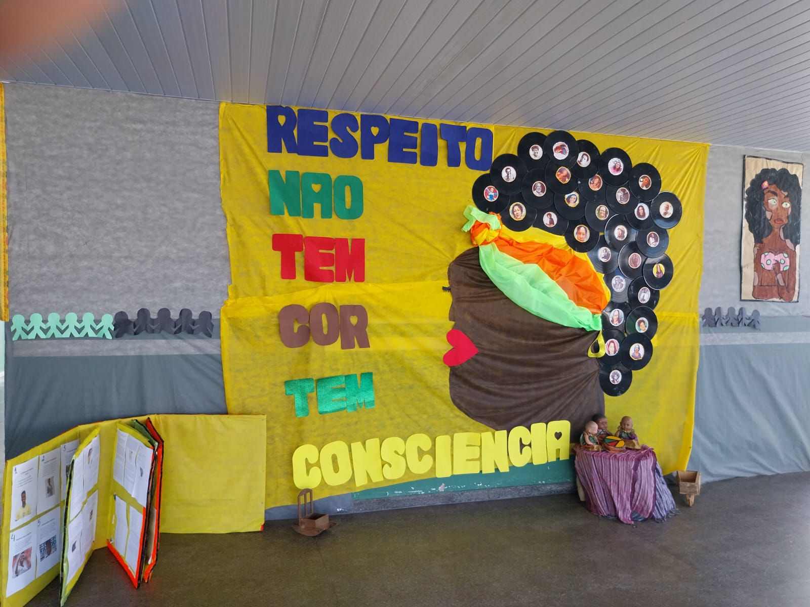 O trabalho foi produzido por mais de 100 estudantes, sempre monitorado pelos professores, coordenadoria e direção escolar. No pátio da escola, havia cartolinas detalhando a culinária afro-brasileira. Nas salas de aula, cartolinas, exibiam o rosto de crianças negras. Em uma cartolina maior no pátio da escola, estava montada com faixas corolidas e peças de discos de música a forma do rosto de uma mulher, em tamanho maior, com letras maiúsculas que formavam a palavra "Respeito não tem cor, tem consciência".