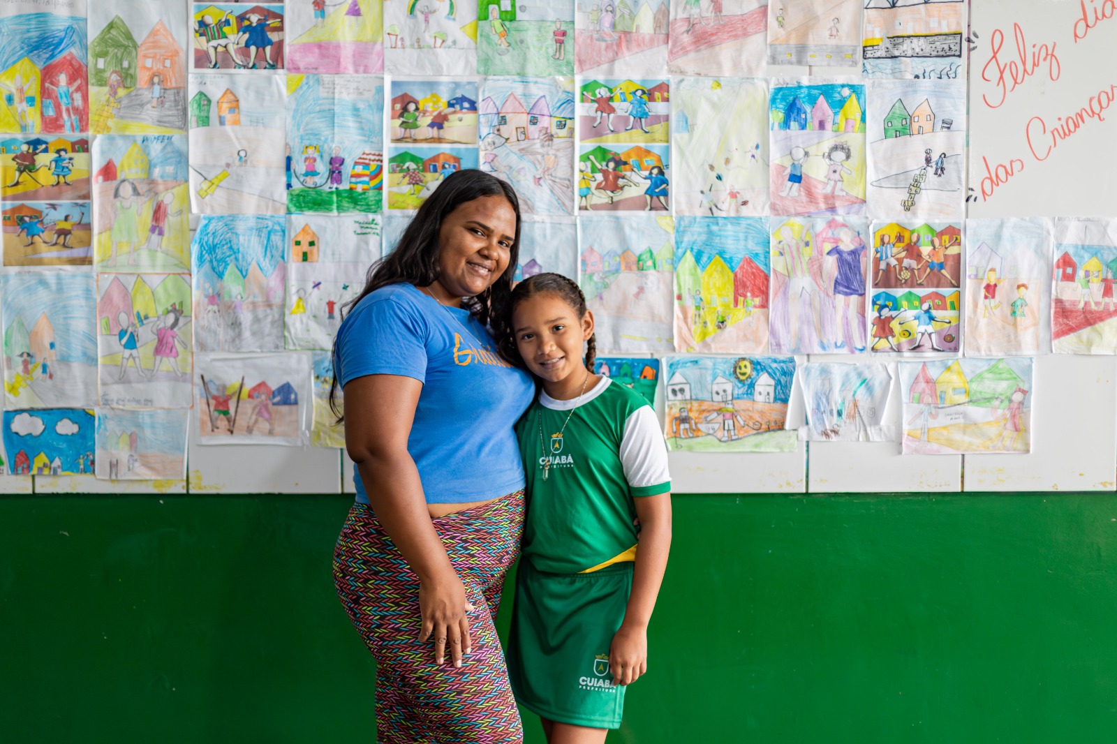 A foto ilustra duas crianças vestidas com uniforme oficial da Prefeitura de Cuiabá. Elas estão acompanhadas das mães e servidores. No fundo, é possível visualizar uma parede com diversos desenhos escolares.
