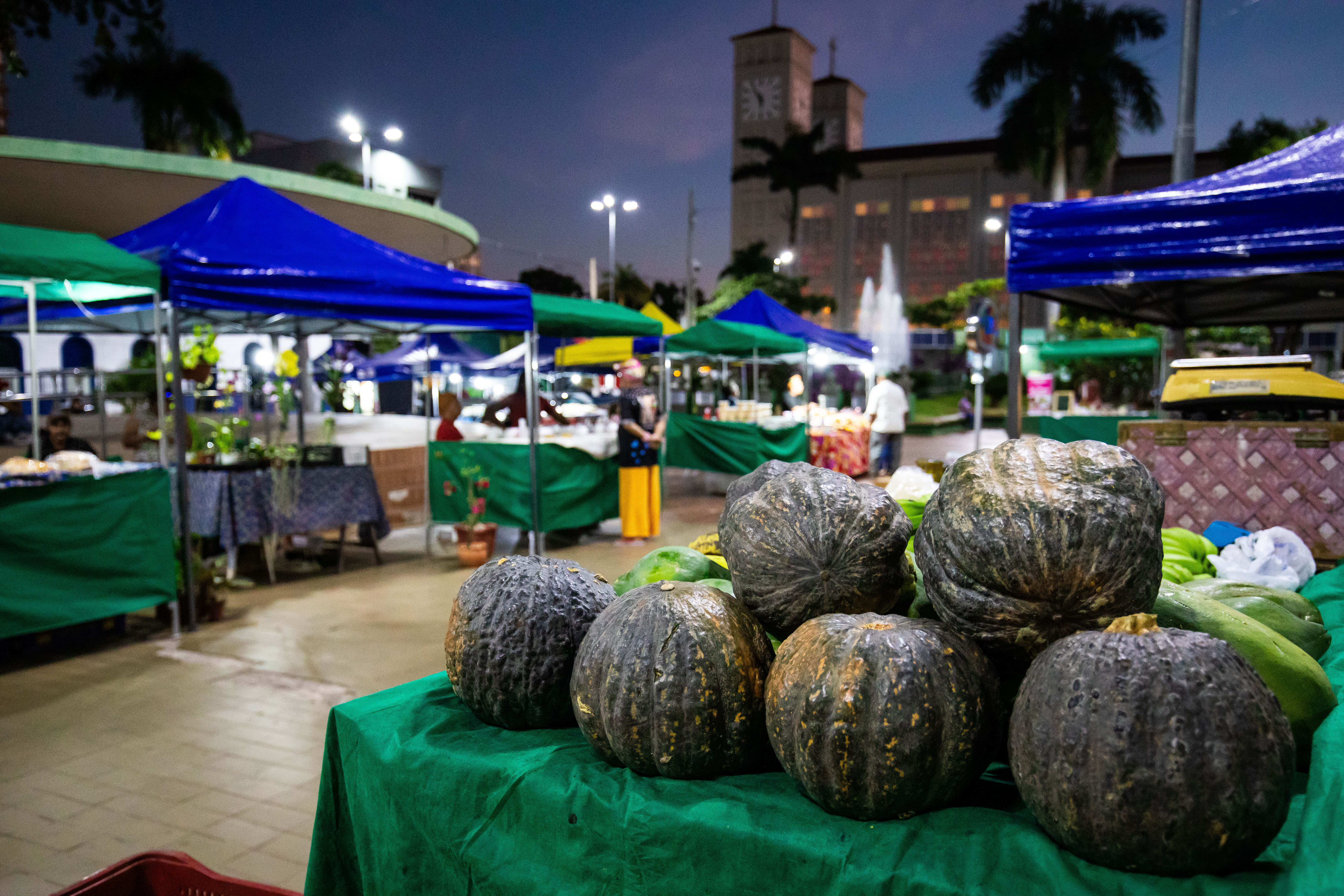 A foto mostra o ambiente da Feira da Agricultura Familiar, com barraca de abóboras em destaque. Ao fundo da imagem, a Igreja Matriz compõe o cenário, já demonstrando a chegada do anoitecer daquele dia.