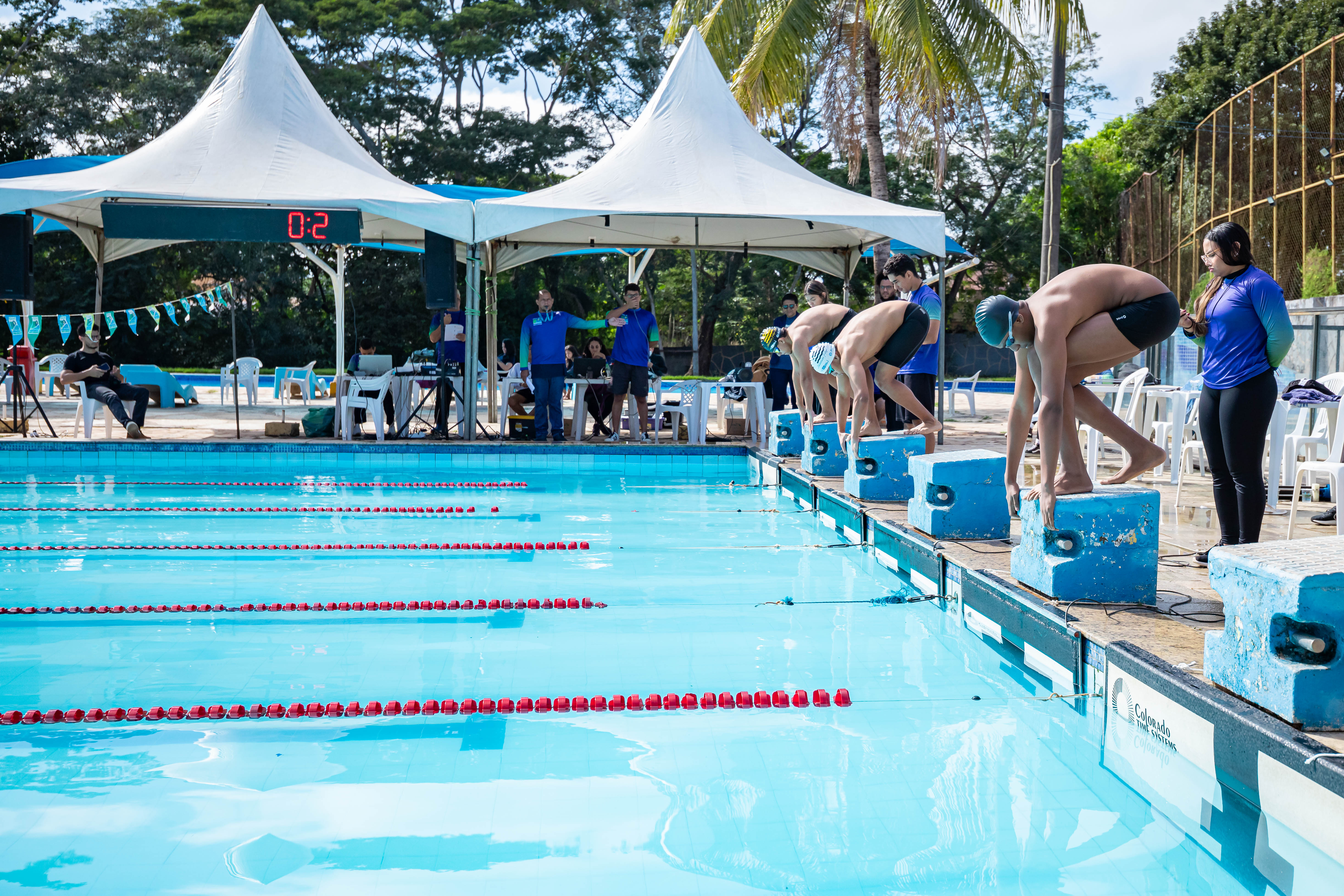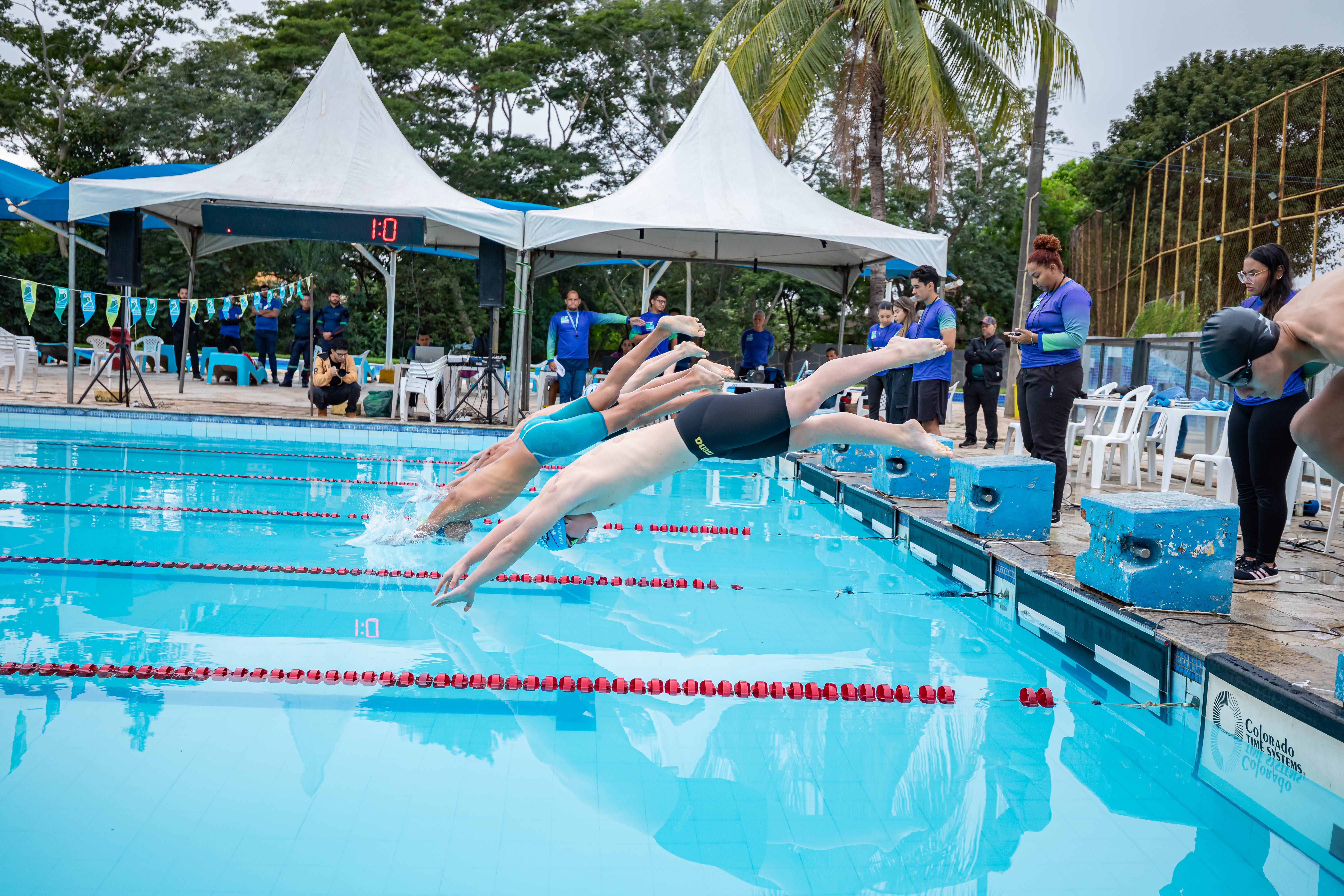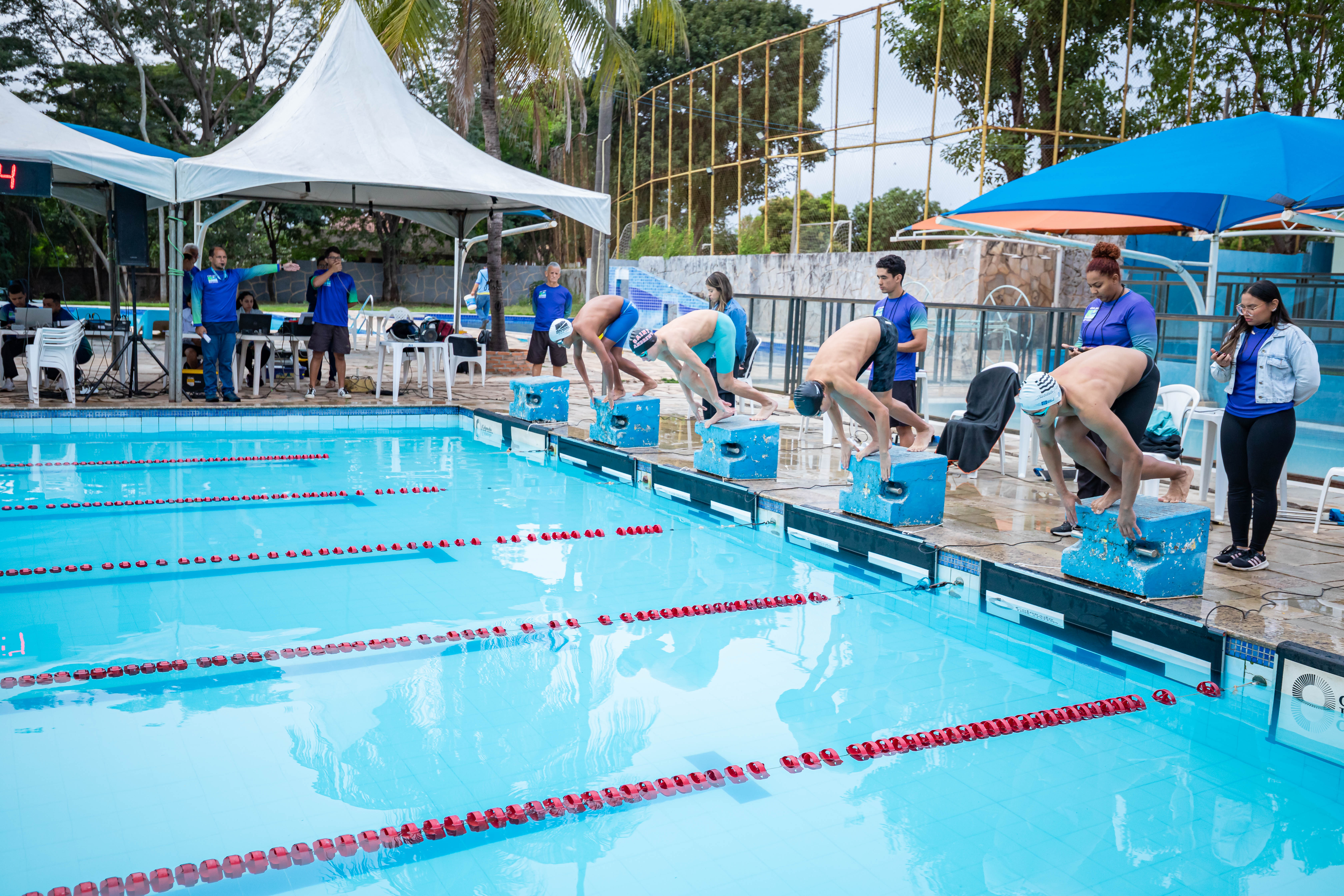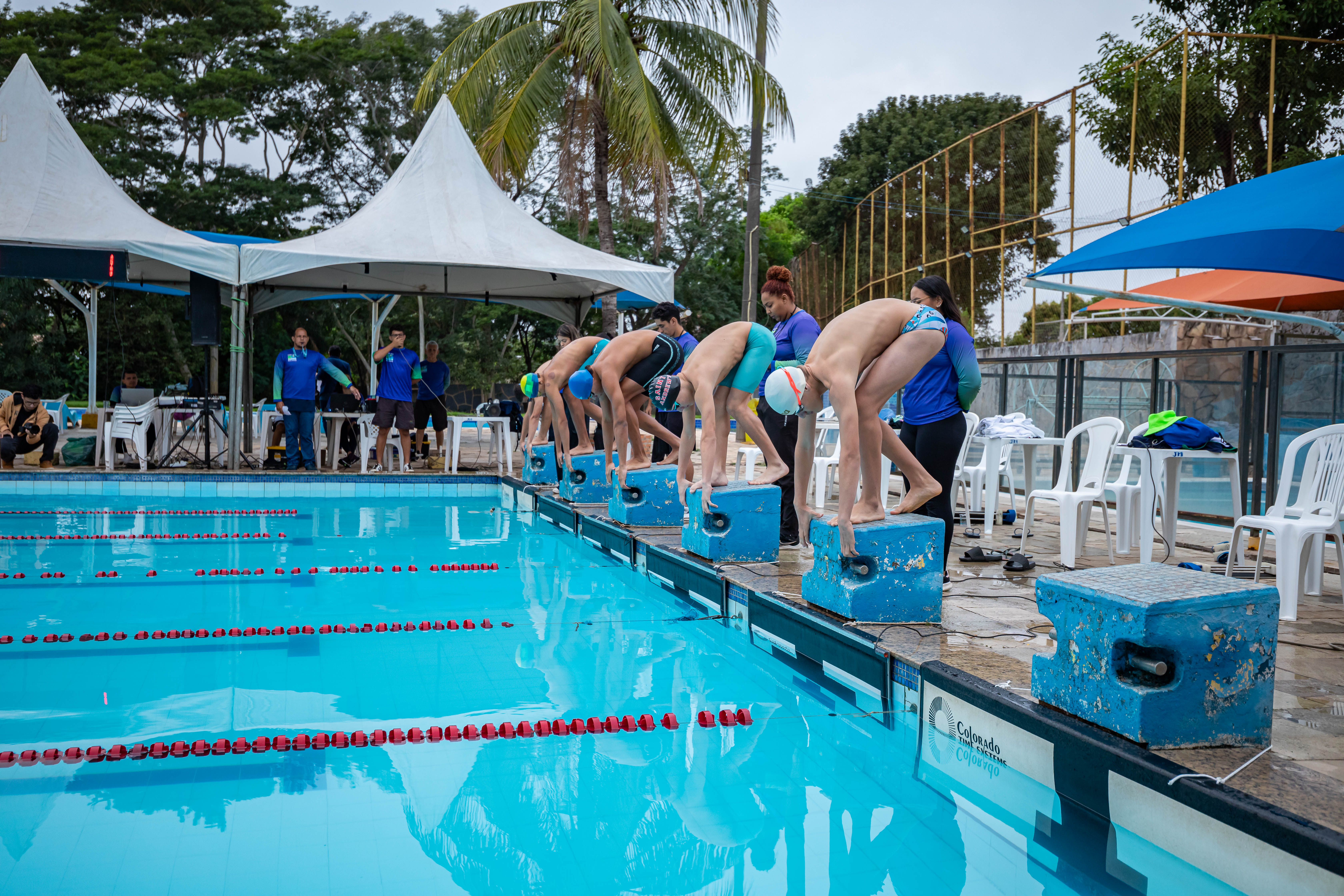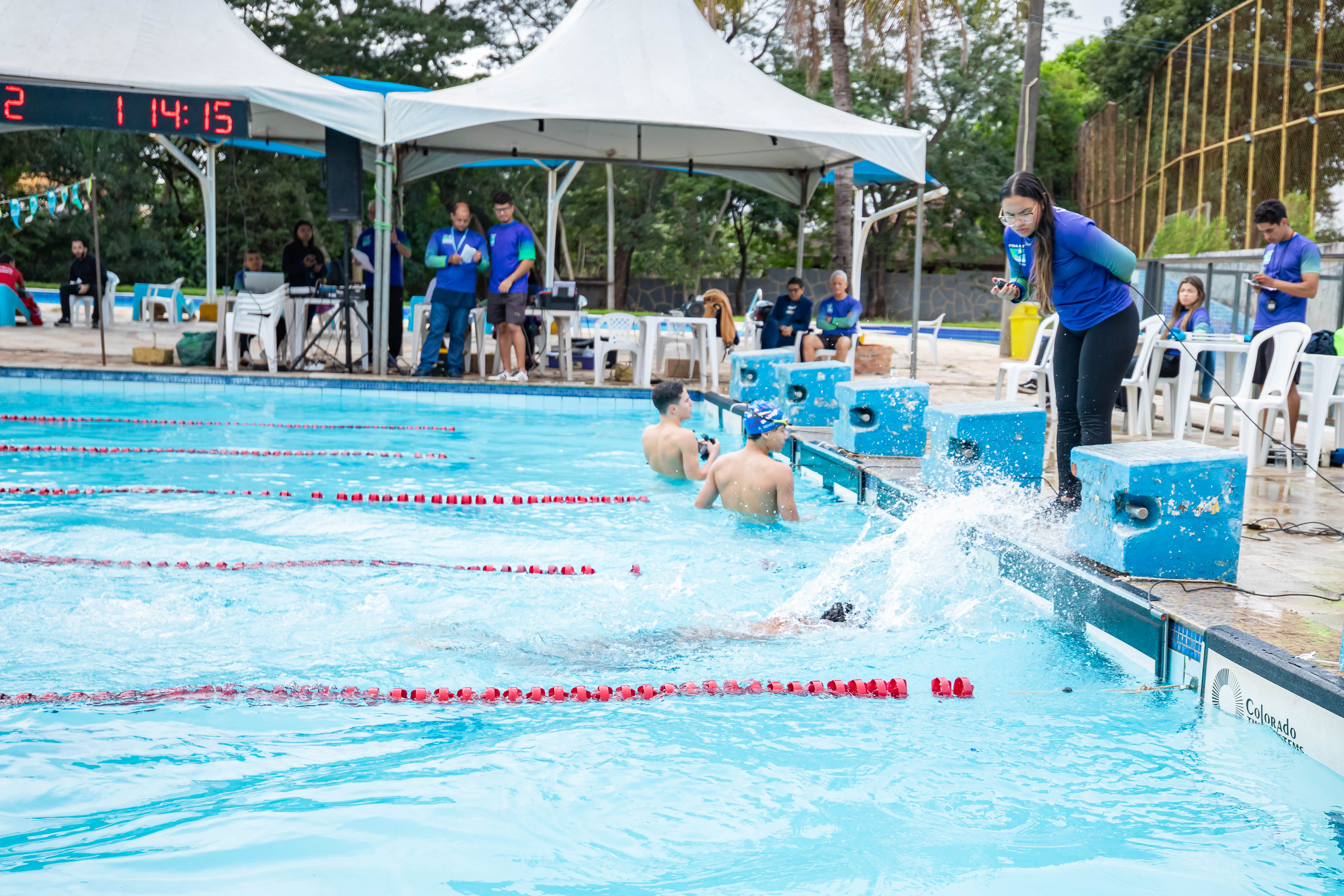 Imagem o momento da prova da categoria A – Masculino - durante os Jogos Estudantis Cuiabanos na piscina olímpicas da Associação Atlética Banco do Brasil (AABB)