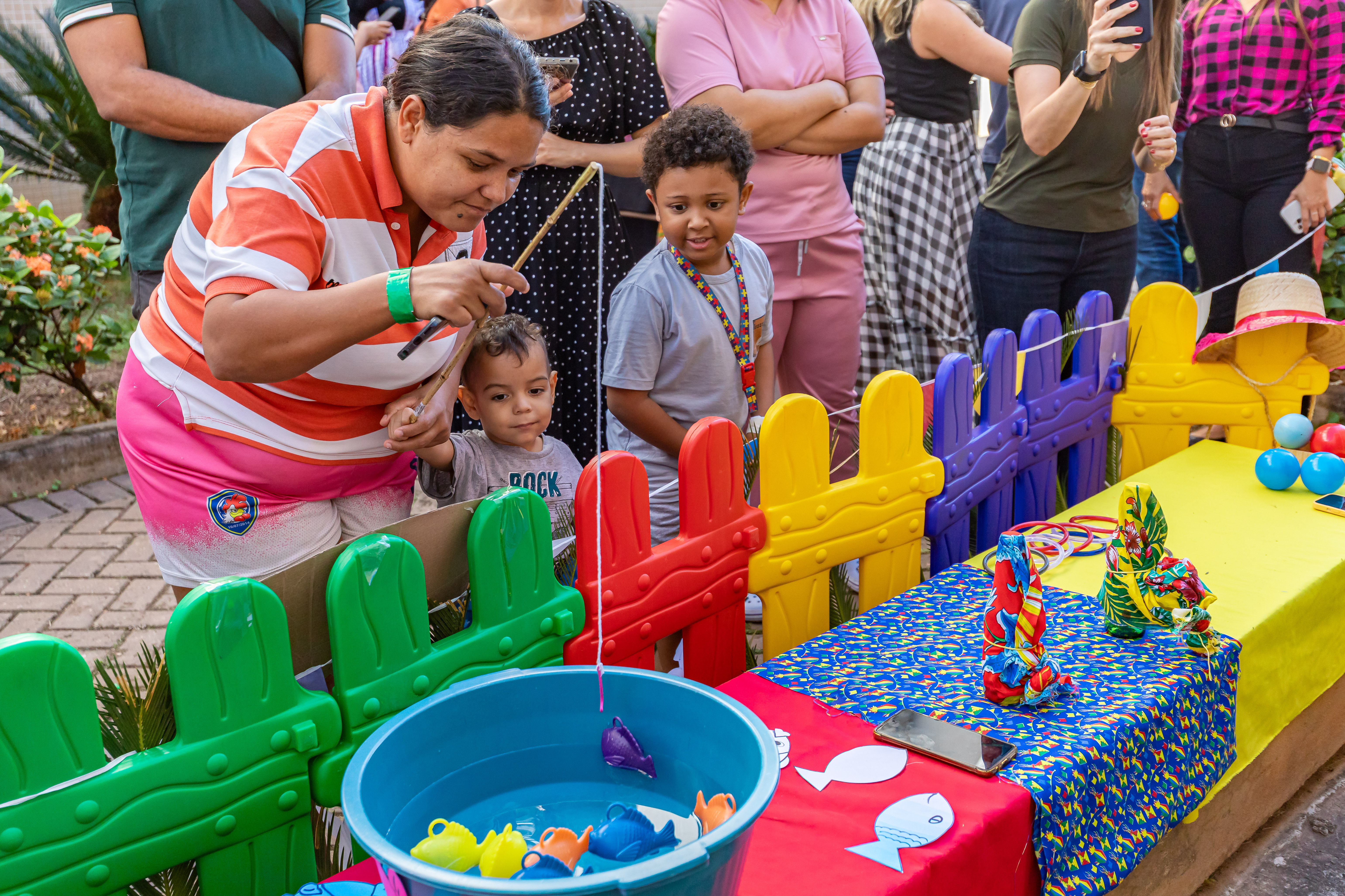 Além das guloseimas, presentes e muitos brinquedos, a festa contou com comidas típicas como bolos, pipoca, algodão-doce, cural, maria-isabel, cachorro-quente, refrigerante, diversos doces, canjicas e até a tradicional pescaria, onde as crianças podiam “pescar” brinquedos doados pelos próprios servidores do hospital. Para as crianças que não puderam descer até o local da festa, as lembrancinhas foram entregues diretamente em seus leitos, garantindo que todas pudessem participar da comemoração e saborear as delícias.
