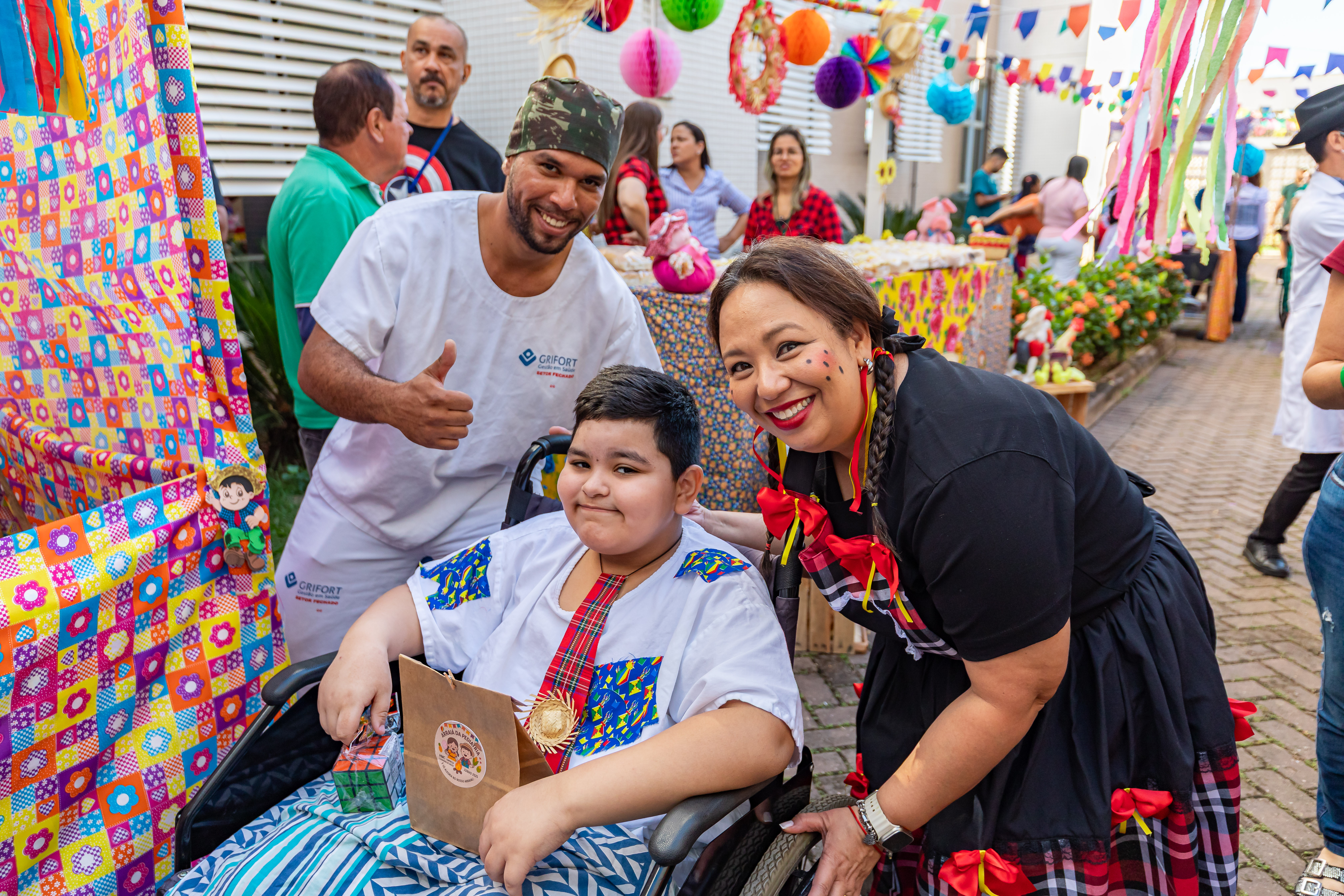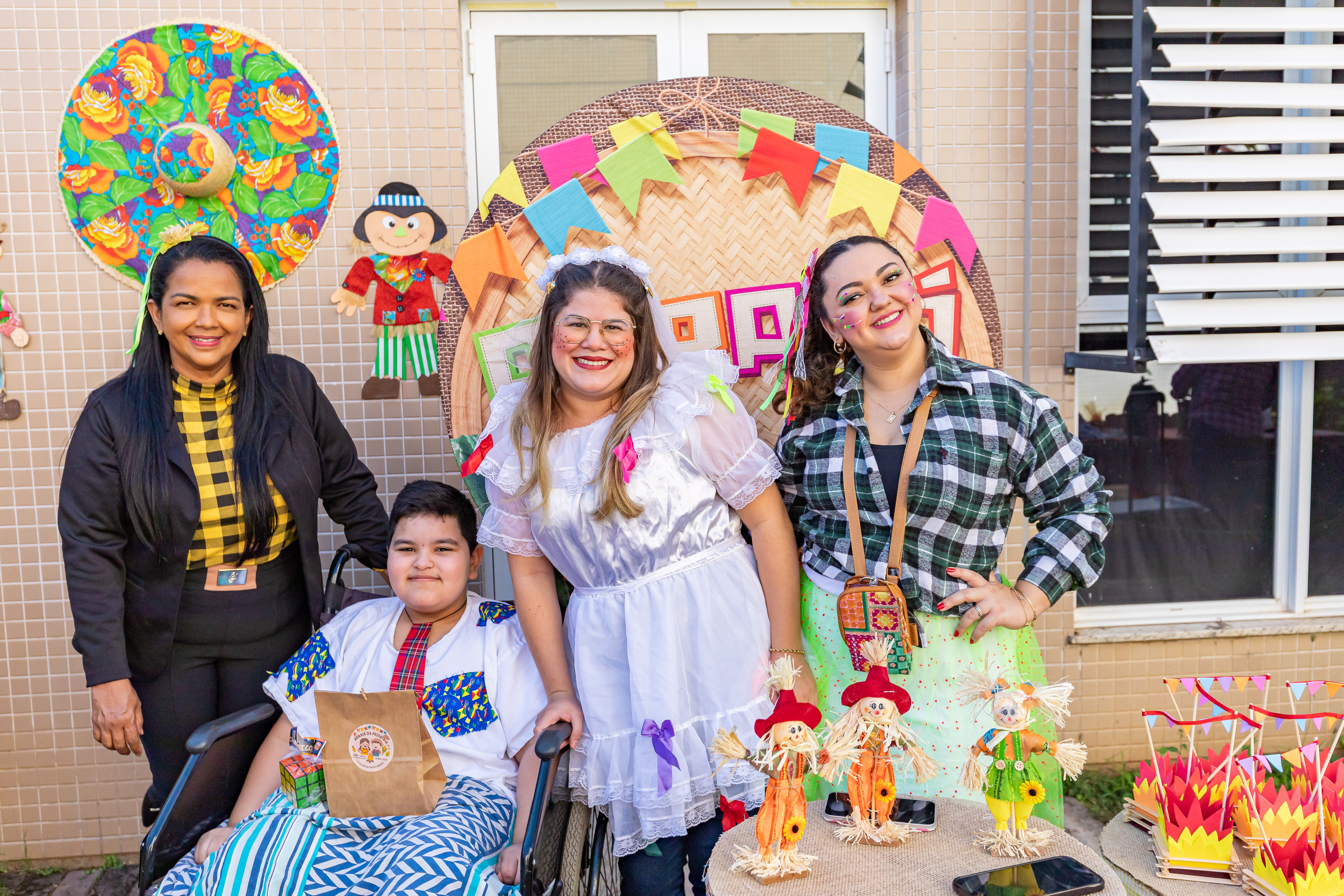 A imagem mostra três mulheres e uma criança que está em uma cadeira de rodas. Todos usam trajes típicos de festa junina. A foto é bem colorida, tanto pelo local quanto pelas roupas que os personagens nela usam.