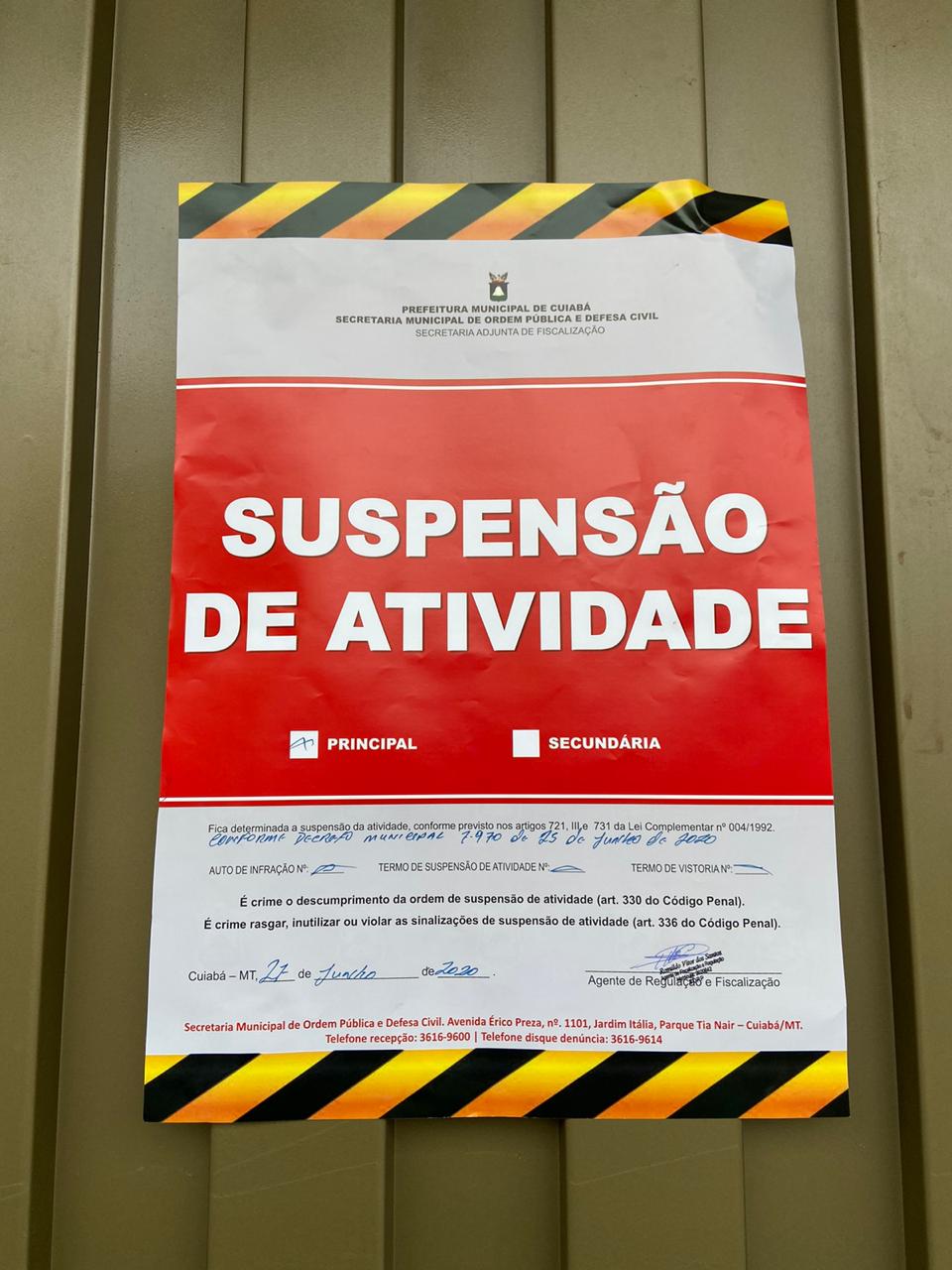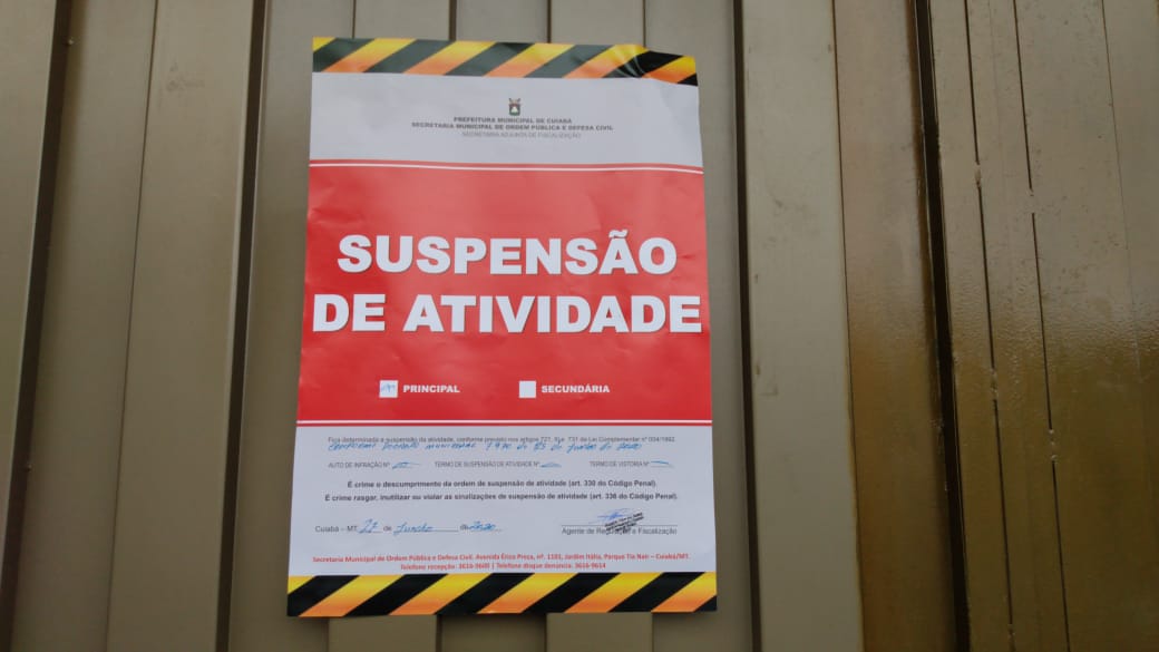 Fiscais da Secretaria de Ordem Pública iniciaram, na manhã deste sábado (27), uma operação para identificar, por meio de cartazes oficiais com os dizeres “Suspensão de Atividade”, as fachadas dos estabelecimentos não autorizados a funcionar em Cuiabá, conforme o Decreto nº 7.956/2020. A ação começou pela região central, onde a maioria dos estabelecimentos já estava fechada.