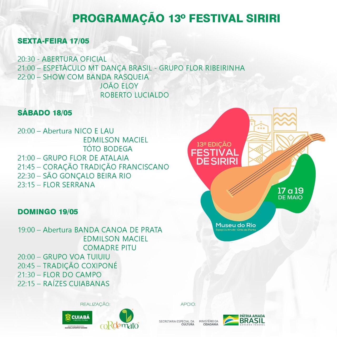 O tradicional Festival acontecerá por determinação do prefeito Emanuel Pinheiro, durante três dias do mês de maio - 17, 18 e 19 -, no Espaço Liu Arruda, no Museu do Rio. Os participantes são: Flor Ribeirinha, Flor do Campo, Flor do Atalaia, Flor do Cerrado, Raízes Cuiabanas, Coração Franciscano, Voa Tuiuiú e São Gonçalo Beira Rio.