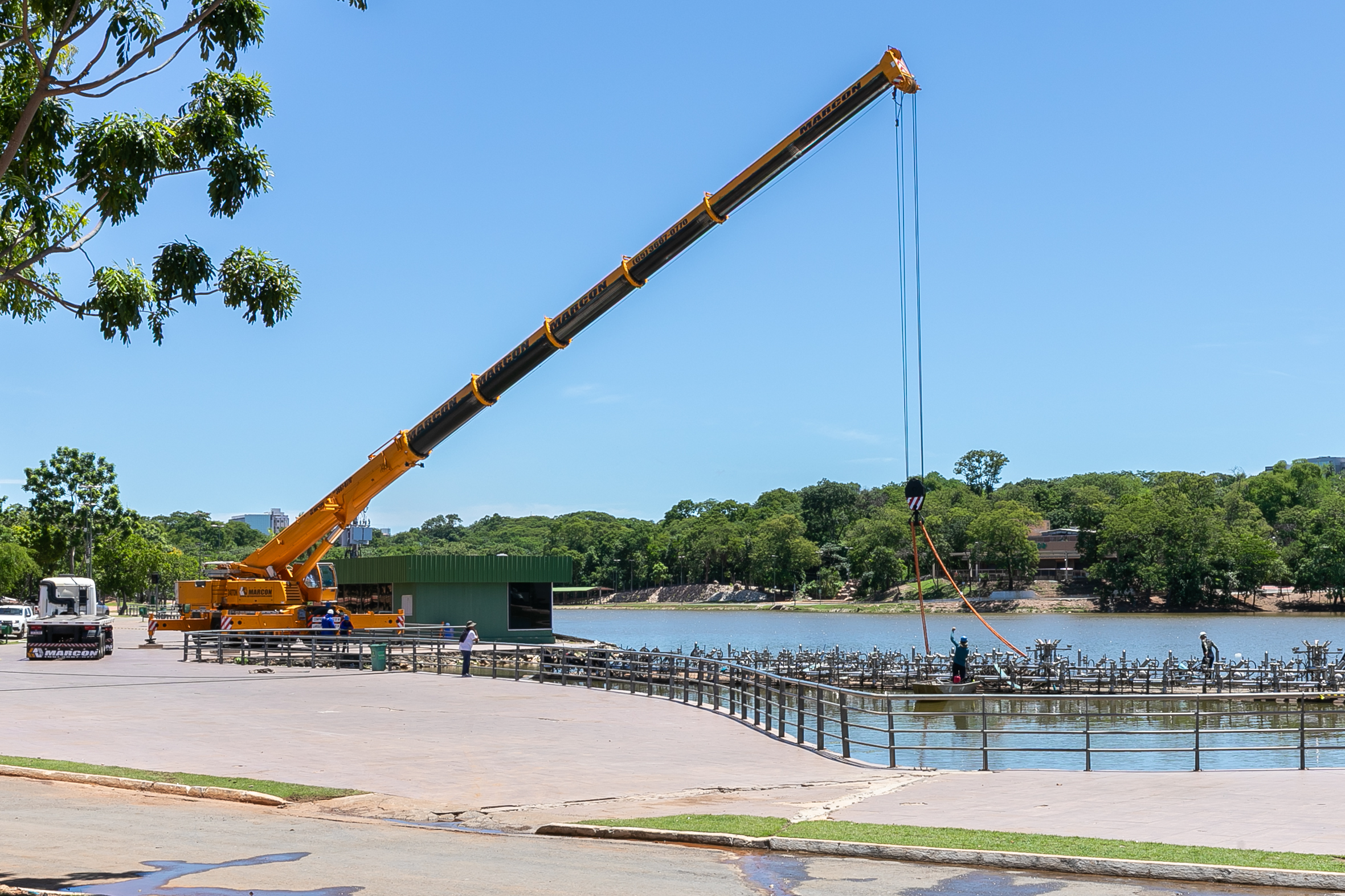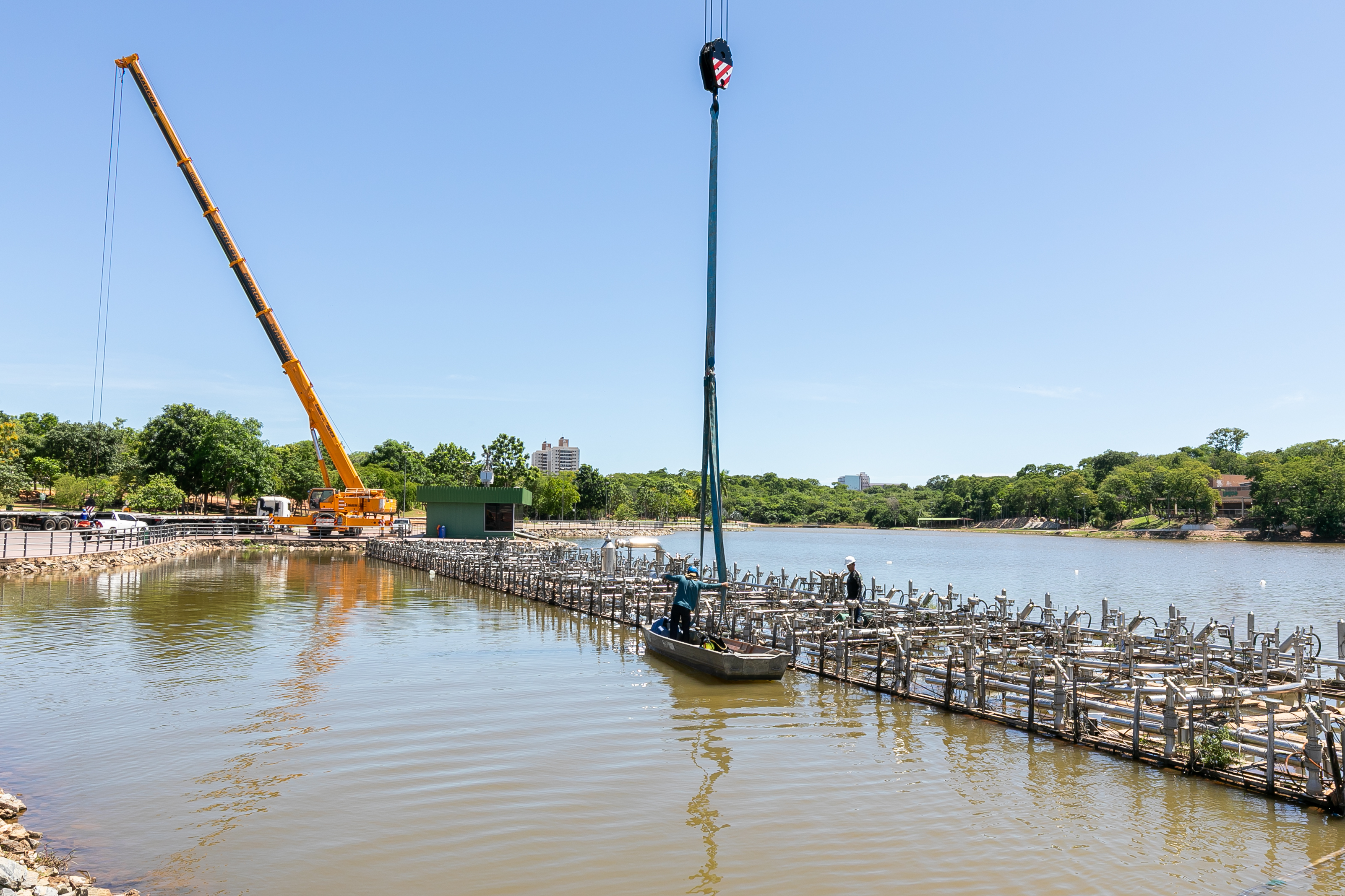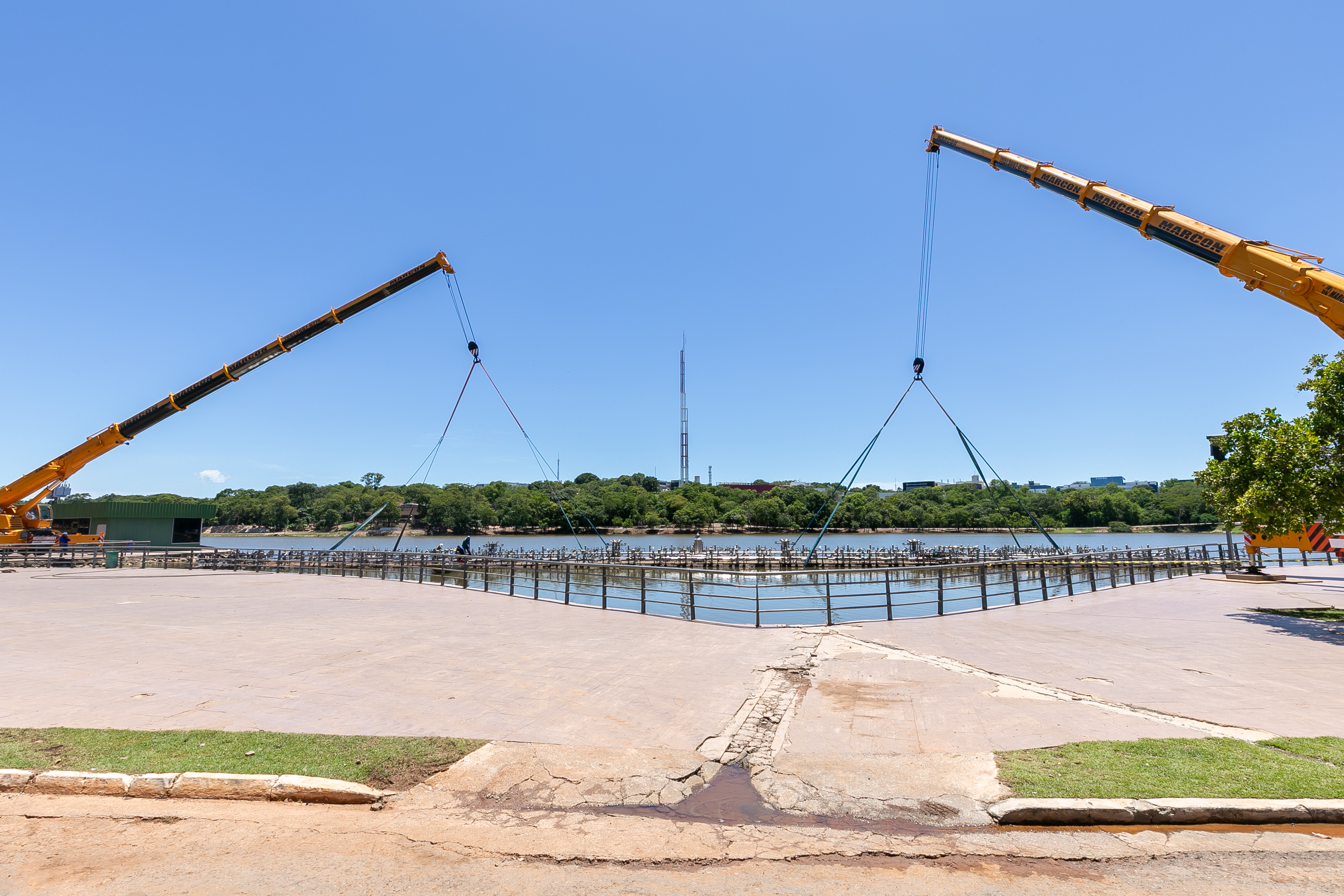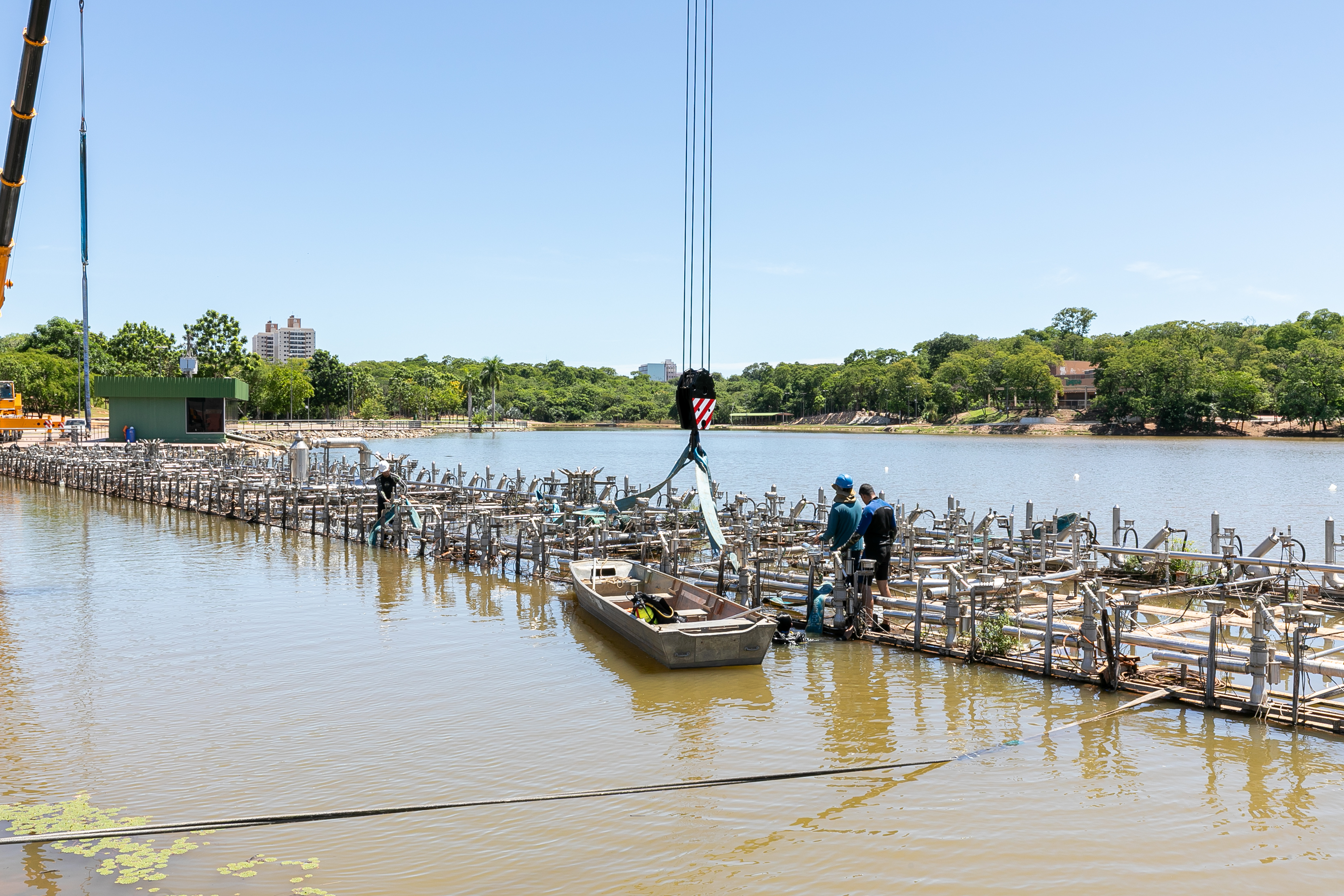 A balsa permanecerá no próprio Parque das Águas, posicionada sobre o calçamento, onde será isolada com tapumes para a execução dos serviços. A escolha do local permite agilidade na obra e não compromete o cronograma estabelecido.
