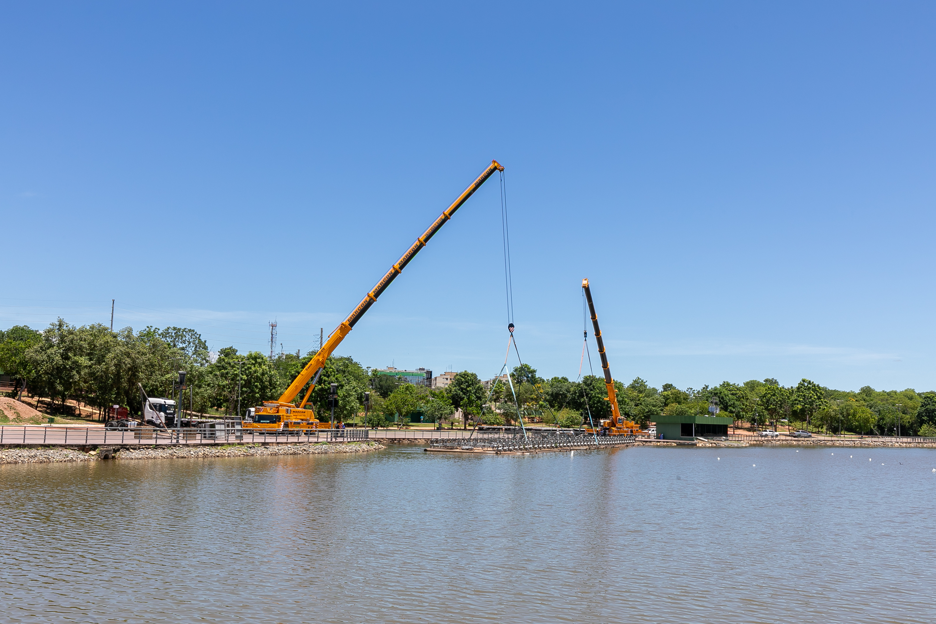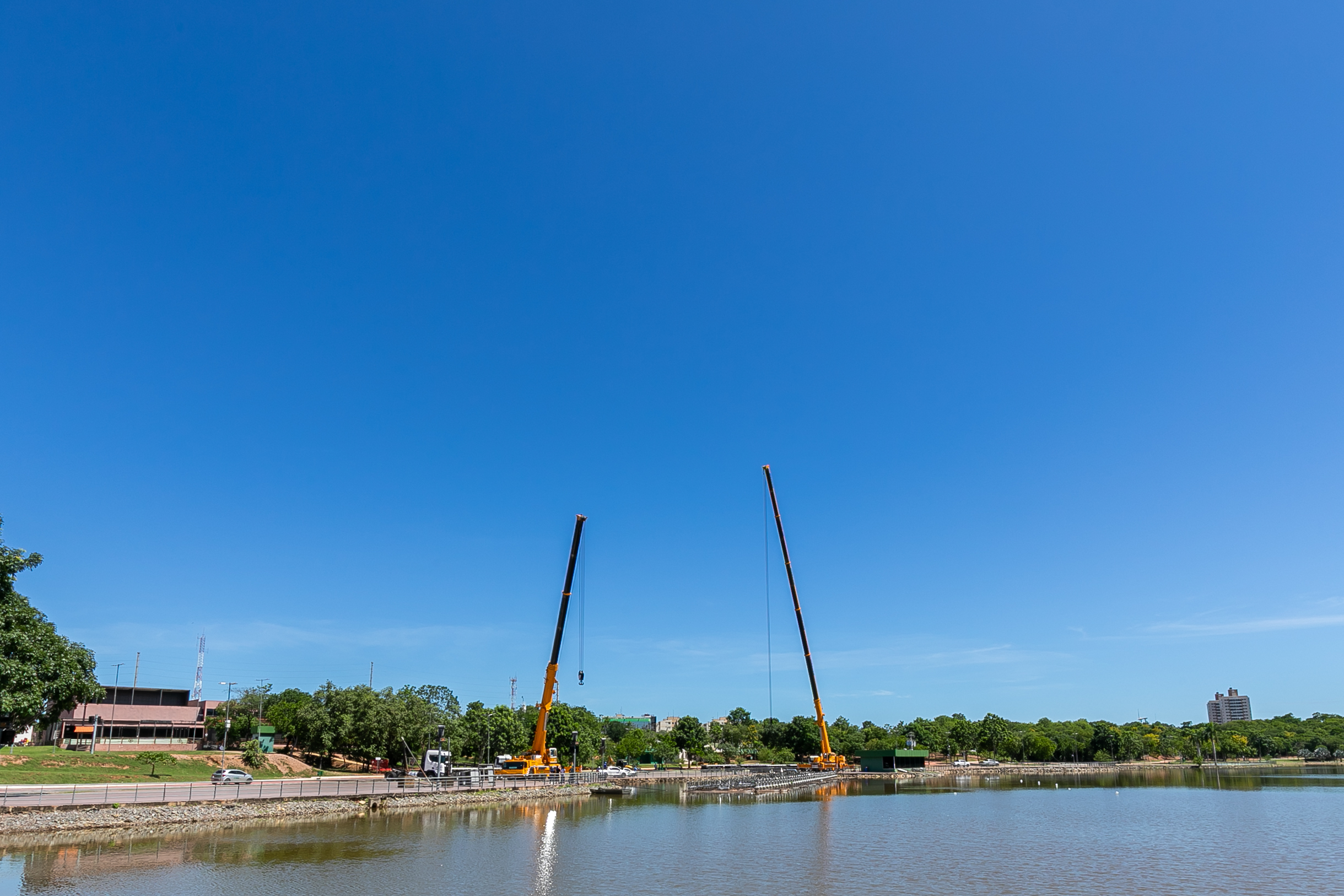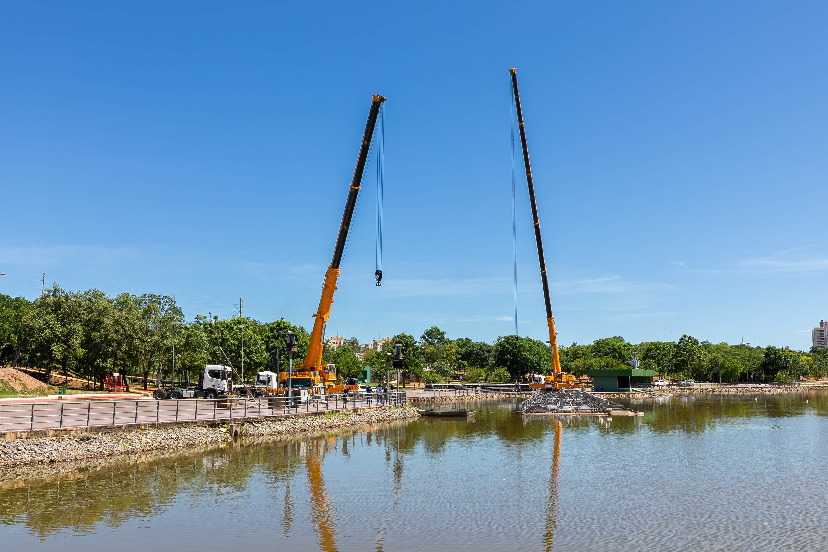 A balsa permanecerá no próprio Parque das Águas, posicionada sobre o calçamento, onde será isolada com tapumes para a execução dos serviços. A escolha do local permite agilidade na obra e não compromete o cronograma estabelecido.