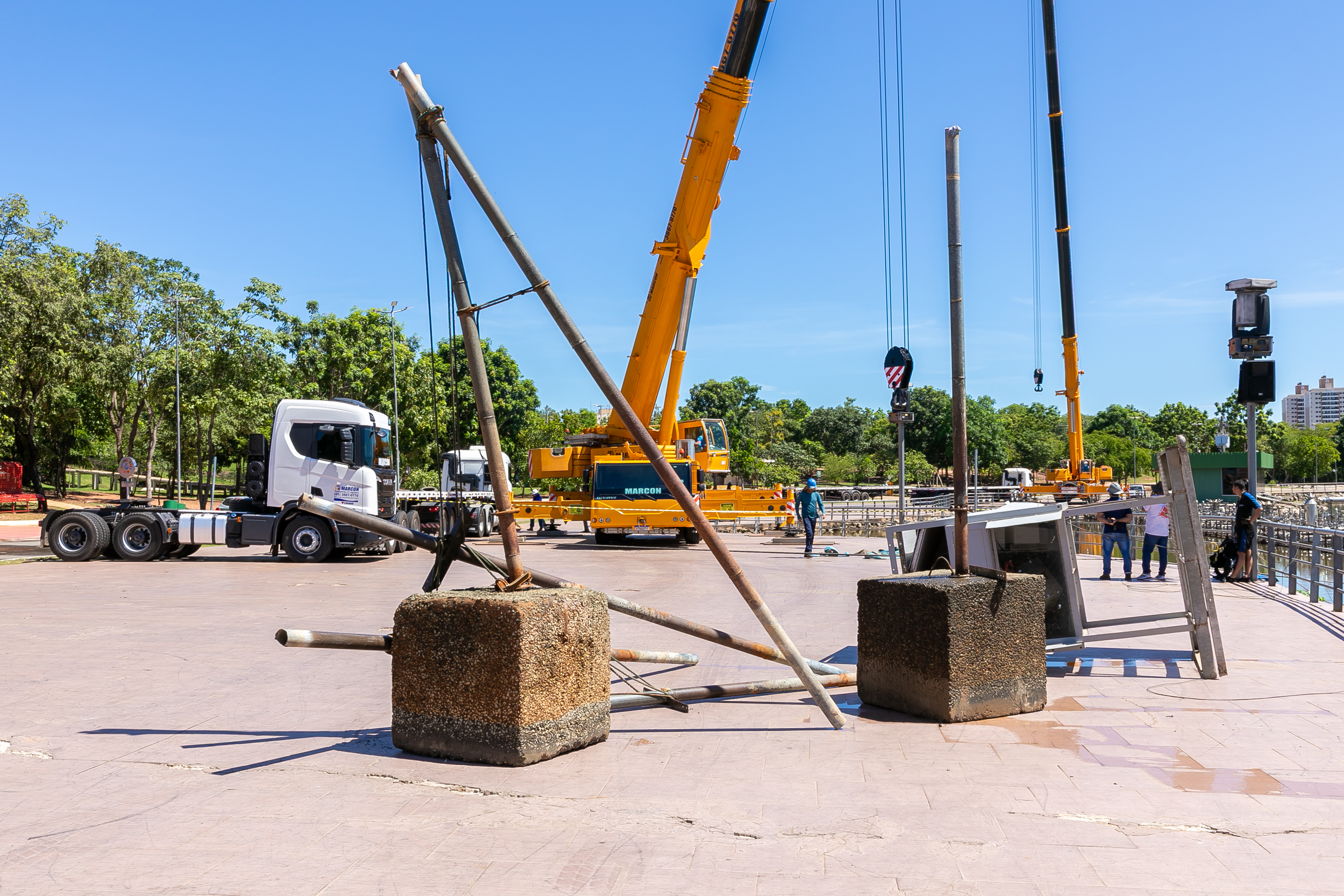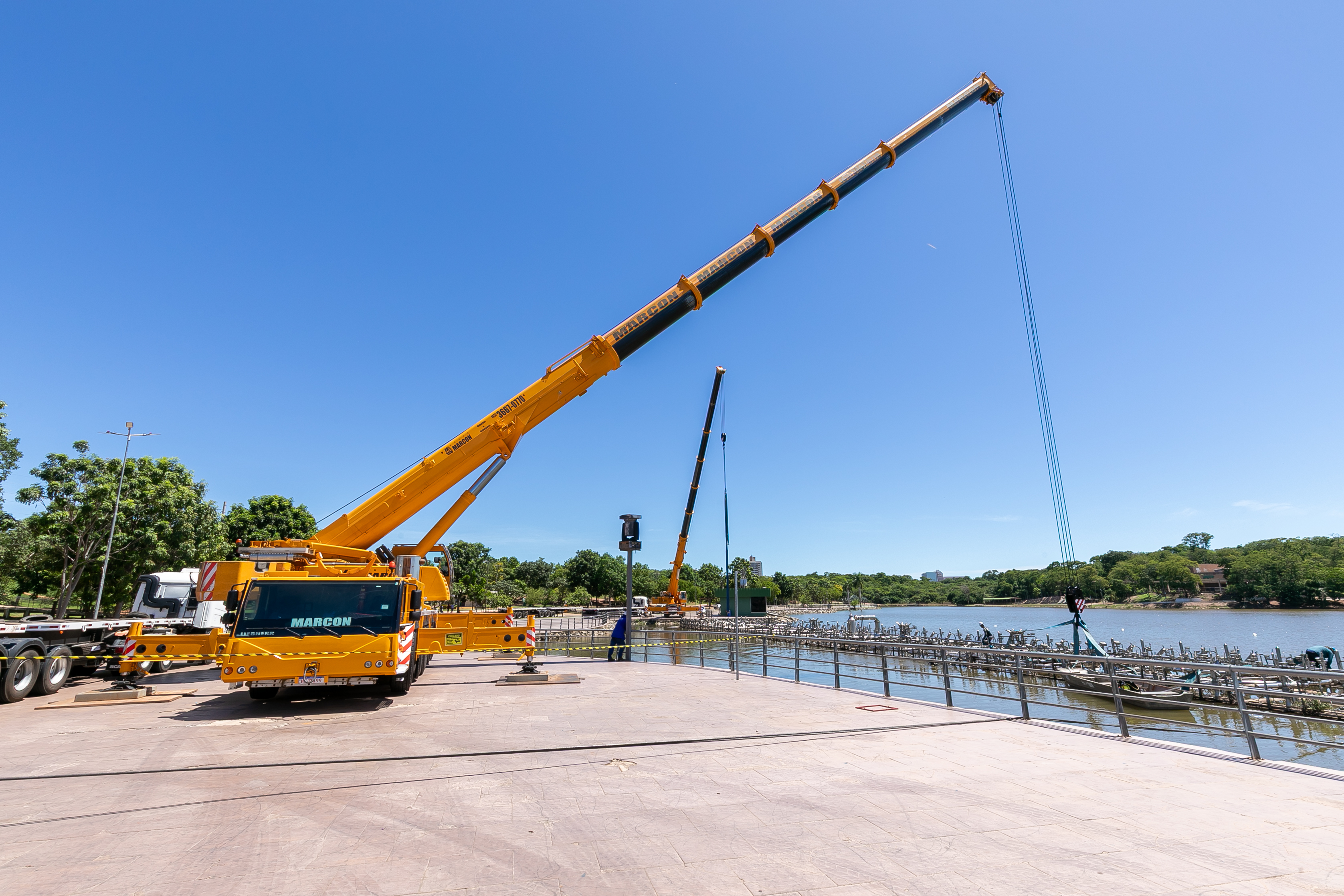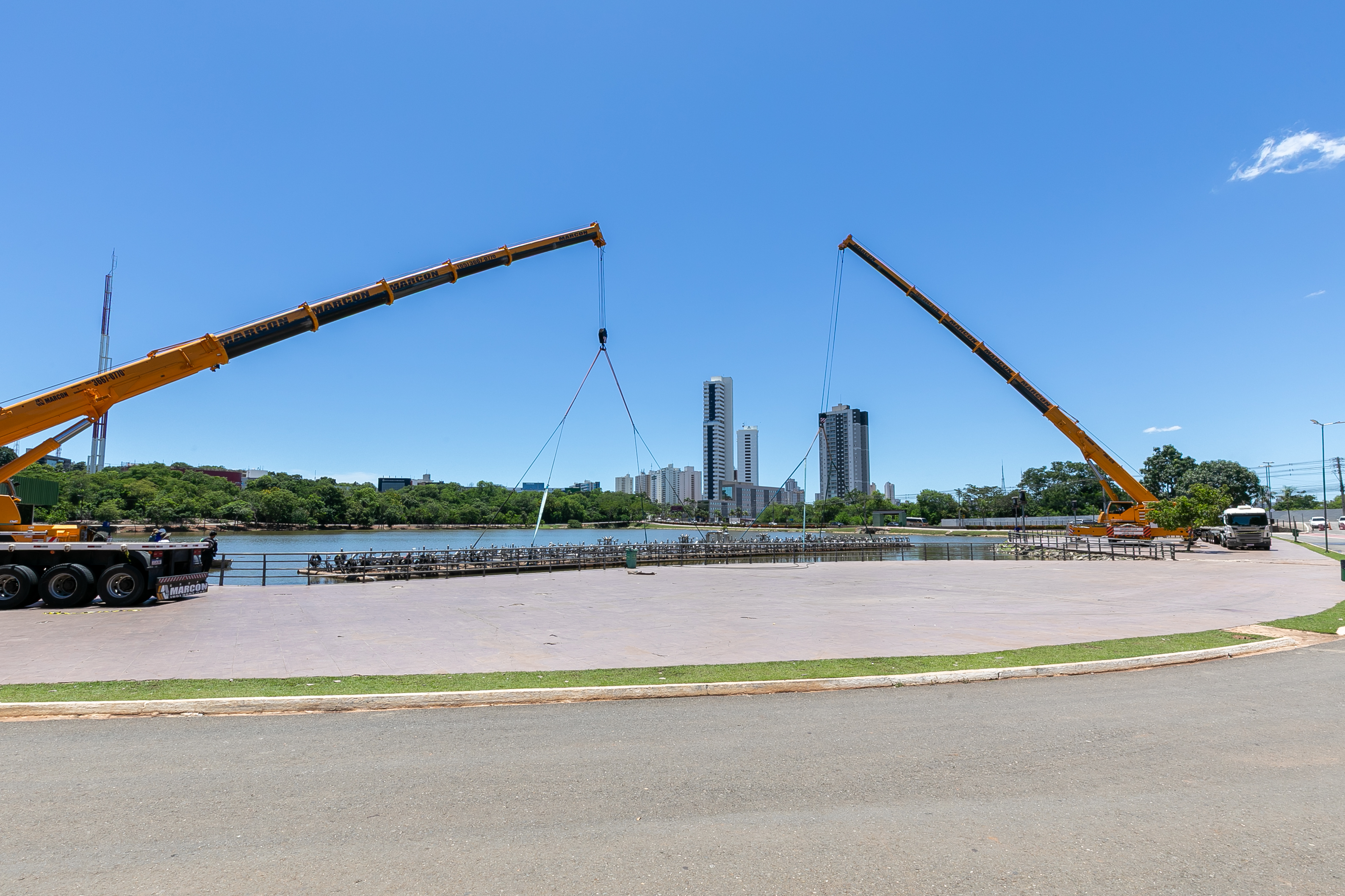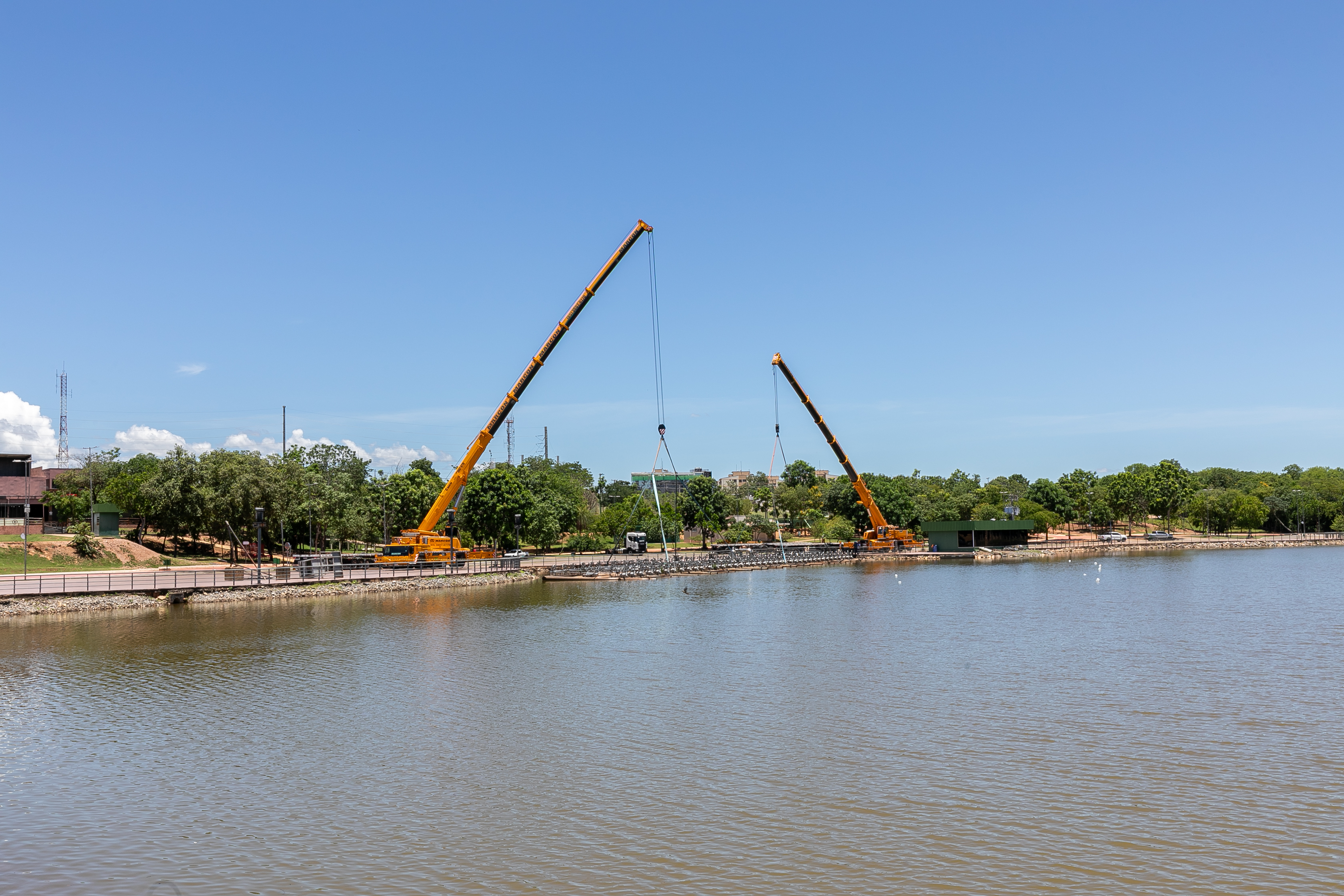 A balsa permanecerá no próprio Parque das Águas, posicionada sobre o calçamento, onde será isolada com tapumes para a execução dos serviços. A escolha do local permite agilidade na obra e não compromete o cronograma estabelecido.