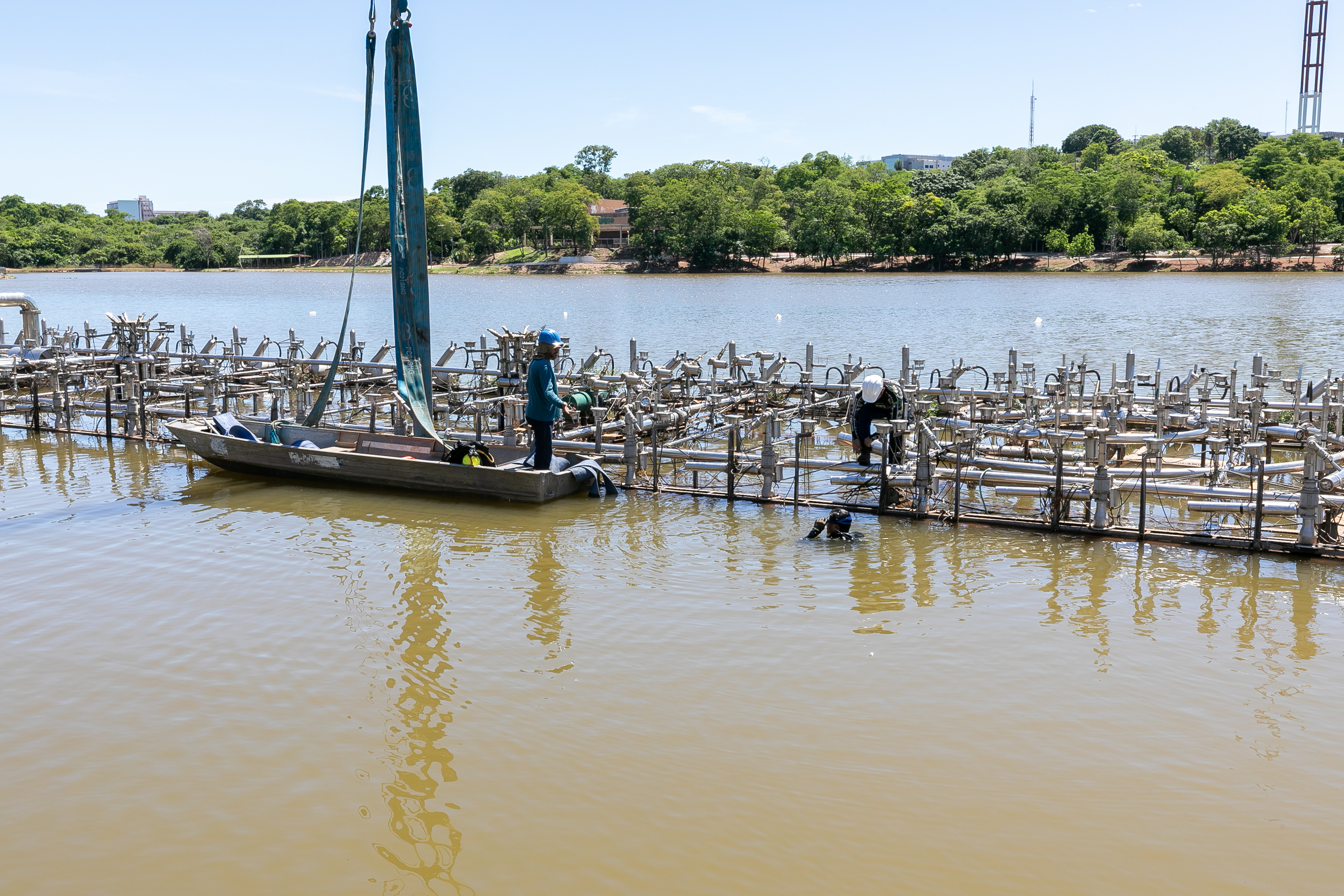 A Prefeitura de Cuiabá, por meio da Empresa Cuiabana de Zeladoria e Serviços Urbanos (Limpurb), iniciou nesta quinta-feira (15) os reparos estruturais da balsa hídrica responsável pelo Show das Águas, instalada na Lagoa Paiaguás, no Parque das Águas, na região do Centro Político Administrativo.