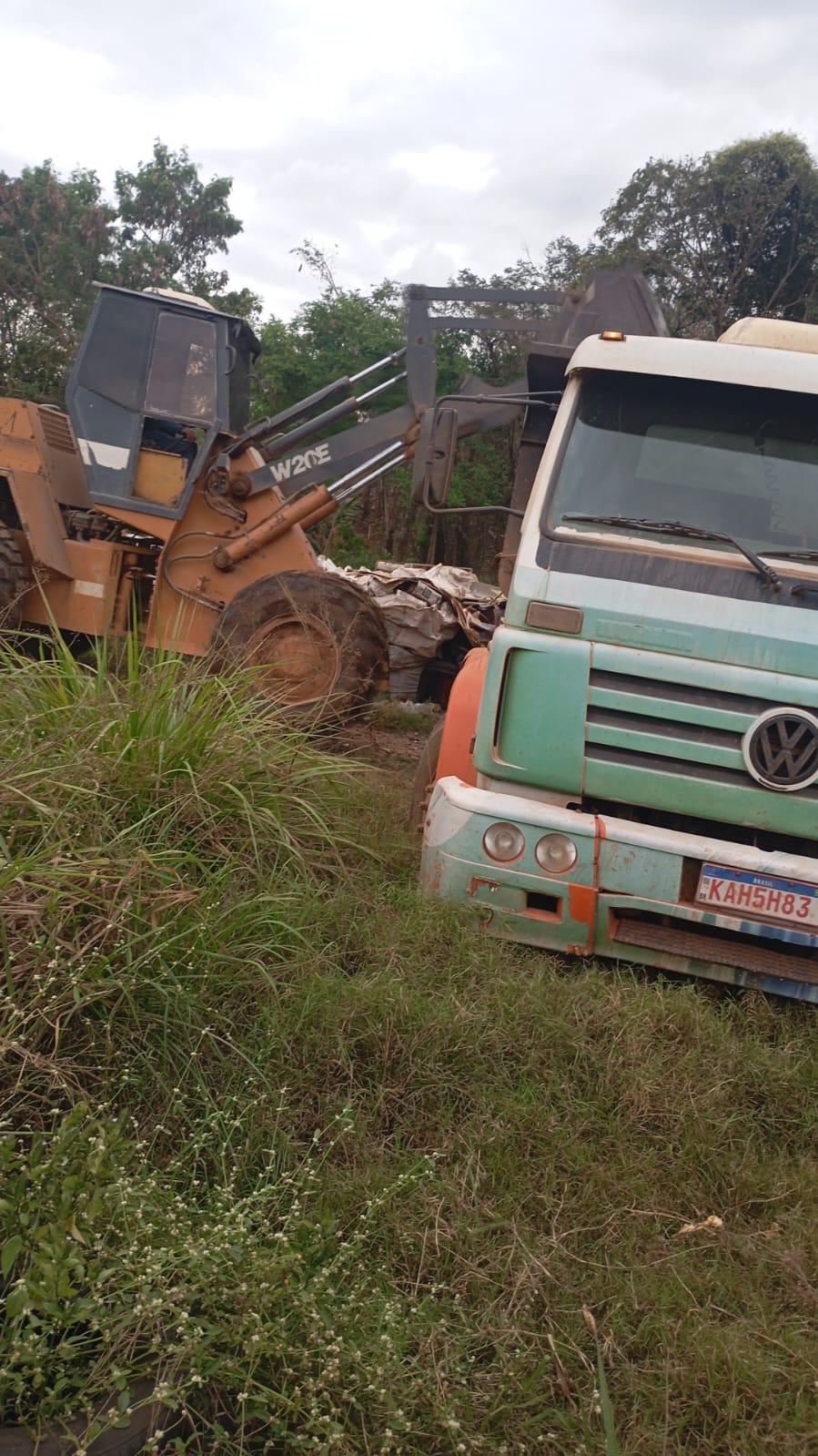 A imagem mostra um bolsão de lixo. Ao fundo, uma pá carregadeira juntamente com um caminhão-caçamba, executam os serviços de recolhimento do material irregular.