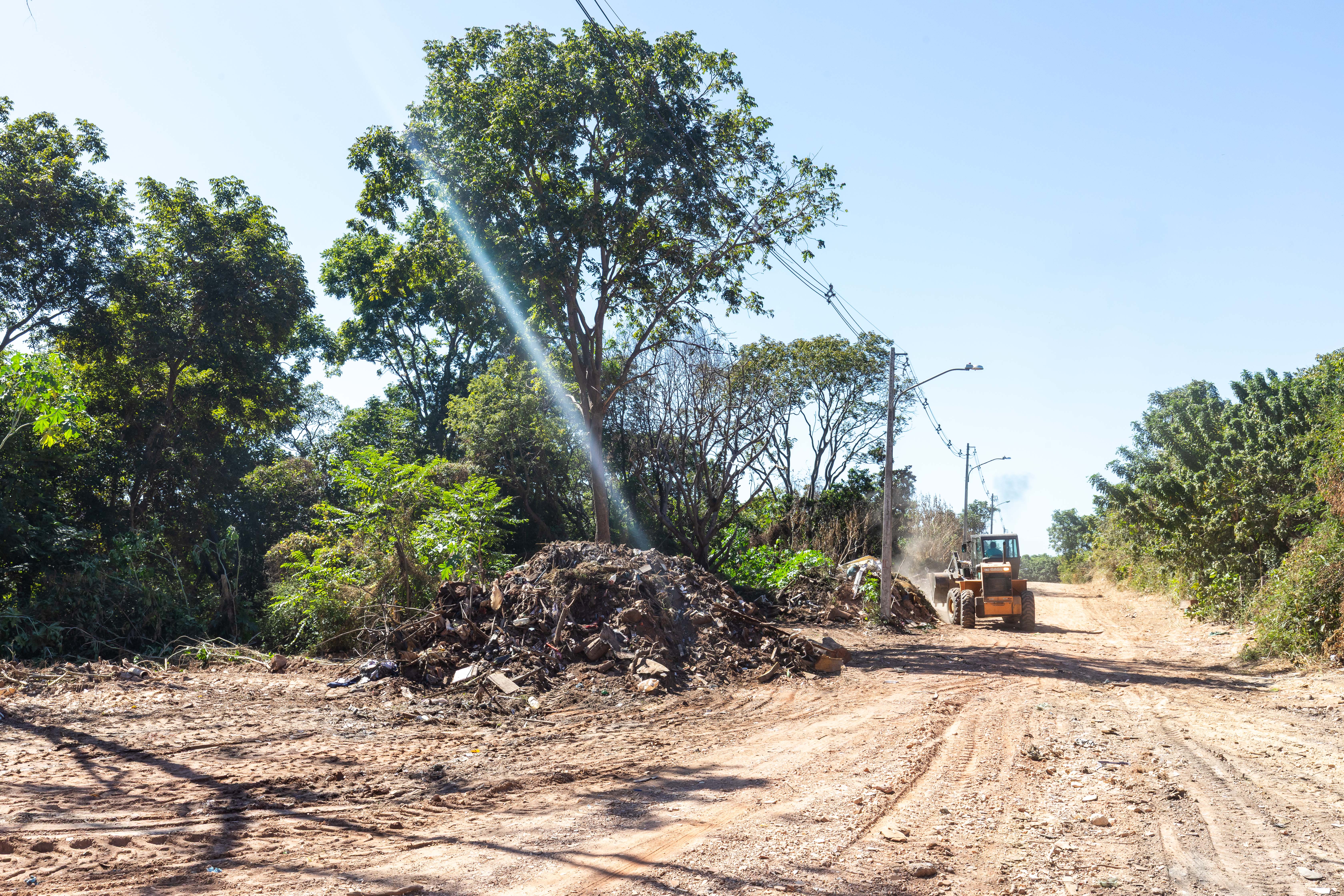 A imagem mostra um bolsão de lixo no bairro Morada do Ouro II. Ao fundo, uma pá carregadeira juntamente com um caminhão-caçamba, executam os serviços de recolhimento do material irregular.
