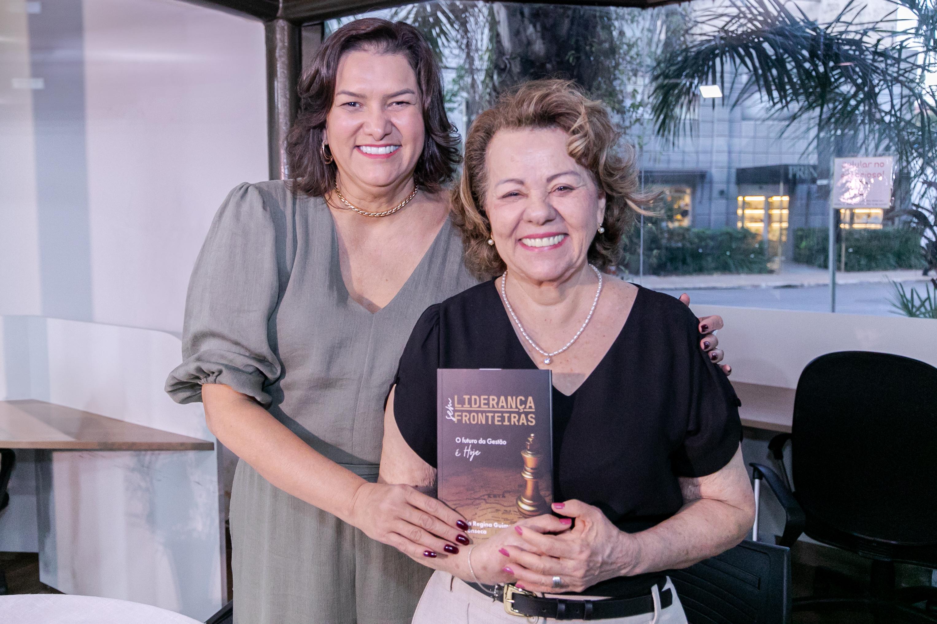 A foto ilustra a autora do livro, Sônia Regina Guimarães da Fonseca, vestida com roupa cinza. Ao lado, está a professora aposentada Creuza Guimarães, que usa vestido branco. Ambas estão sorrindo e exibindo o livro "Liderança sem Fronteiras – O futuro da Gestão é Hoje"