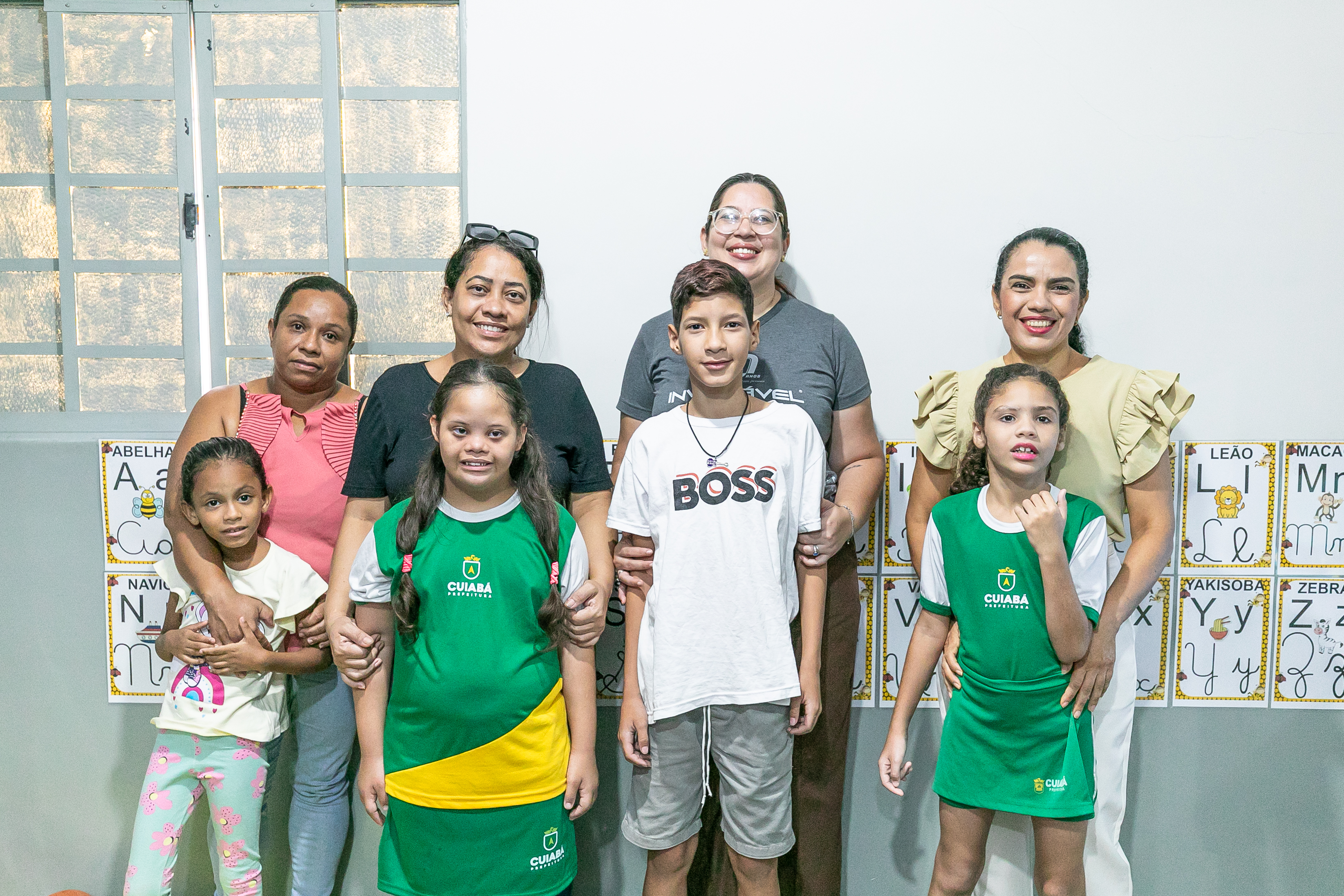 A foto ilustra quatro mulheres em pé, com seus respectivos filhos, também em pé, numa postura de abraço. O ambiente é uma sala multifuncional. Duas crianças estão trajadas com uniforme escolar. Outras duas com camisa branca e calça jeans.
