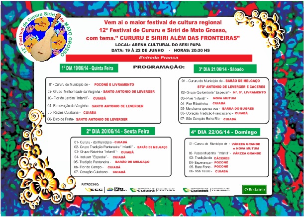 A realização da 12° do Festival de Cururu e Siriri é uma parceria da Prefeitura de Cuiabá com a Federação Mato-grossense das Associações e Grupos de Cururu e Siriri e Secretaria do Estado de Cultura.