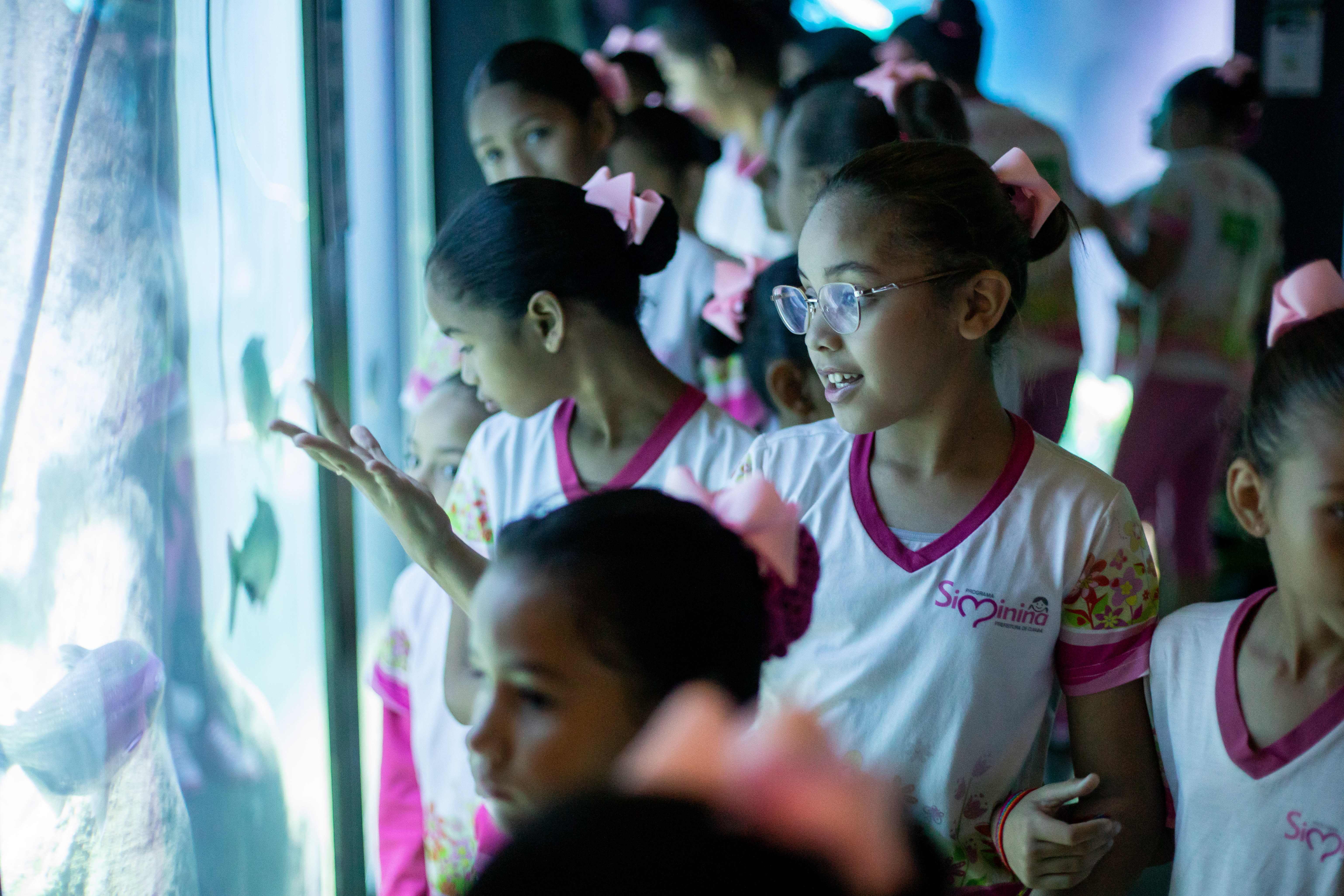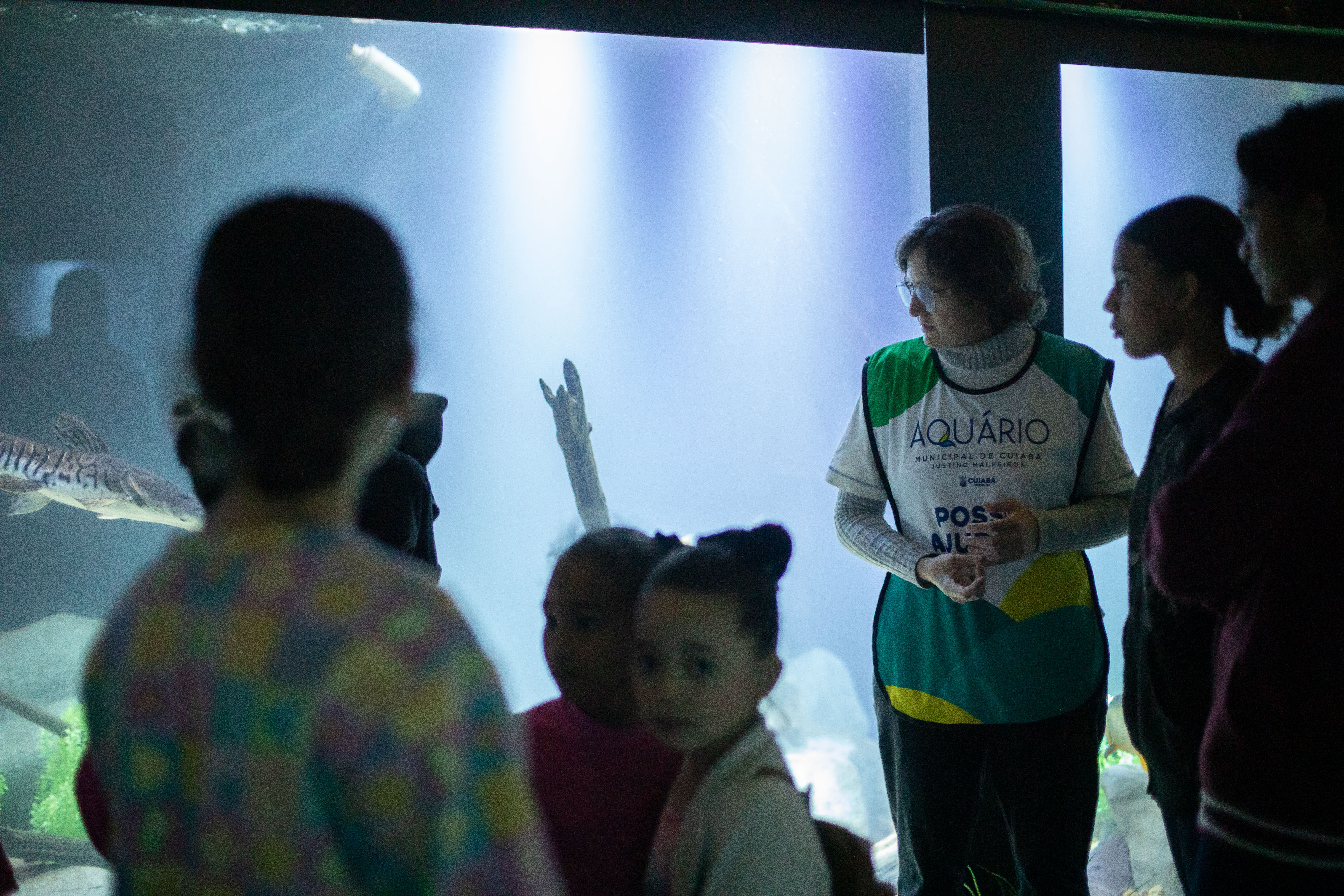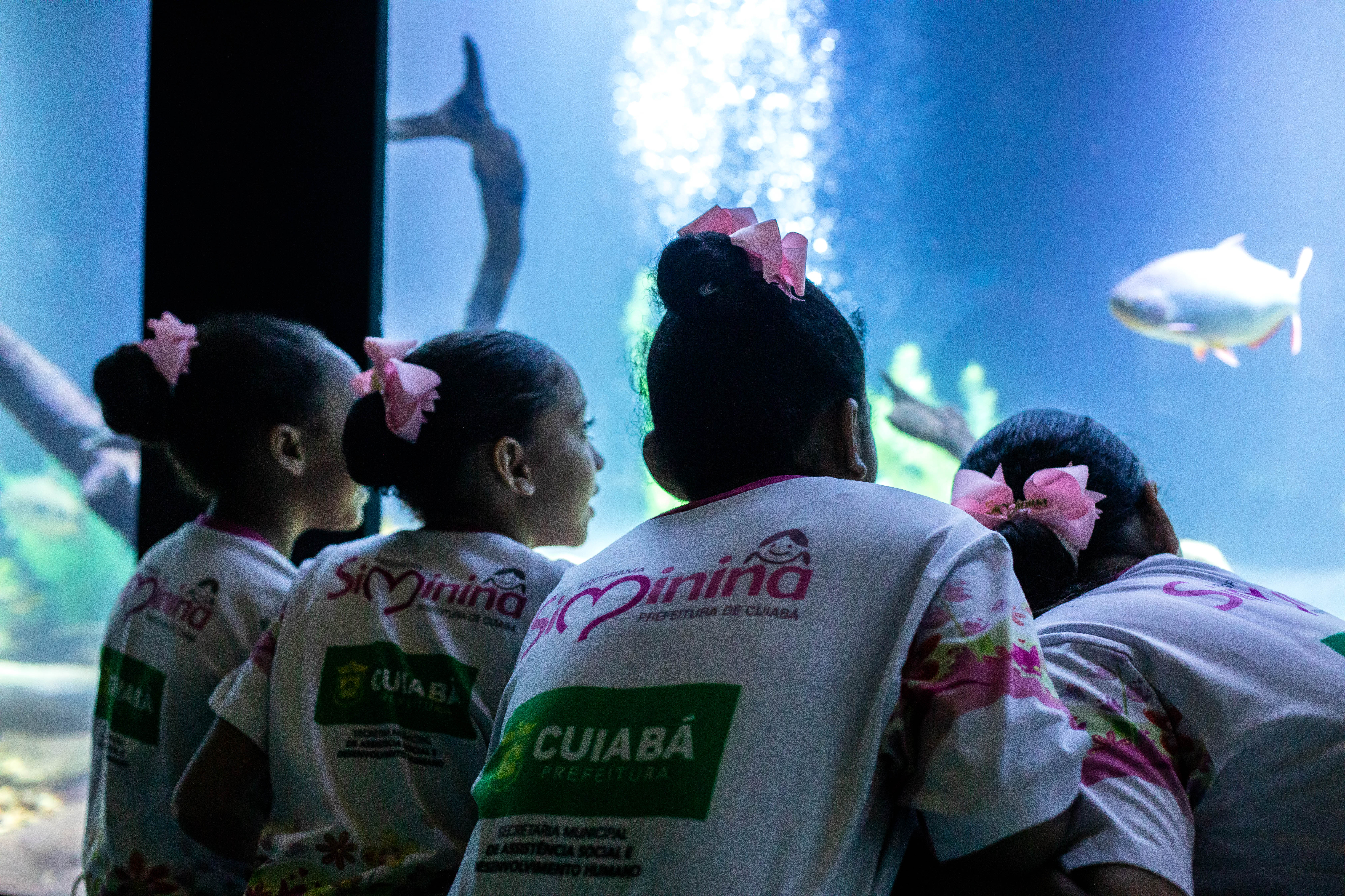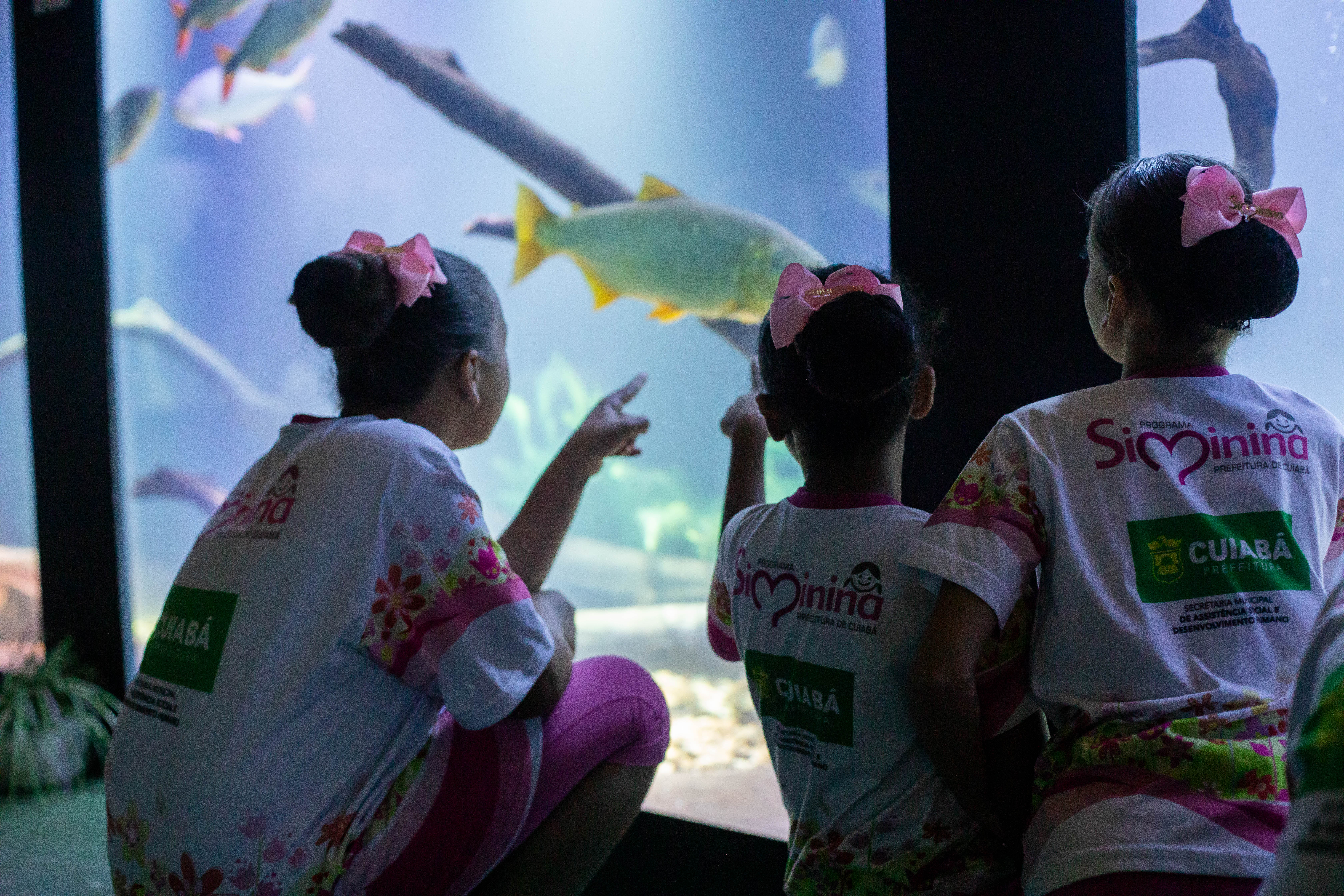 Mais de 200 meninas atendidas pelas unidades do Programa Siminina dos bairros Carumbé e Primeiro de Março, em Cuiabá, participaram, nesta quarta-feira (13), nos períodos matutino e vespertino, de uma visita especial ao Aquário Municipal Justino Malheiros. O espaço disponibiliza aos visitantes mais de 600 peixes, distribuídos em aproximadamente 22 espécies, organizadas em três biomas: Amazônia, Pantanal e Cerrado.
