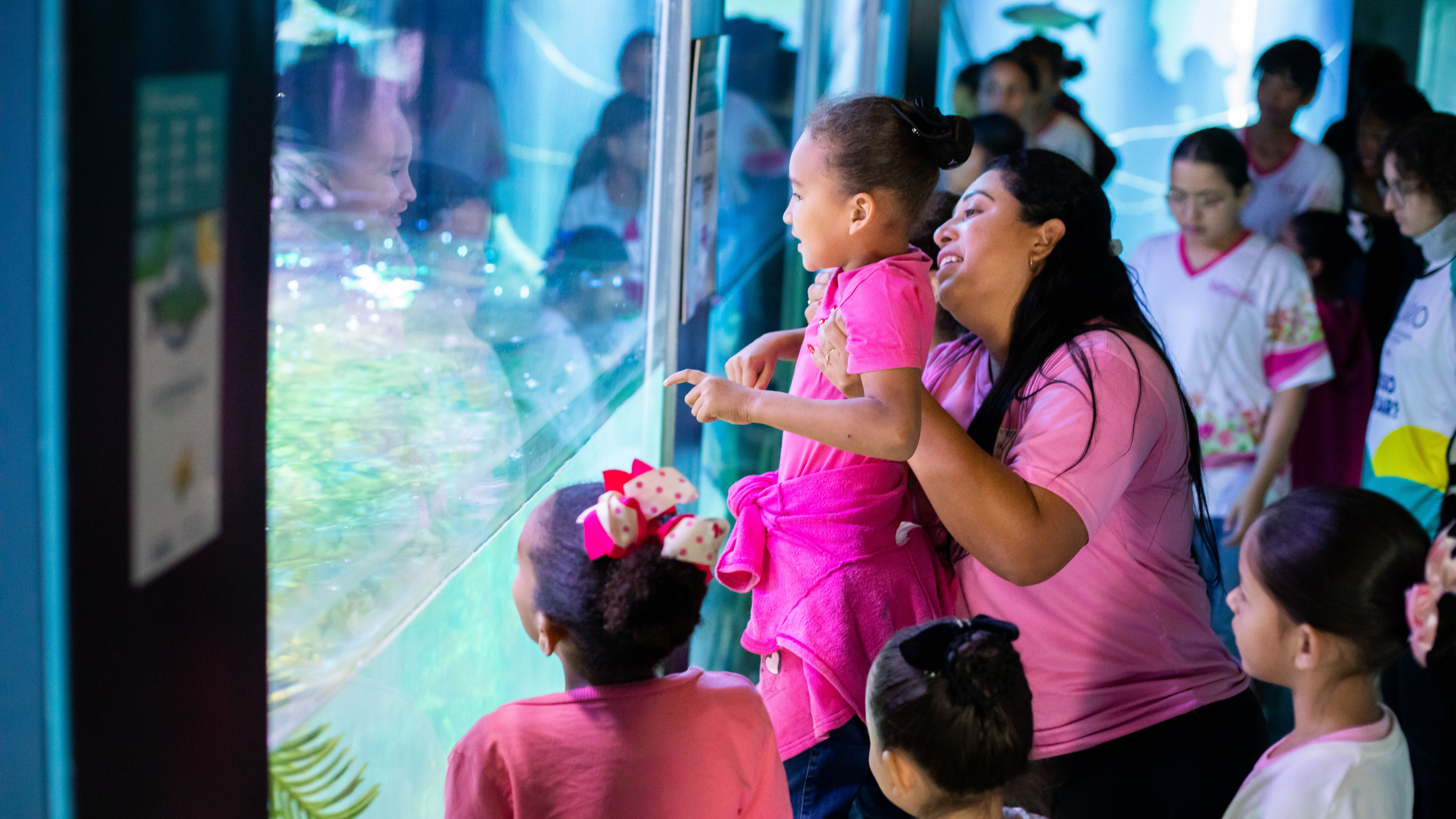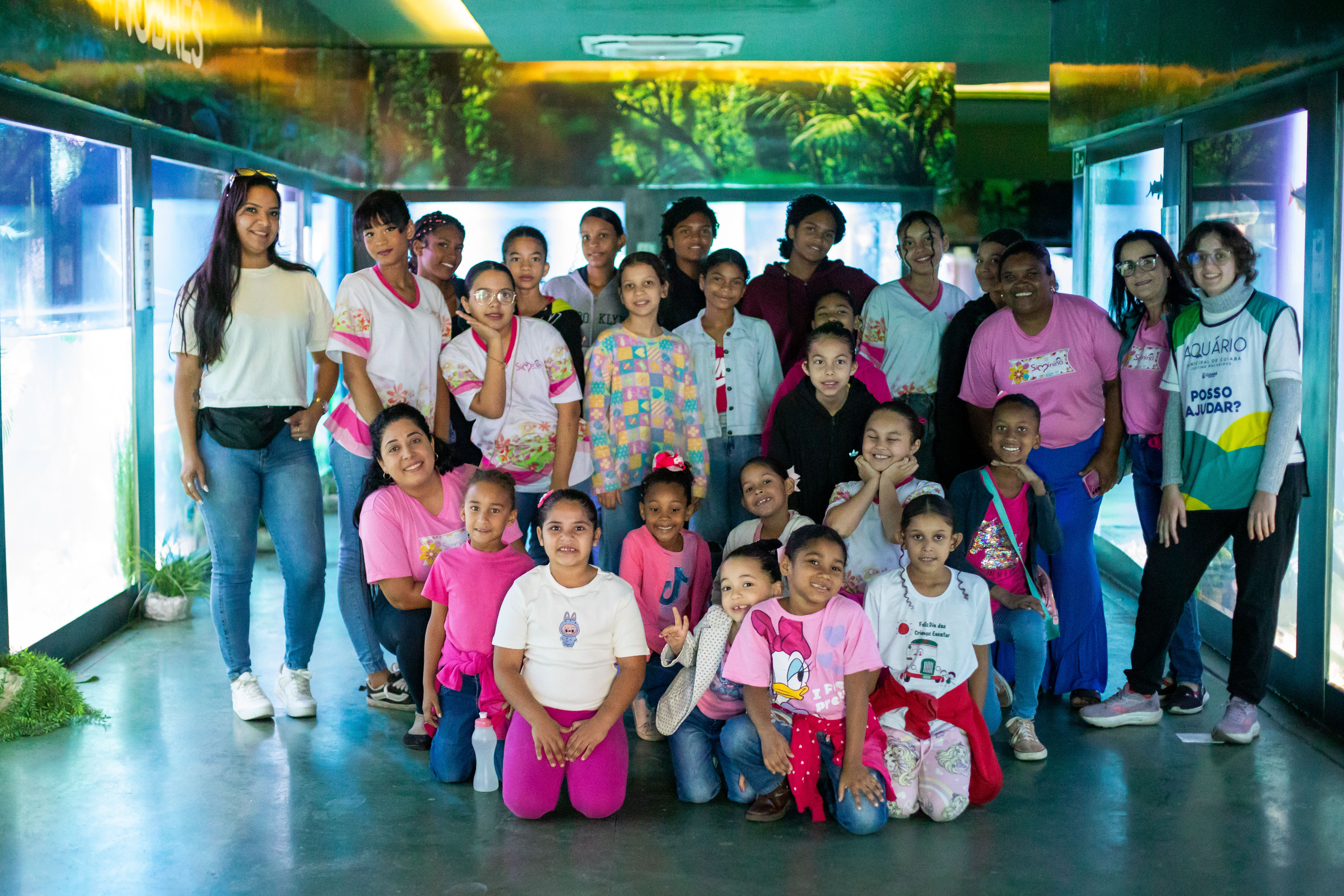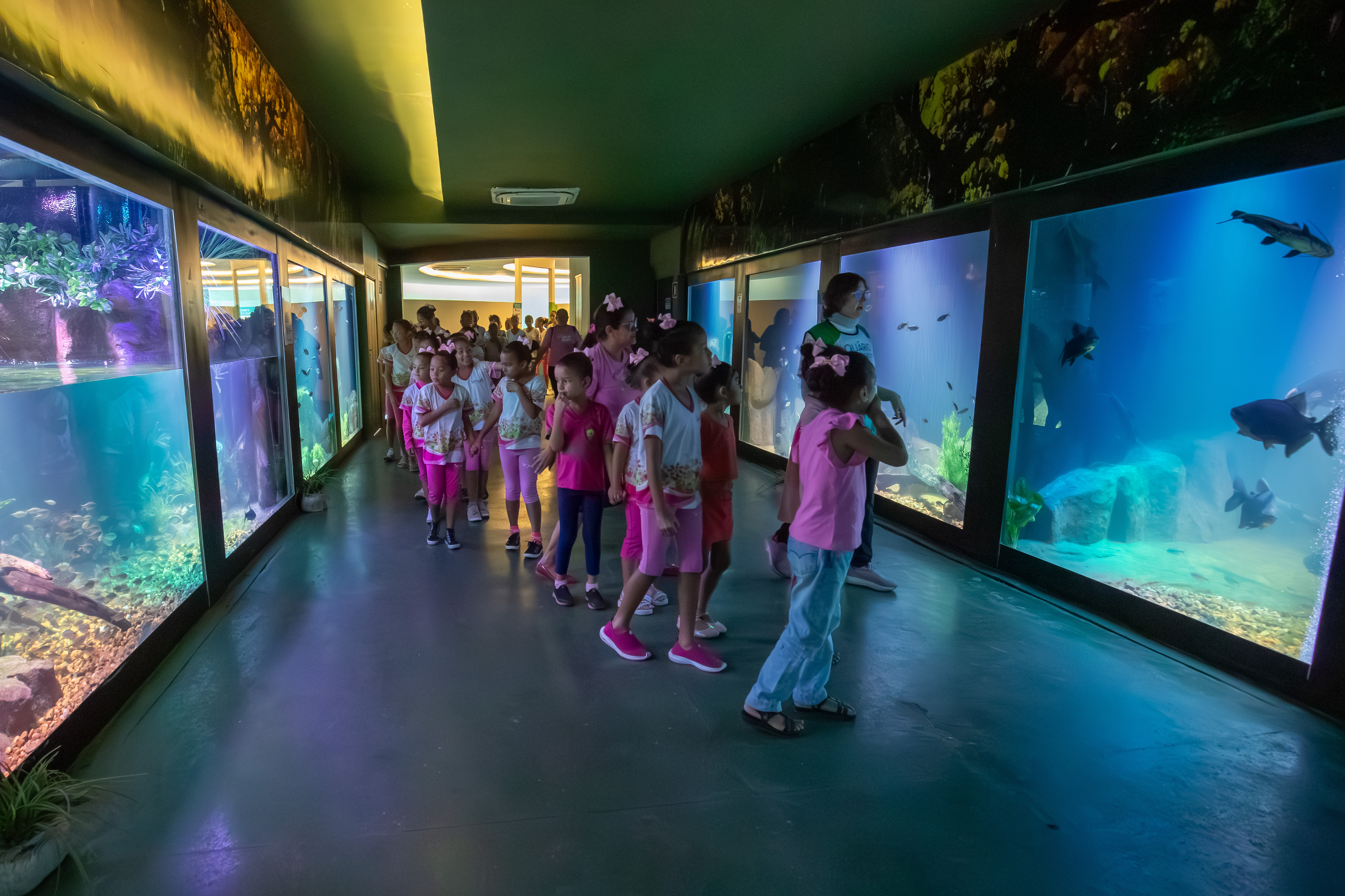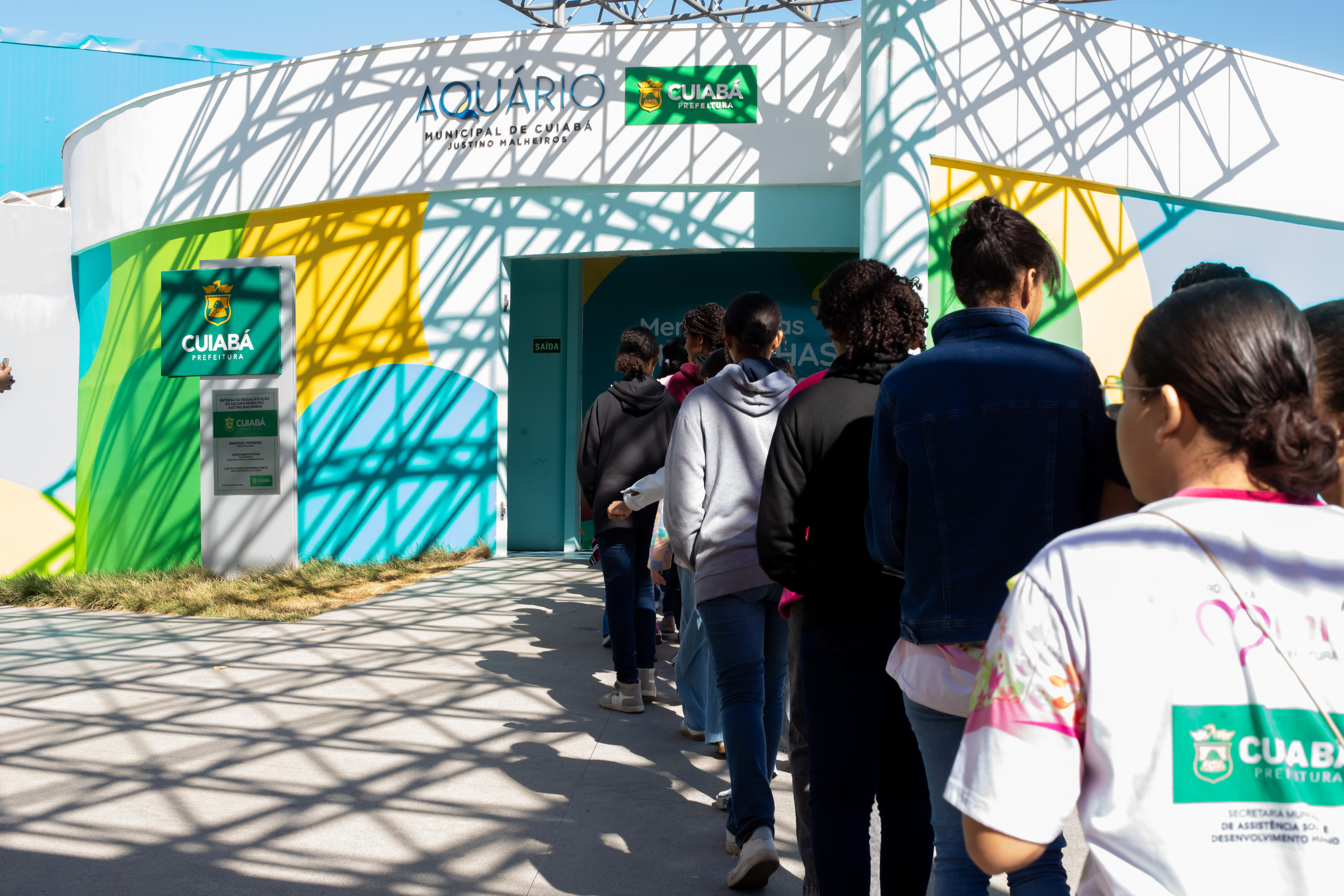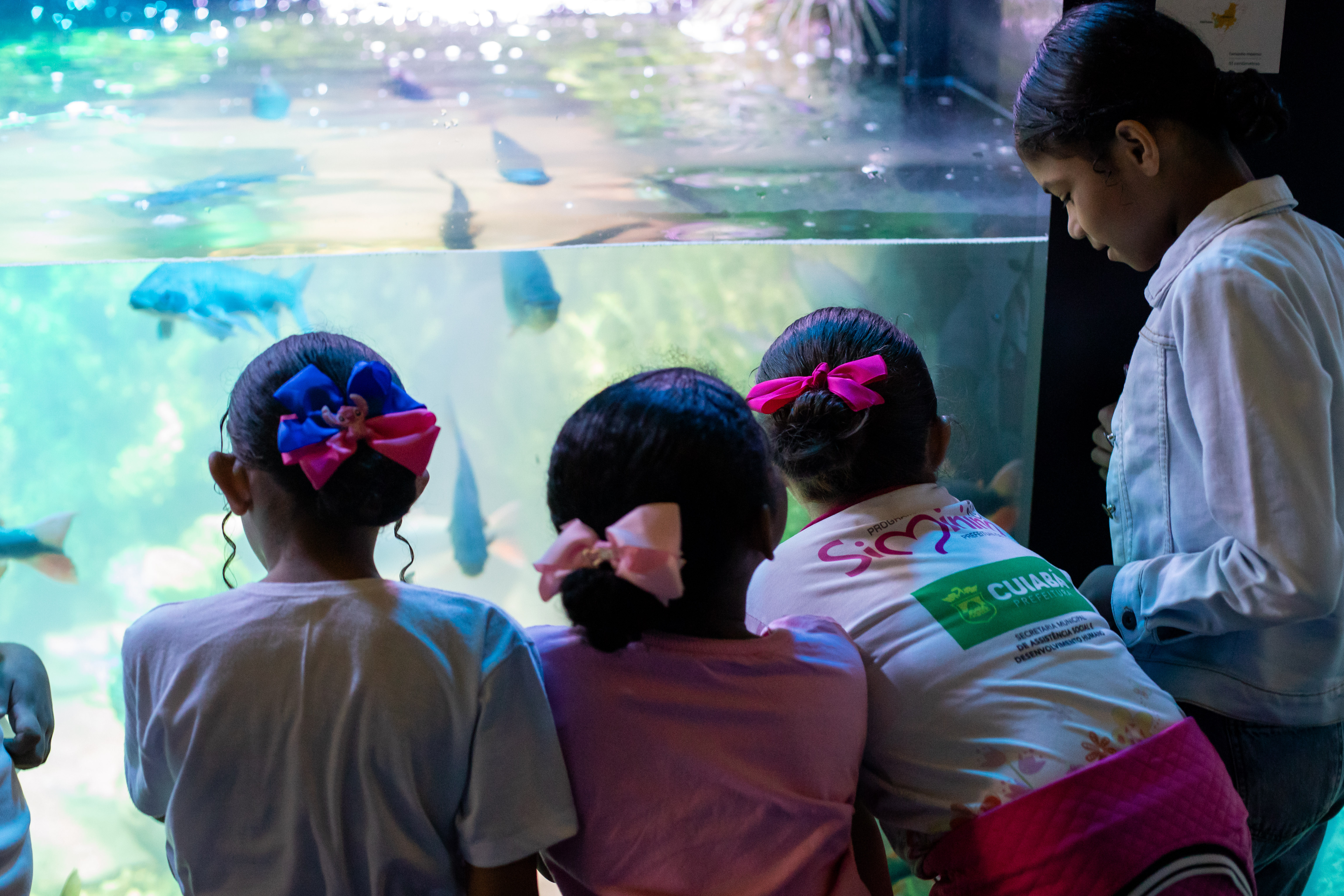 Mais de 200 meninas atendidas pelas unidades do Programa Siminina dos bairros Carumbé e Primeiro de Março, em Cuiabá, participaram, nesta quarta-feira (13), nos períodos matutino e vespertino, de uma visita especial ao Aquário Municipal Justino Malheiros. O espaço disponibiliza aos visitantes mais de 600 peixes, distribuídos em aproximadamente 22 espécies, organizadas em três biomas: Amazônia, Pantanal e Cerrado.