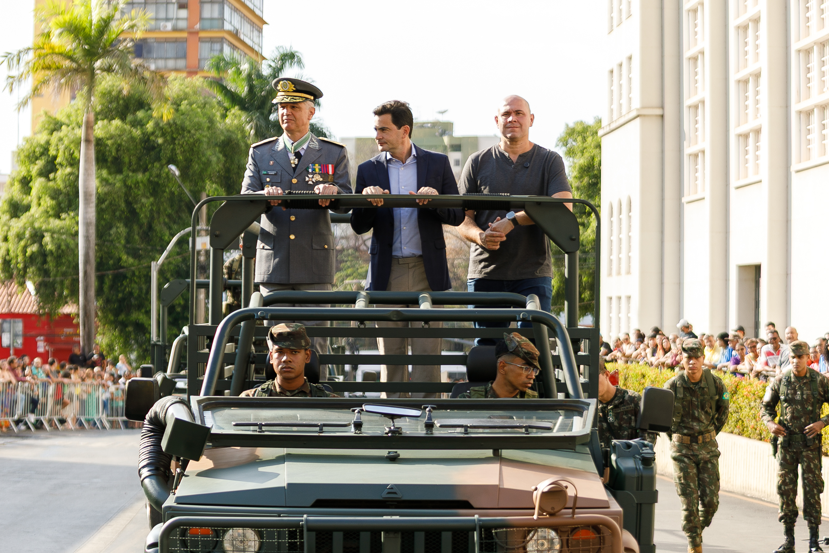 A imagem mostra o prefeito, Abilio Brunini, o secretário da Casa Civil, Fabio Garcia e autoridades militares durante desfile cívico-militar de 7 de Setembro na Avenida Getúlio Vargas, em Cuiabá.
