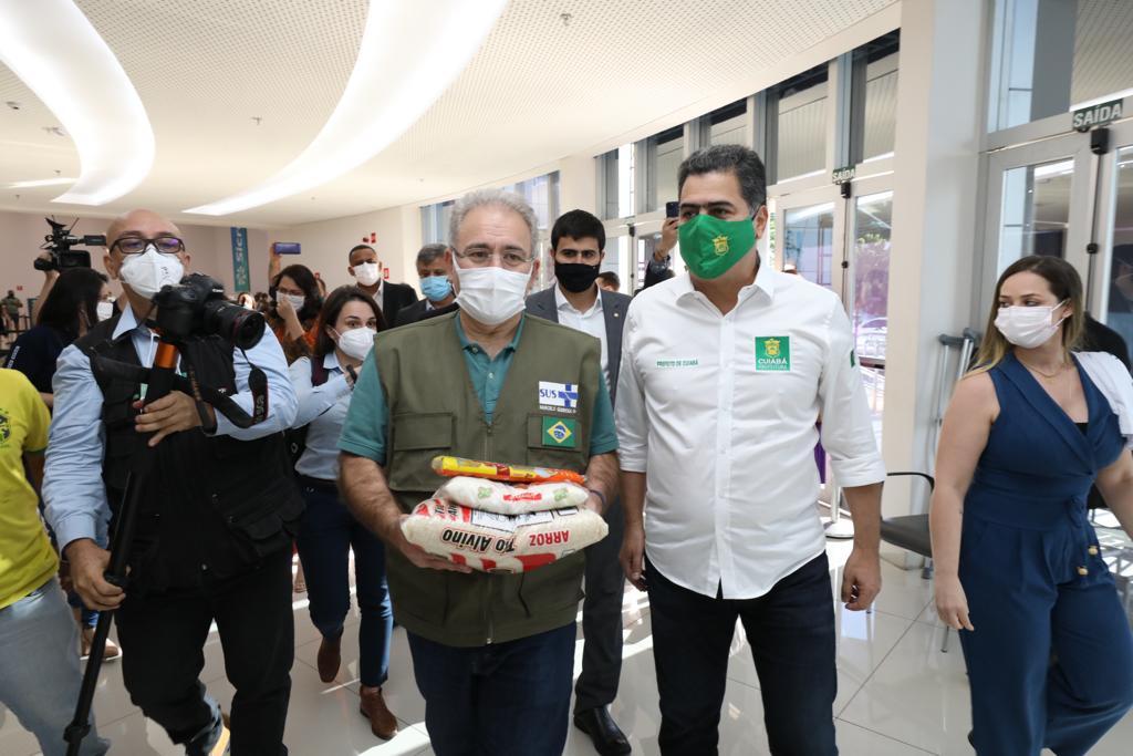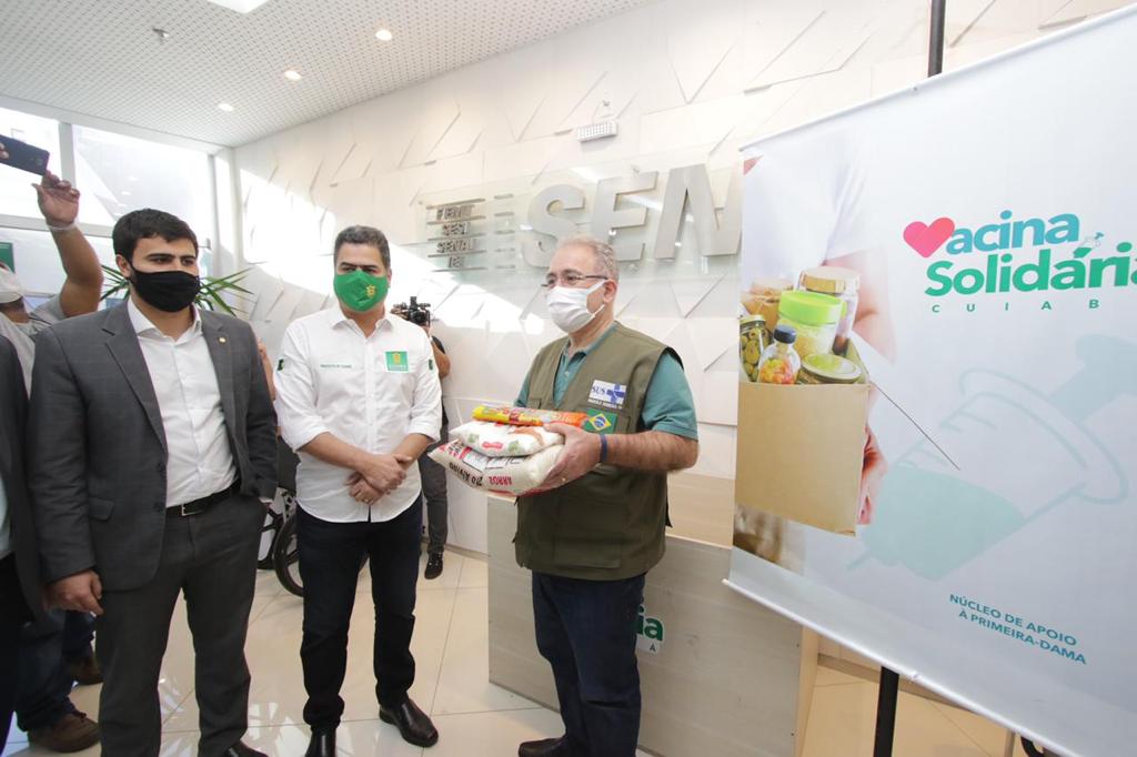 Ao chegar ao polo de imunização do Senai Porto, na tarde desta sexta-feira (09), o Ministro da Saúde Marcelo Queiroga demonstrou seu espírito de solidariedade ao fazer uma doação à campanha Vacina Solidária, coordenada pela primeira-dama Márcia Pinheiro. A campanha conta com pontos de arrecadação nos cinco polos de vacinação: Senai Porto, estacionamento do Sesi Papa, Universidade Federal de Mato Grosso (UFMT), Sesc Balneário e estacionamento da Assembleia Legislativa de Mato Grosso (AL-MT).