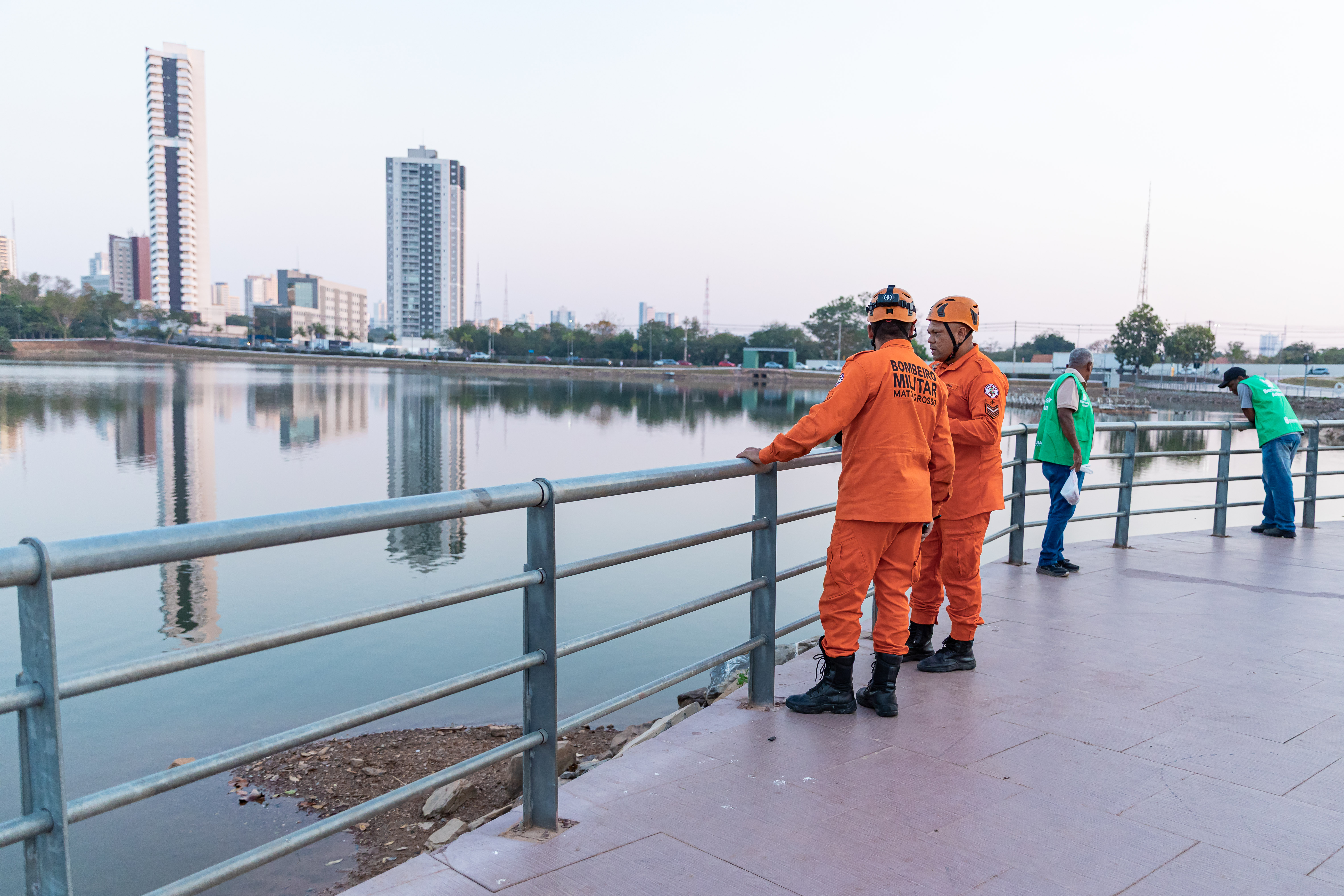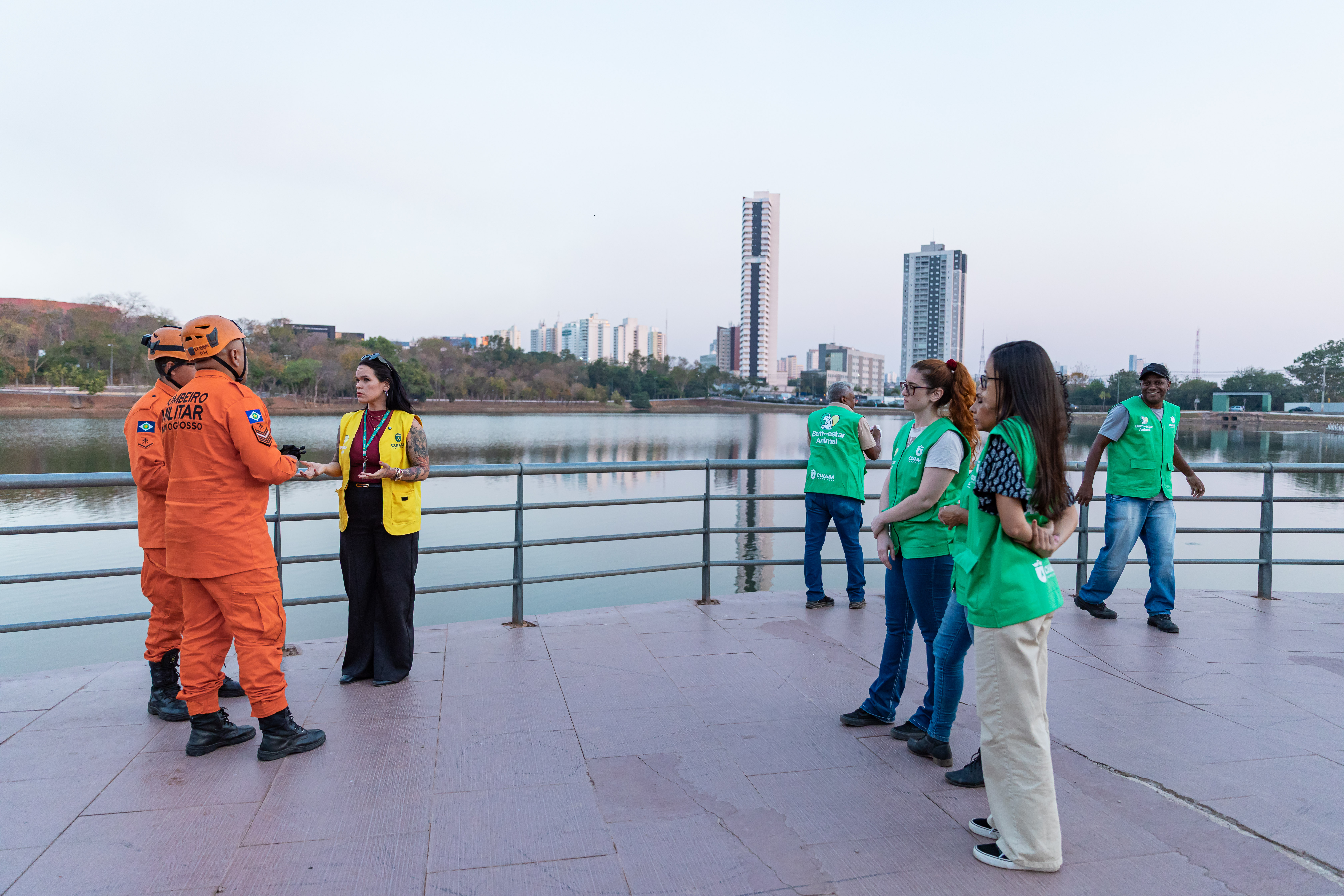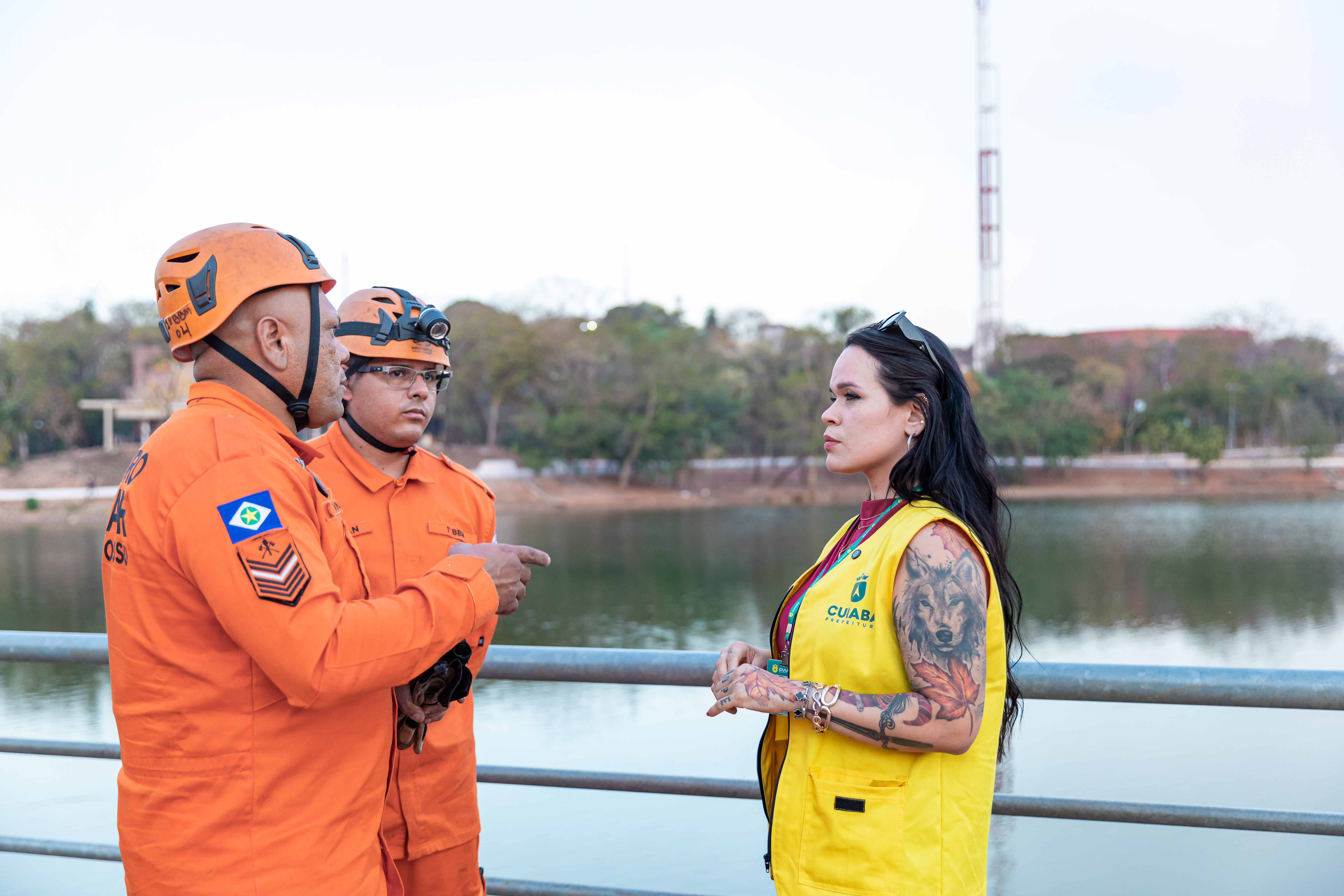 A foto ilustra a diretora de Bem Estar Animal, Morgana Erns, vestida com colete amarelo que contém brasão da Prefeitura de Cuiabá. Ela conversa dois homems da equipe do Corpo de Bombeiros. É possível visualizar trecho do lago do Parque das Águas.
