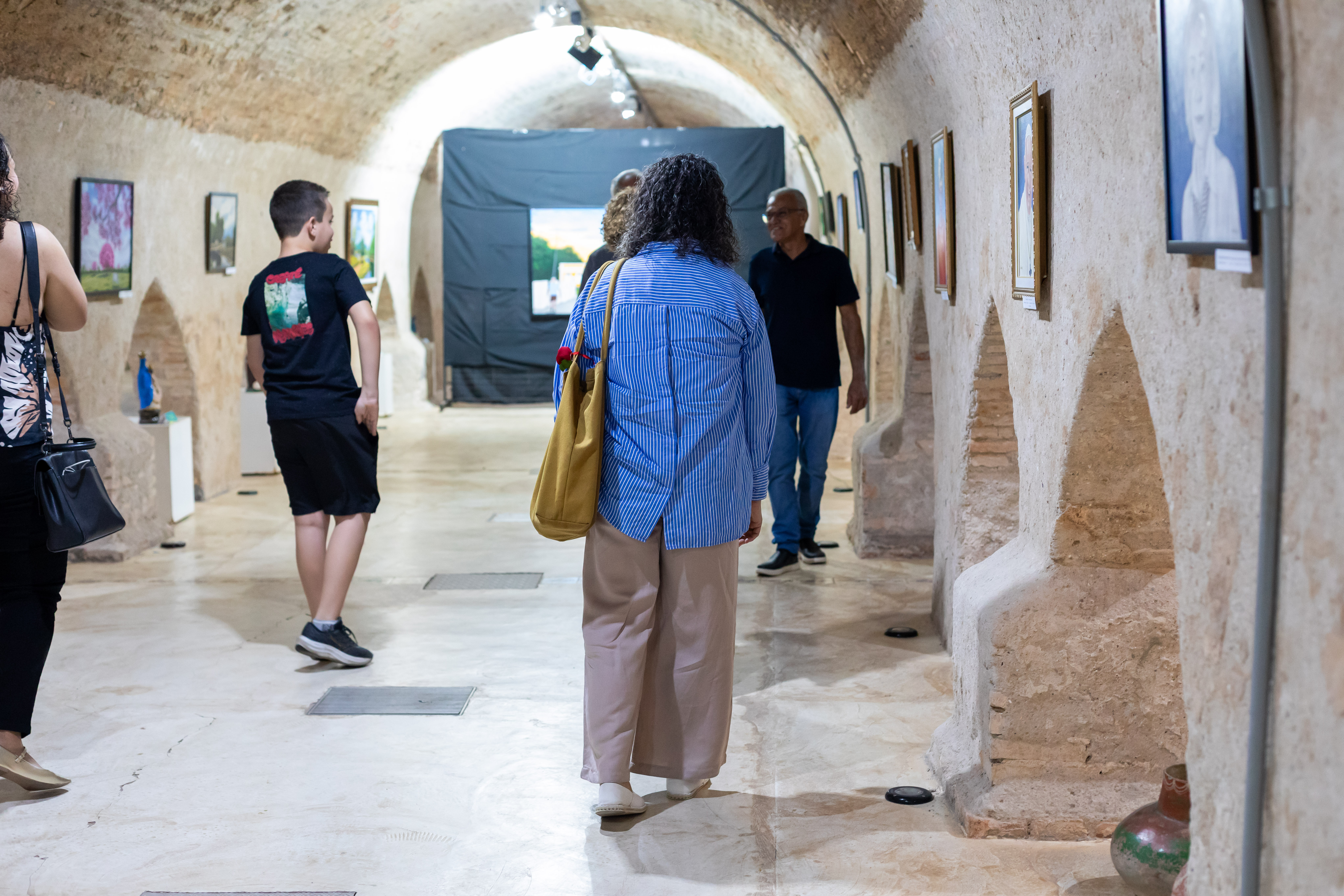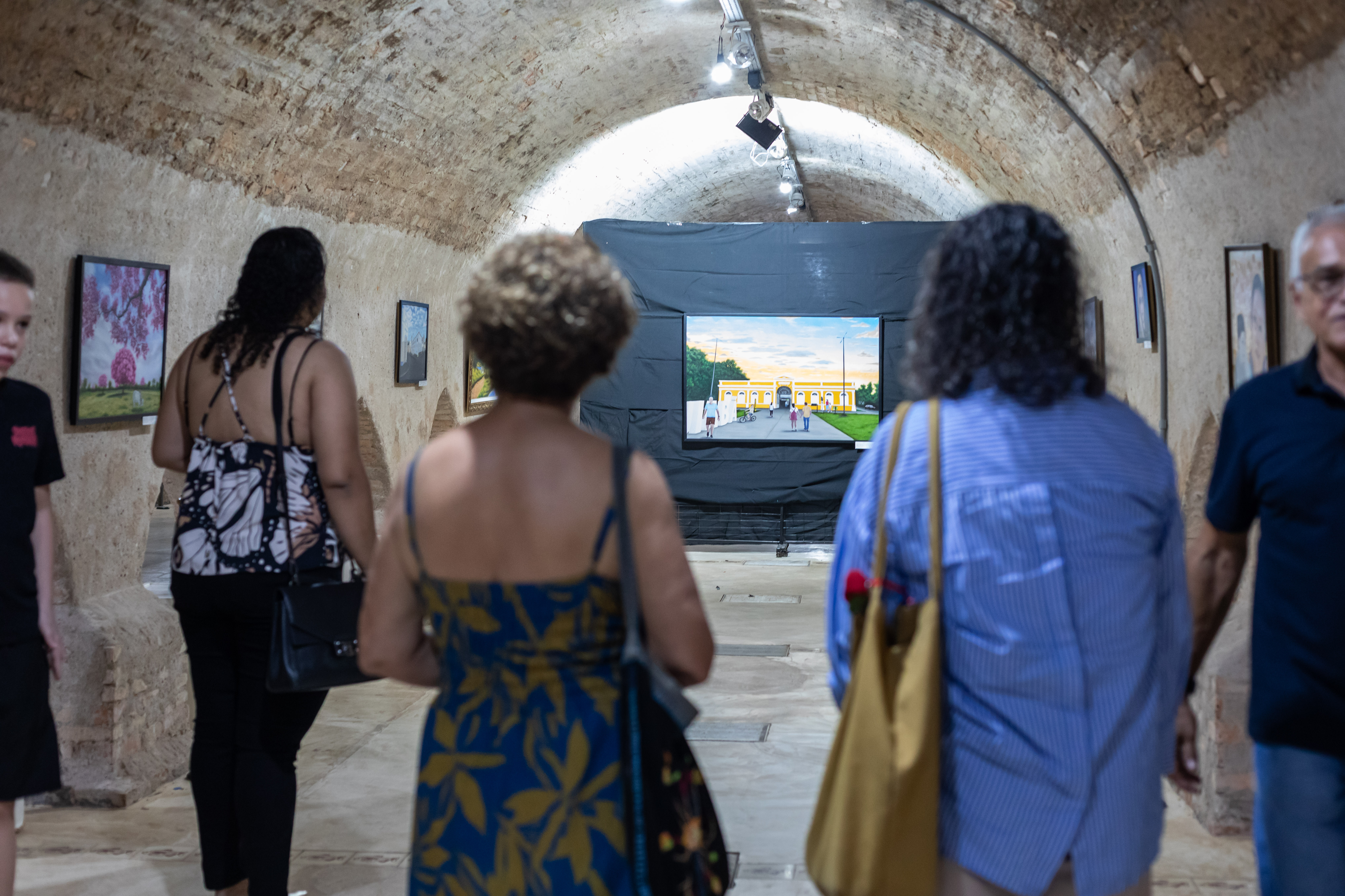 A imagem que ilustra a matéria mostra visitantes do Museu da Caixa D’Água, apreciando telas da mostra “A Magia do Pôr do Sol”.