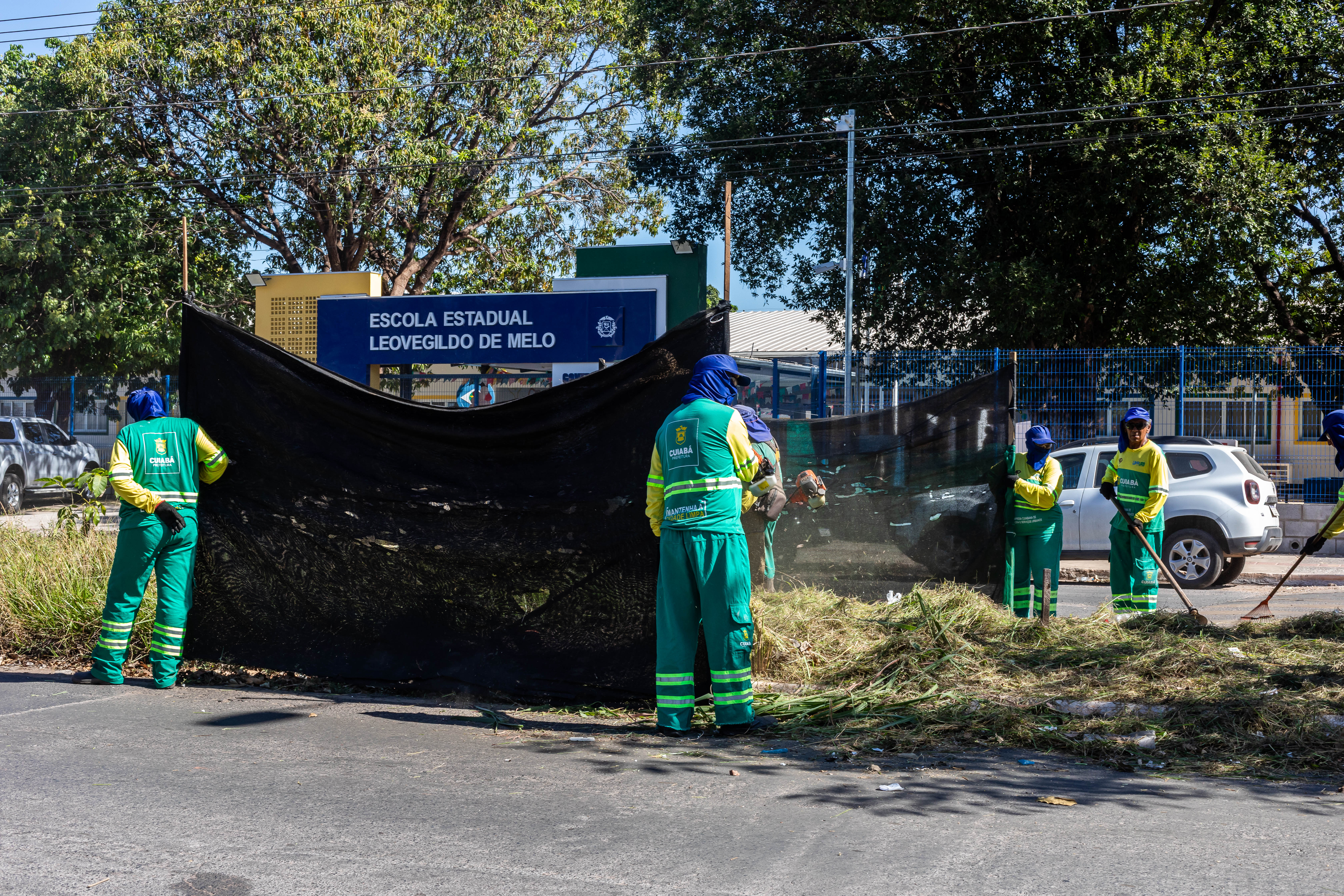 A imagem mostra colaboradores da Limpurb no mutirão de limpeza no CPA IV. Os funcionários usam uniforme na cor verde, e estão munidos de Equipamento de Proteção Individual (EPIs).