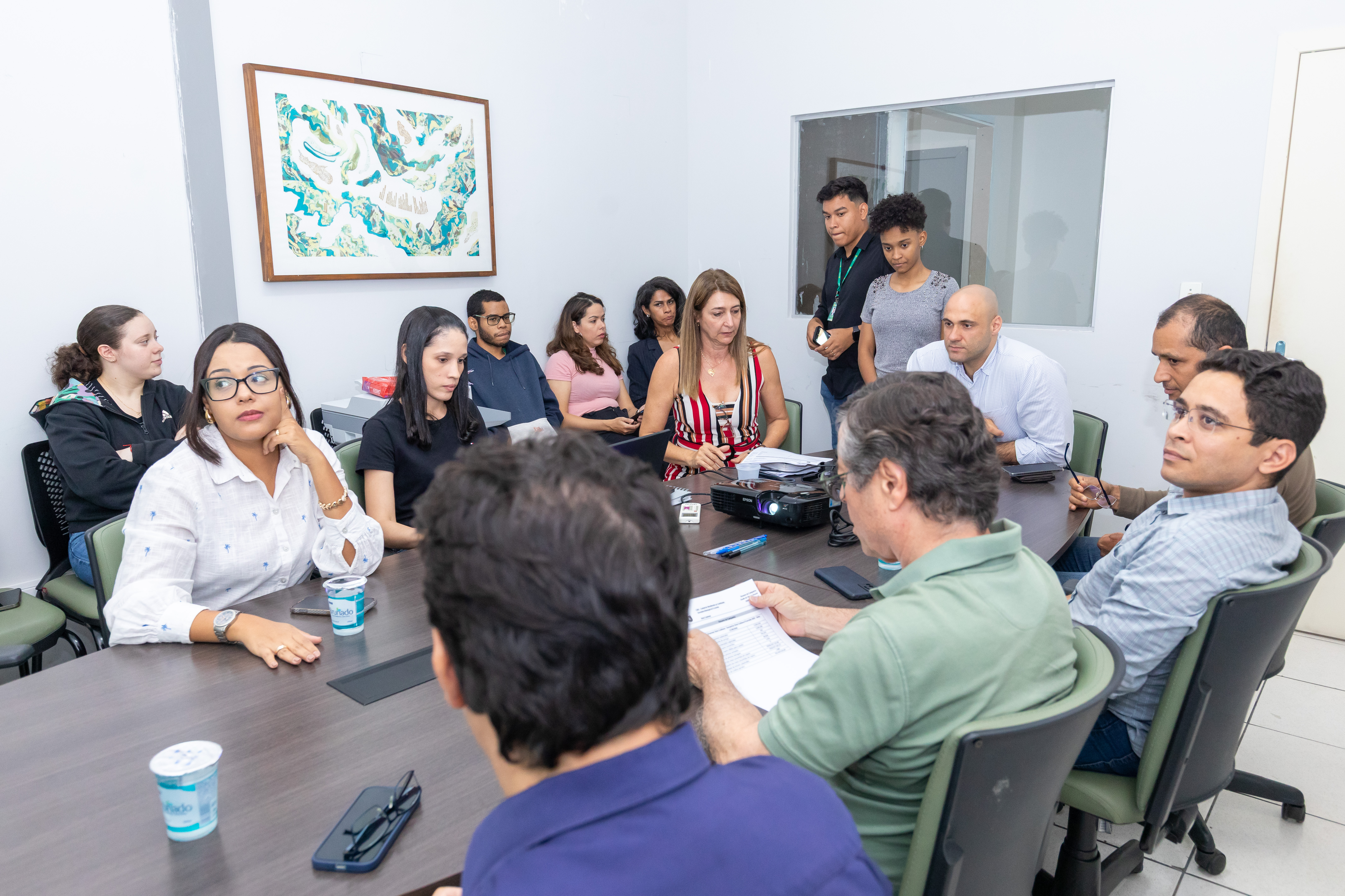 A foto ilustra servidores públicos que compõem a Comissão da Nota Cuiabana sentados numa sala. É possível visualizar documentos e aparelhos de notebook numa mesa de cor marrom.