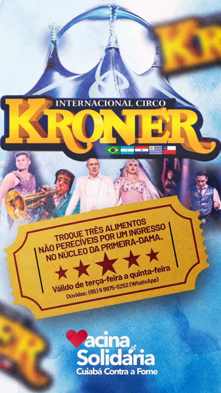 Dando um reforço ainda maior à Campanha “Vacina Solidária”, o Núcleo da primeira-dama de Cuiabá, Márcia Pinheiro, realiza uma parceria com o Circo Kroner. A ação visa trocar o ingresso para o espetáculo por 3 kg de alimentos não perecíveis, que podem ser retirados no próprio núcleo, localizado no sétimo andar do Palácio Alencastro.