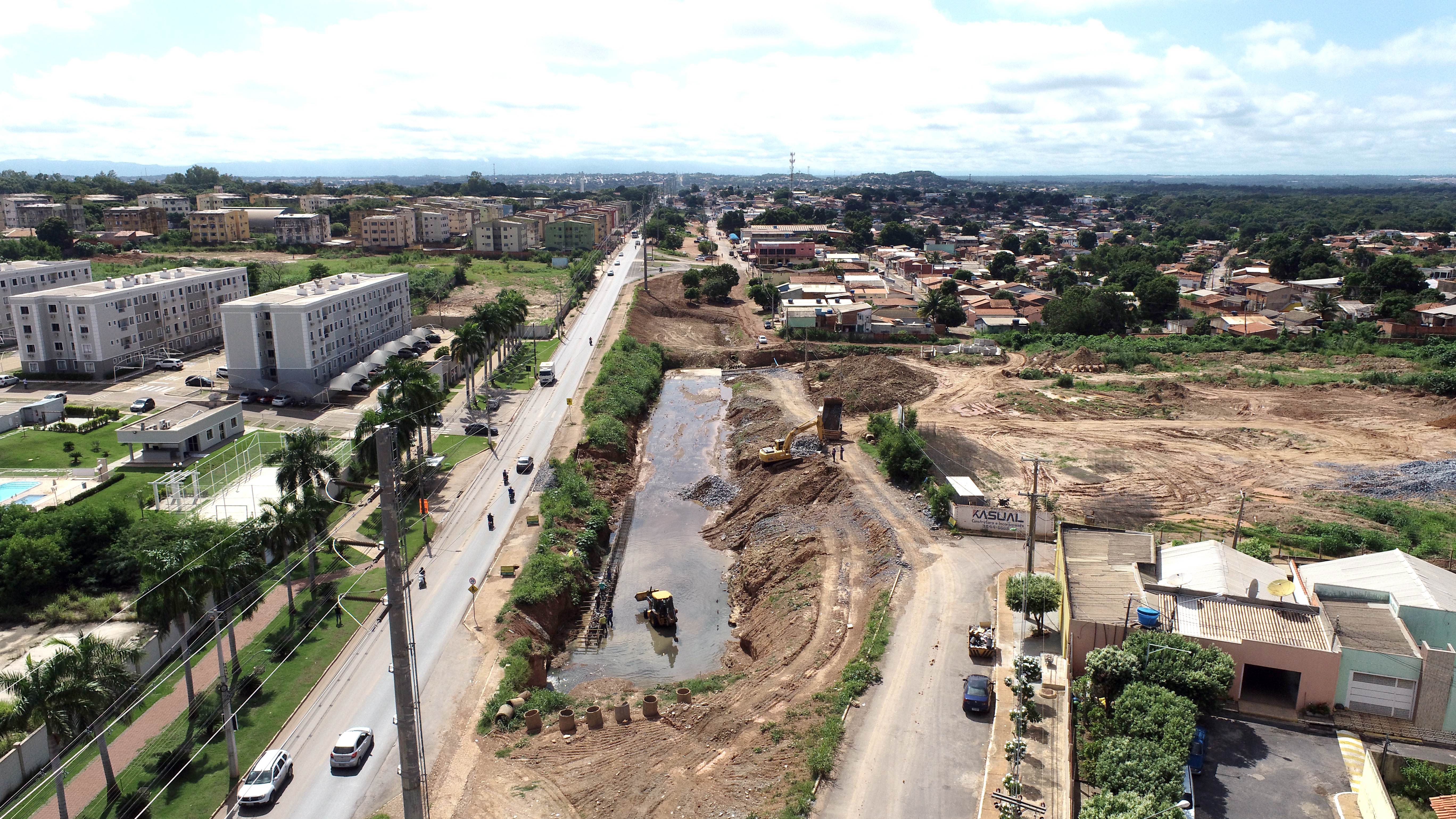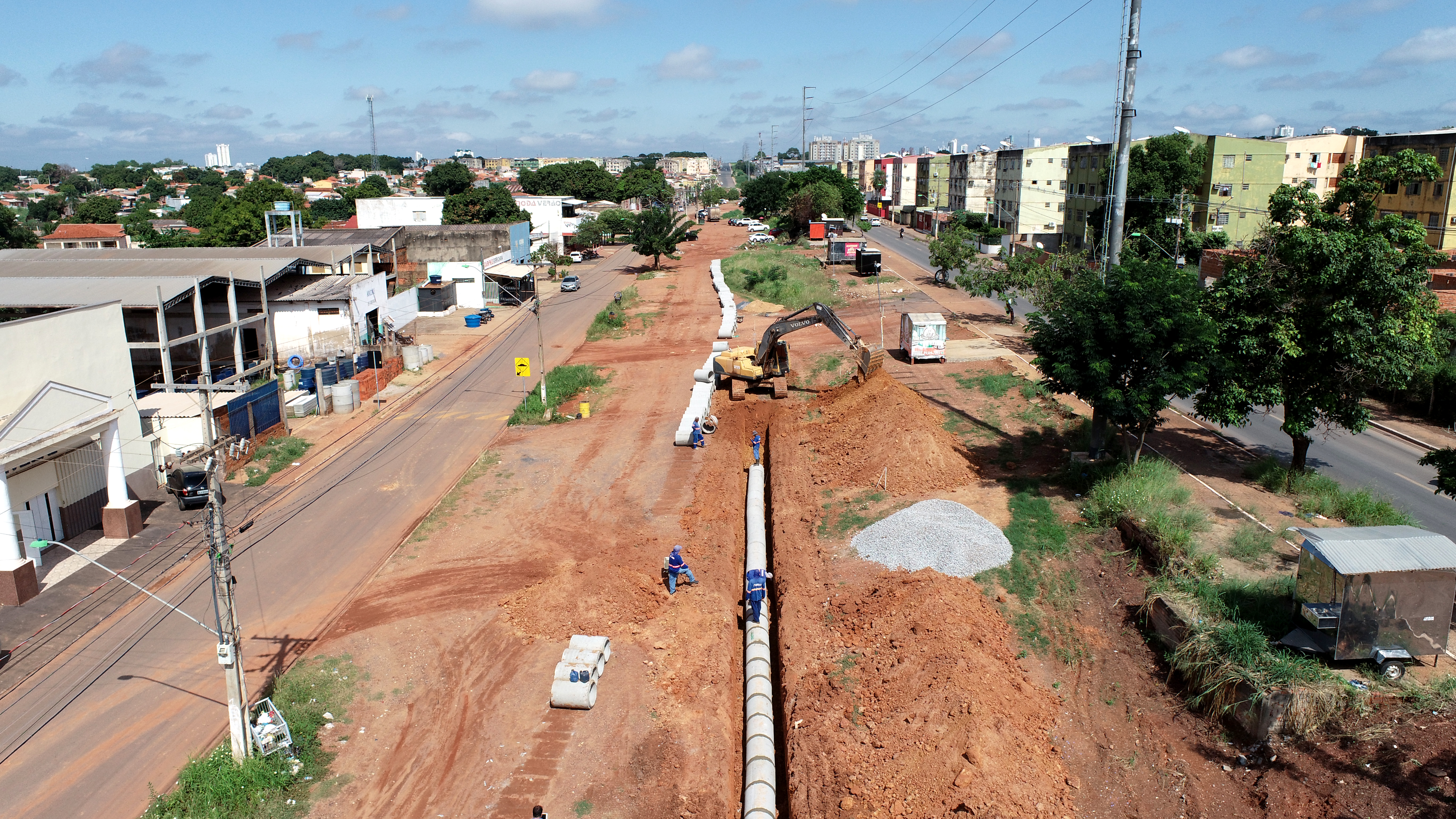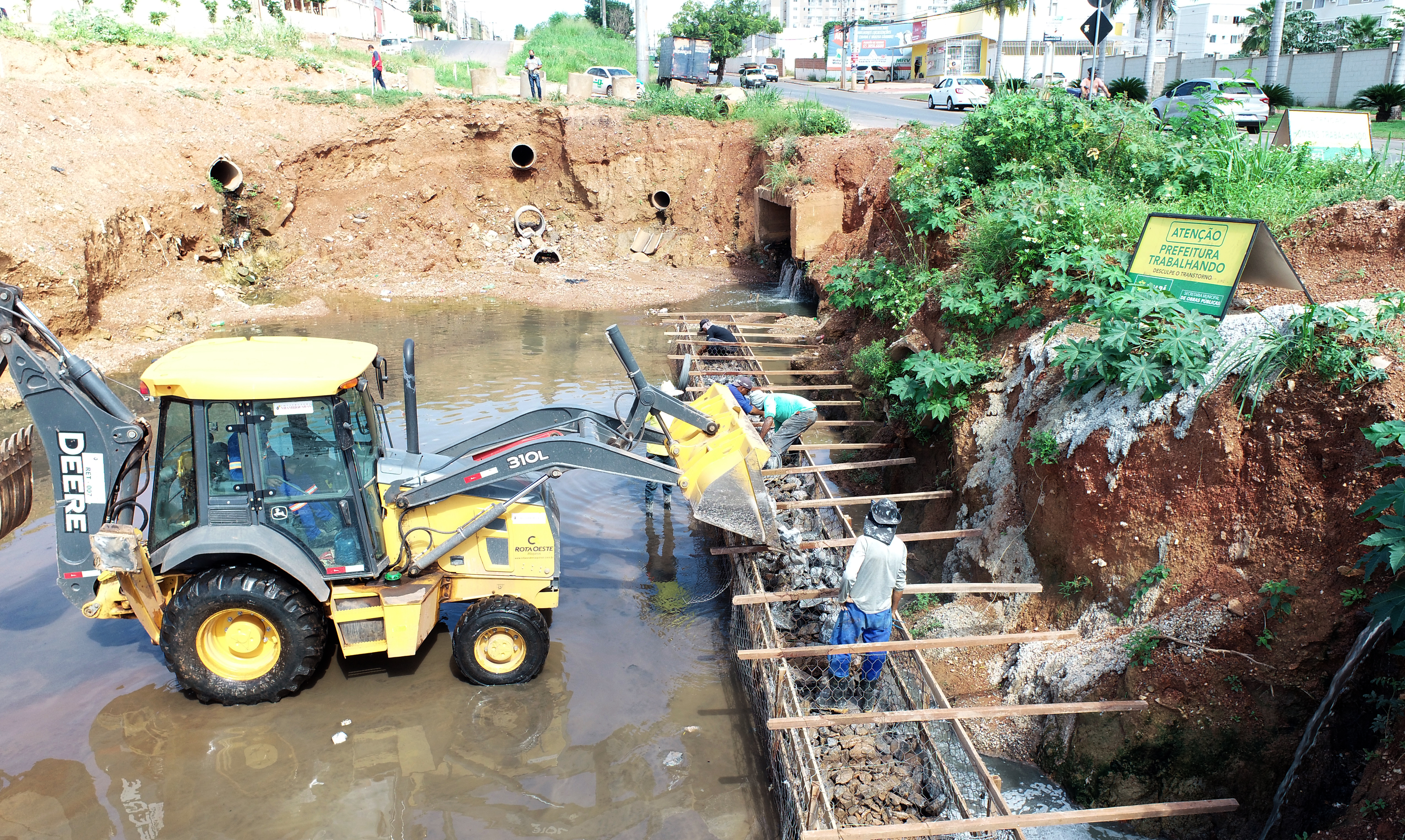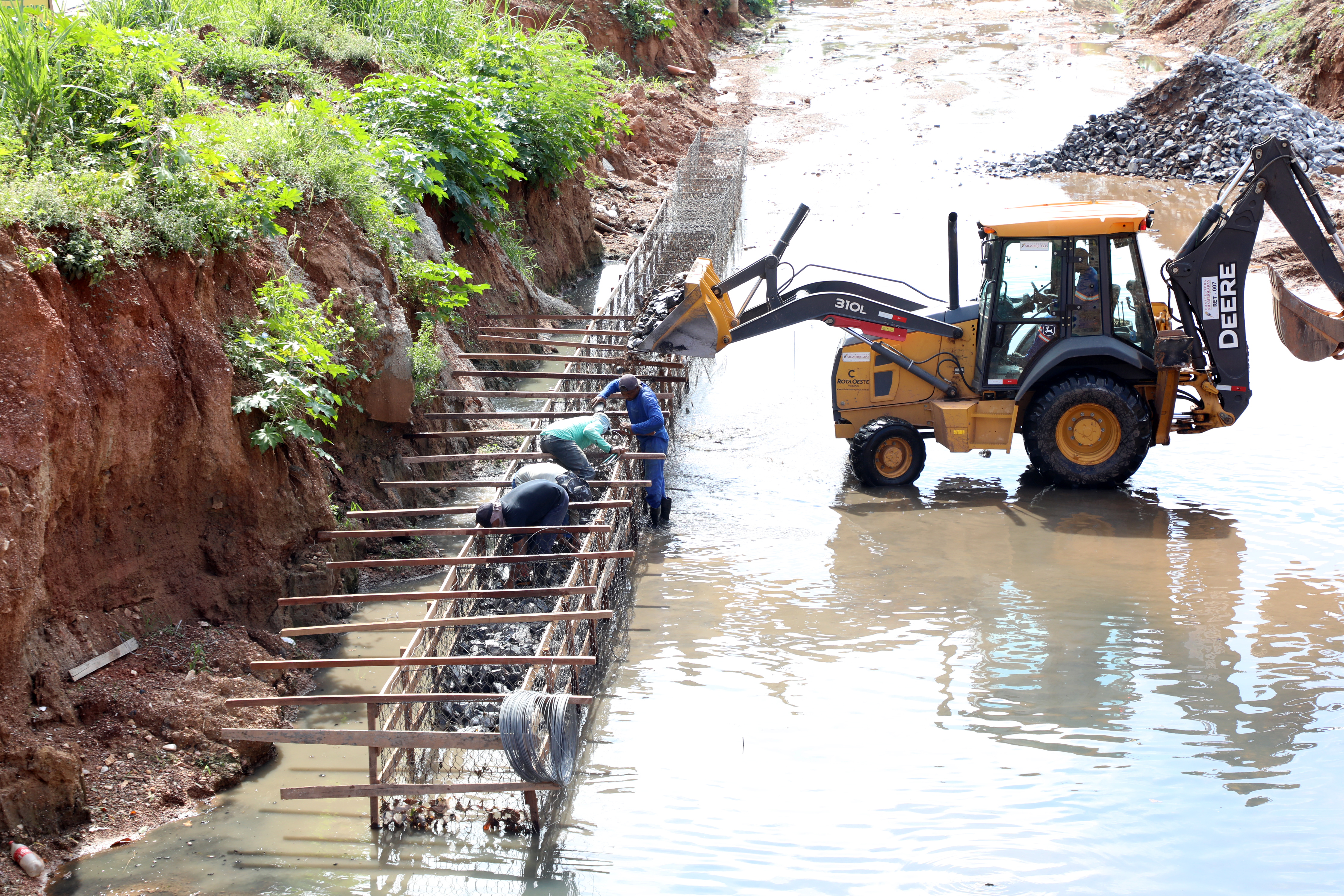 Neste momento, após superar as fases de desassoreamento e demarcação do córrego que passa pela via, uma equipe trabalha na construção do muro de gabião nas paredes laterais do local. Somado a isso, em outro trecho da avenida, também é executada a etapa de instalação da tubulação que compõe o sistema de drenagem de águas pluviais.