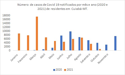 Com relação ao número de casos de infecção pelo novo coronavírus, outubro de 2021 também apresenta o menor número de notificações de 2021, com 740 casos. Assim como nos óbitos, também foi o terceiro mês com menor registro desde o início da pandemia. Em março de 2020, houve 269 notificações e em abril do ano passado, 598. Em 2020, o mês em que houve o maior número de casos notificados de covid-19 foi julho, com 9.856 registros. Neste ano, março atingiu o pico de 17.408 casos, ou seja, 76,6% de aumento do pico de 2020 para o deste ano.