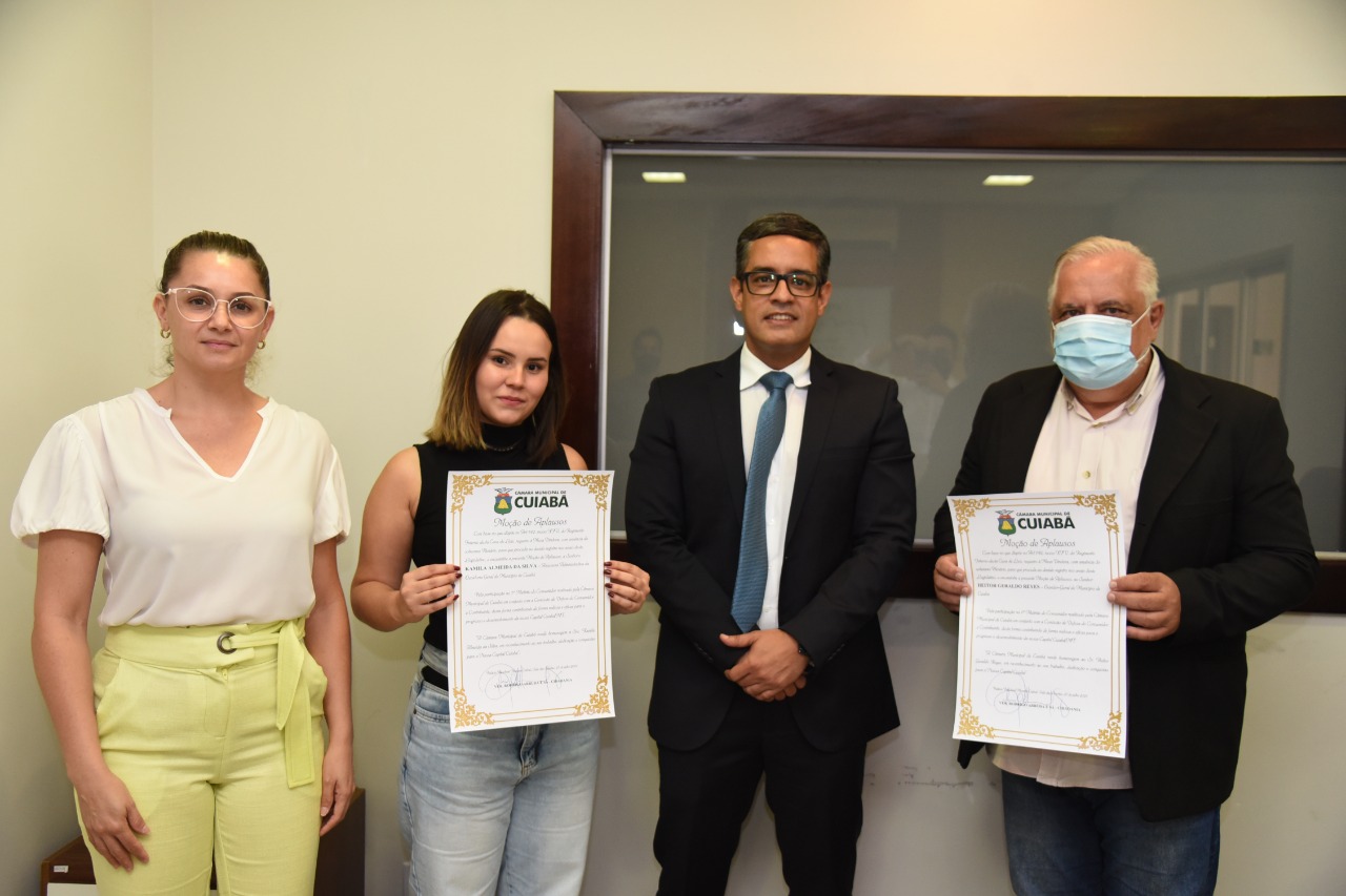 O ouvidor-geral do Município Heitor Geraldo Reyes, a assessora administrativa e o coordenador técnico de Atendimento ao Cidadão da Ouvidoria Geral do Município (OGM), Kamila Almeida da Silva e Francisco Janderson Pereira Cavalcante, respectivamente, foram agraciados com Moção de Aplauso concedida pela Câmara de Vereadores e entregue em mãos pelo vereador Rodrigo Arruda e Sá (autor da proposta), nessa terça-feira (23), na sede da OGM.
