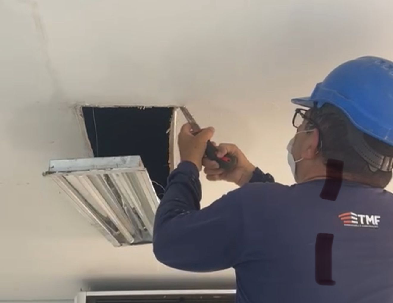 A foto mostra um profissional realizando reparos na estrutura elétrica no teto de uma sala. Ele utiliza equipamento para recorte no forro de gesso.