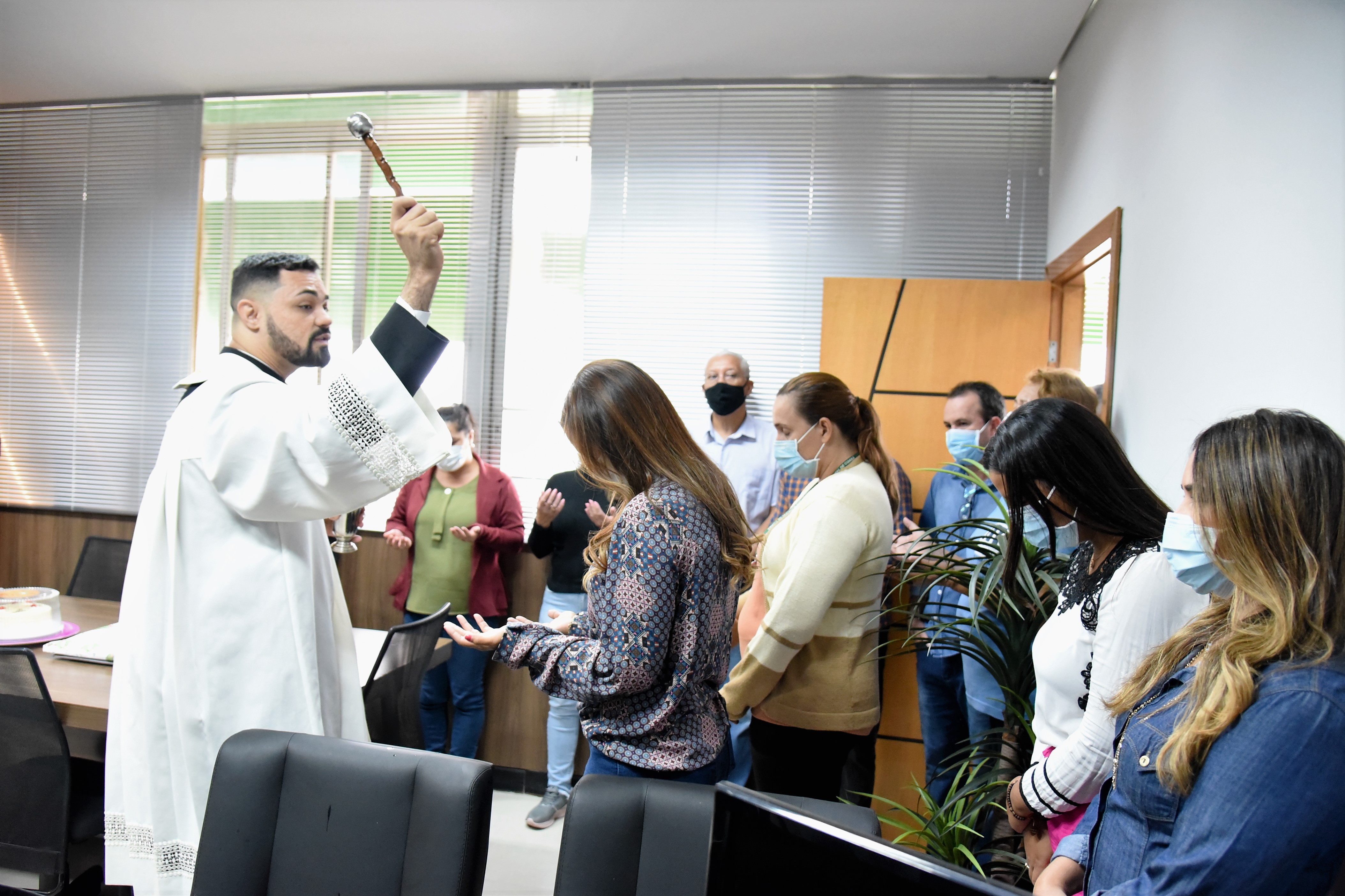 A pedido dos servidores da Secretaria Municipal de Governo, o padre Jueberton Enil, esteve no prédio Alencastro, para orar pelo restabelecimento da saúde do secretário da pasta, Luis Cláudio Sodré, que se encontra internado na capital de São Paulo em decorrência da Covid-19.