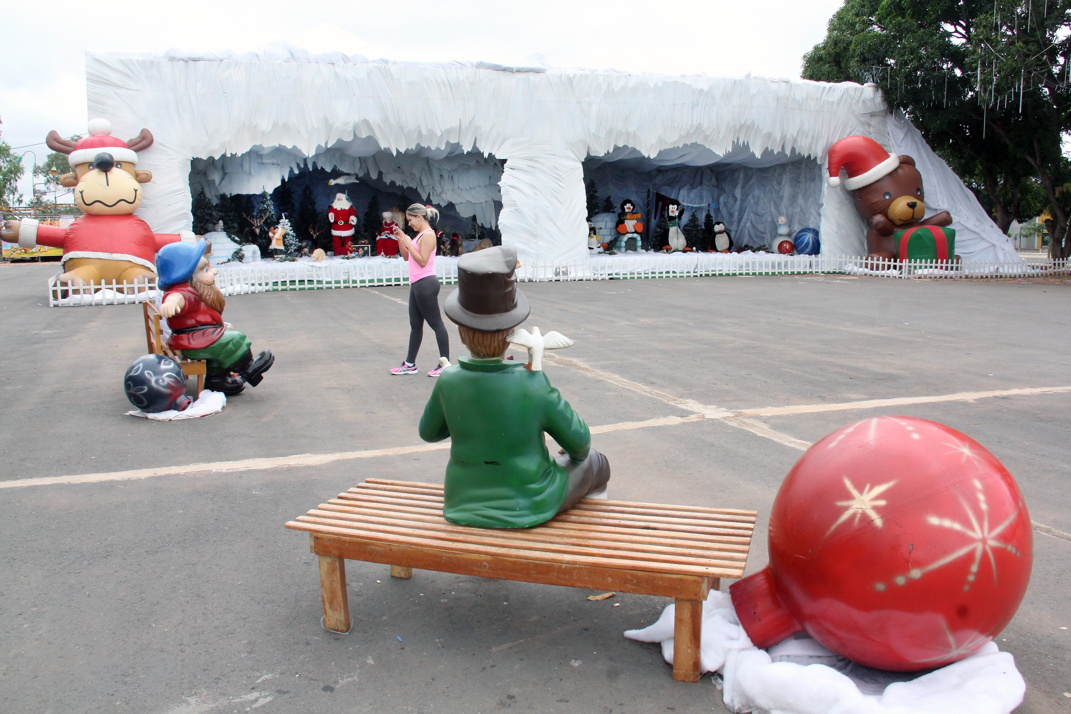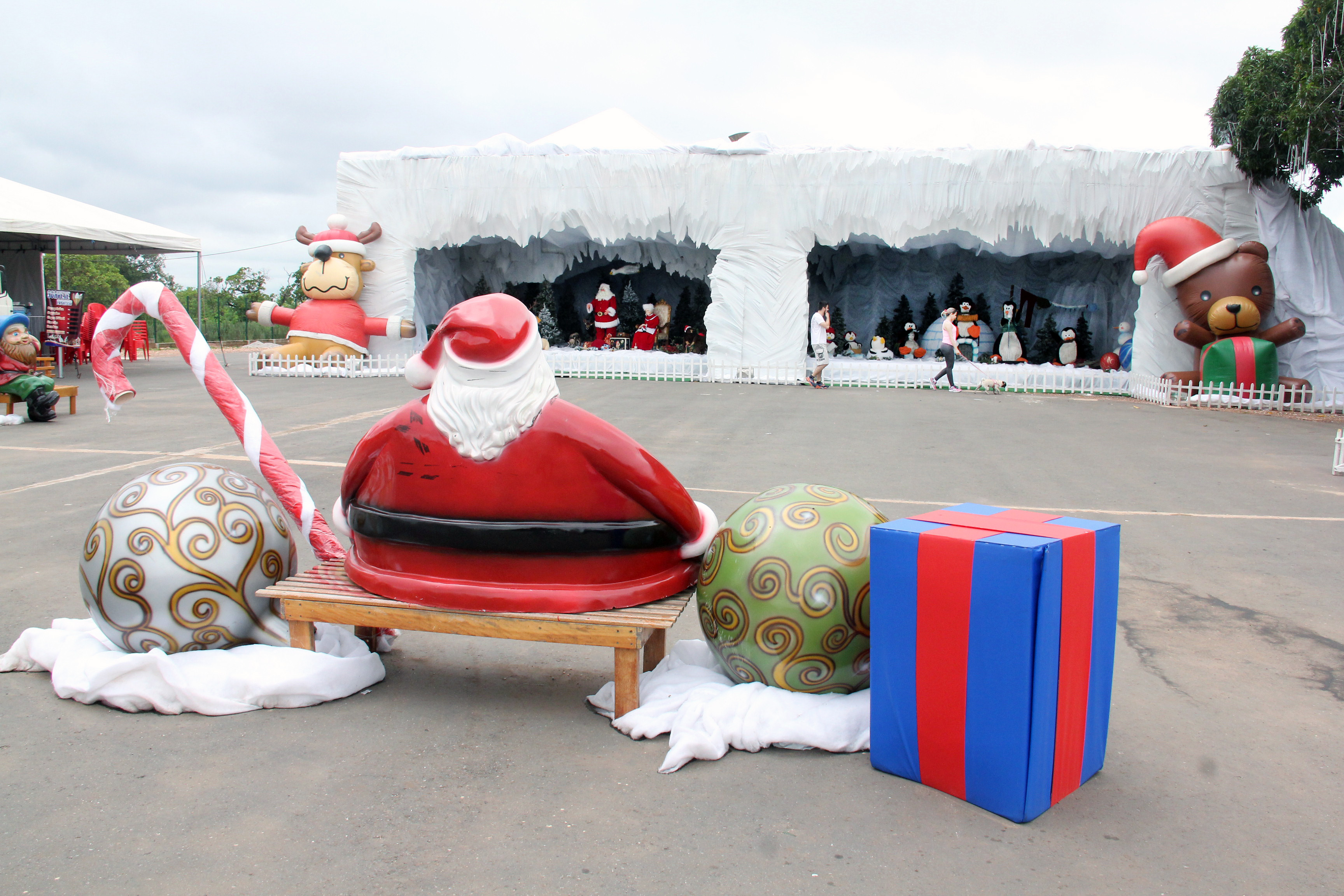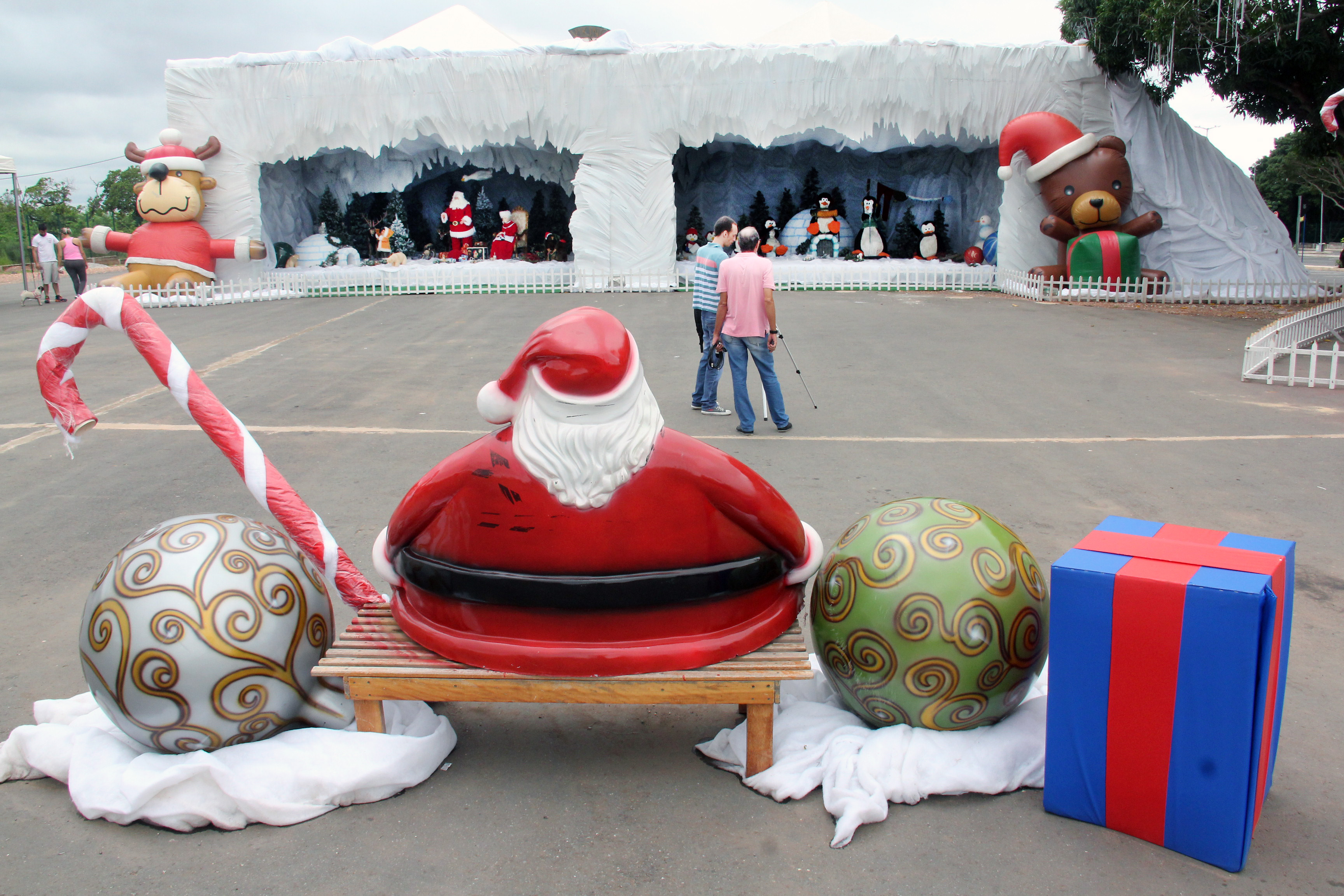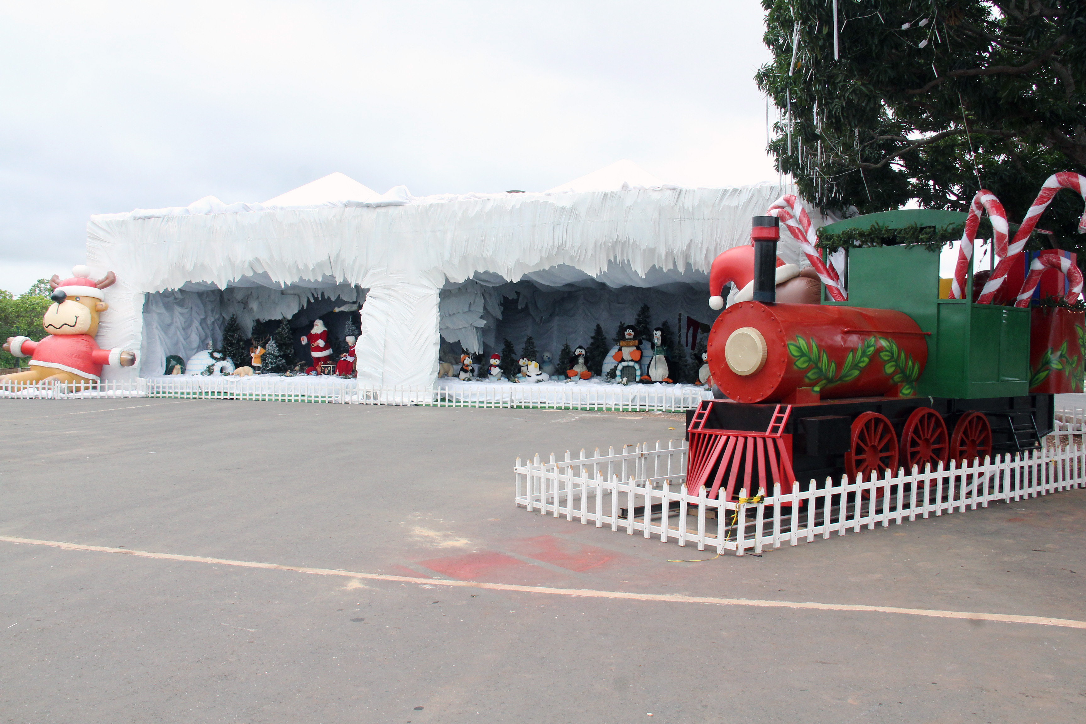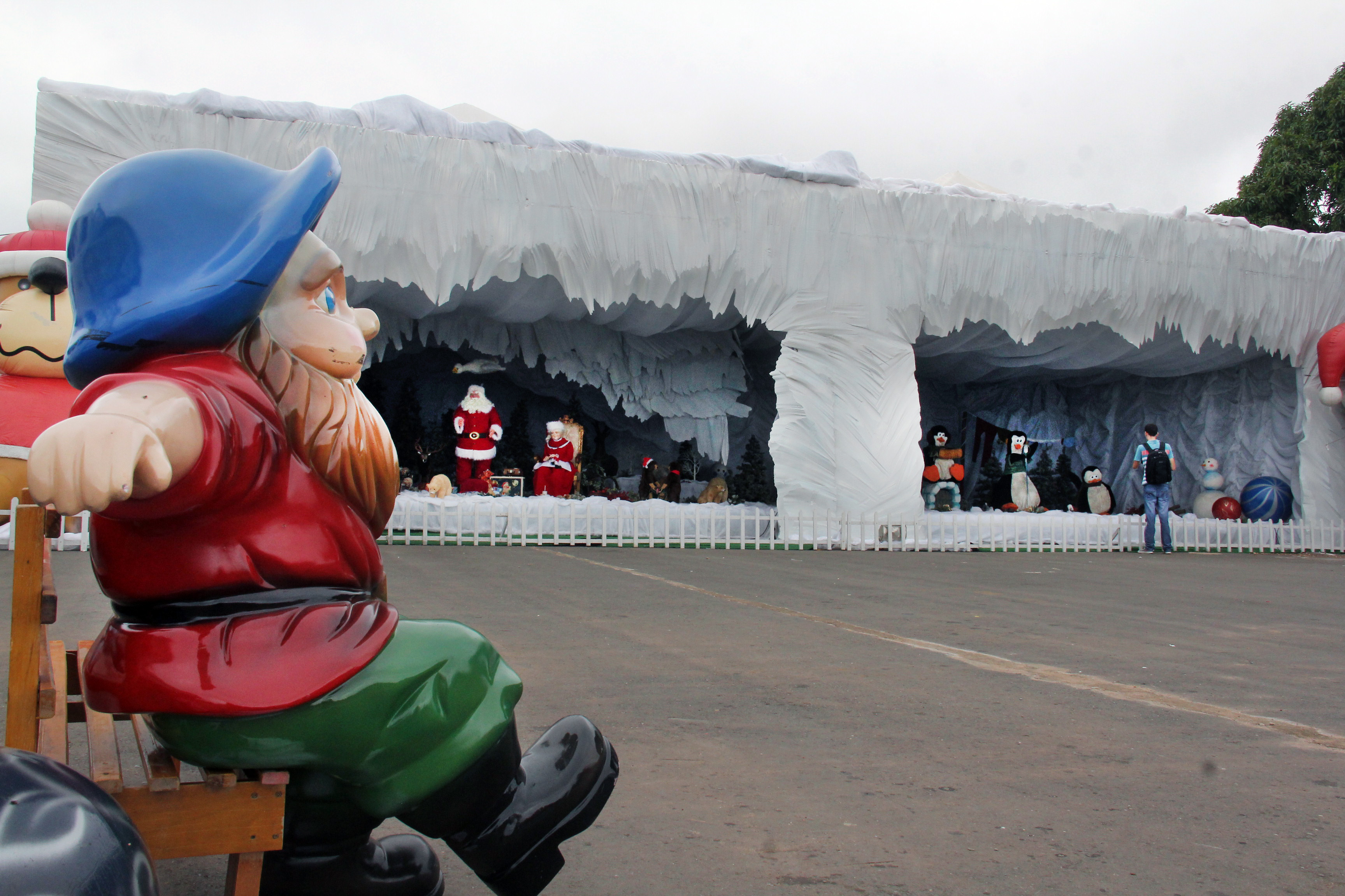 Há ainda, nas laterais da caverna, bonecos gigantes infláveis de rena e urso e um trem carregado de presentes. Bancos com tema natalino também estão espalhados pelo espaço, onde os visitantes poderão fazer fotos ao lado dos ajudantes do Papai Noel e até com o "bom velhinho".