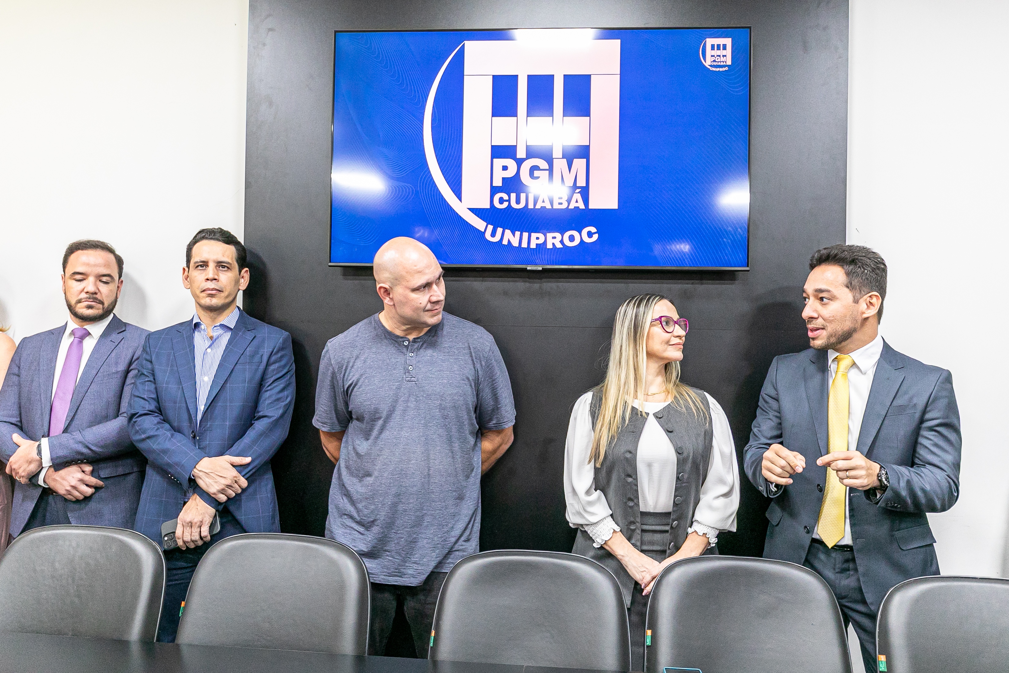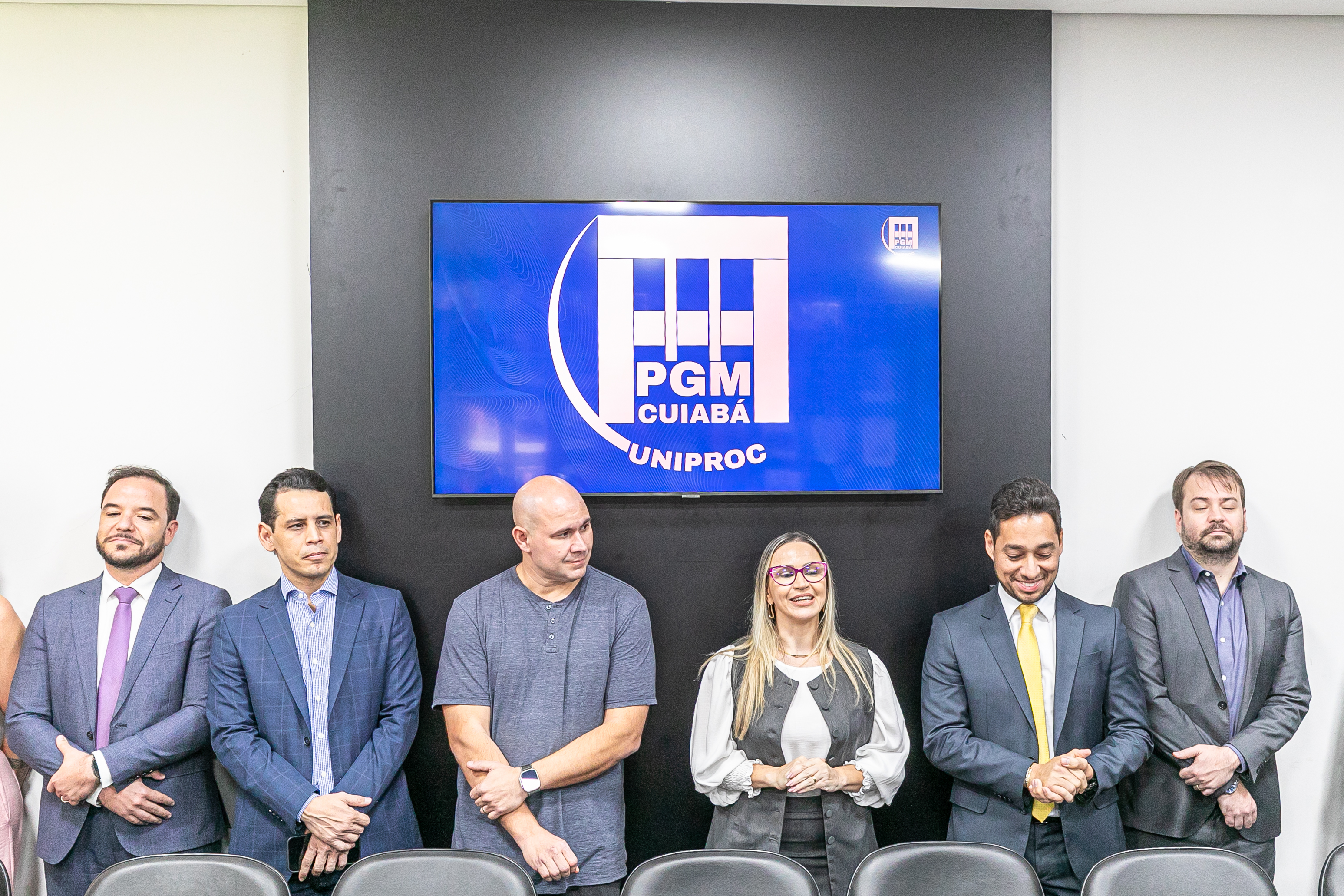 A foto ilustra o prefeito de Cuiabá, Abilio Brunini, o procurador Luiz Antônio Araújo Junior, lado a lado, com diversos procuradores e servidores no fundo.