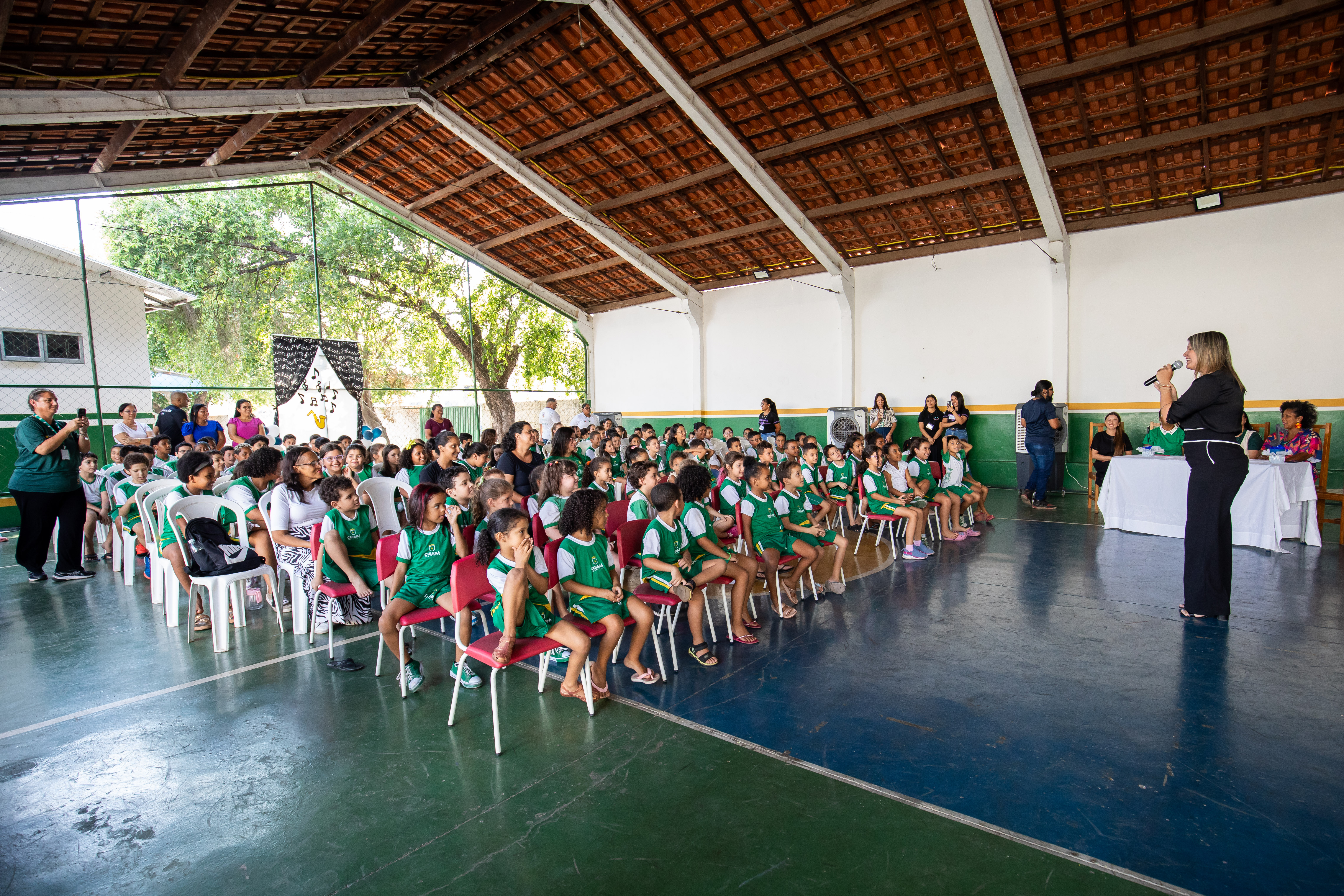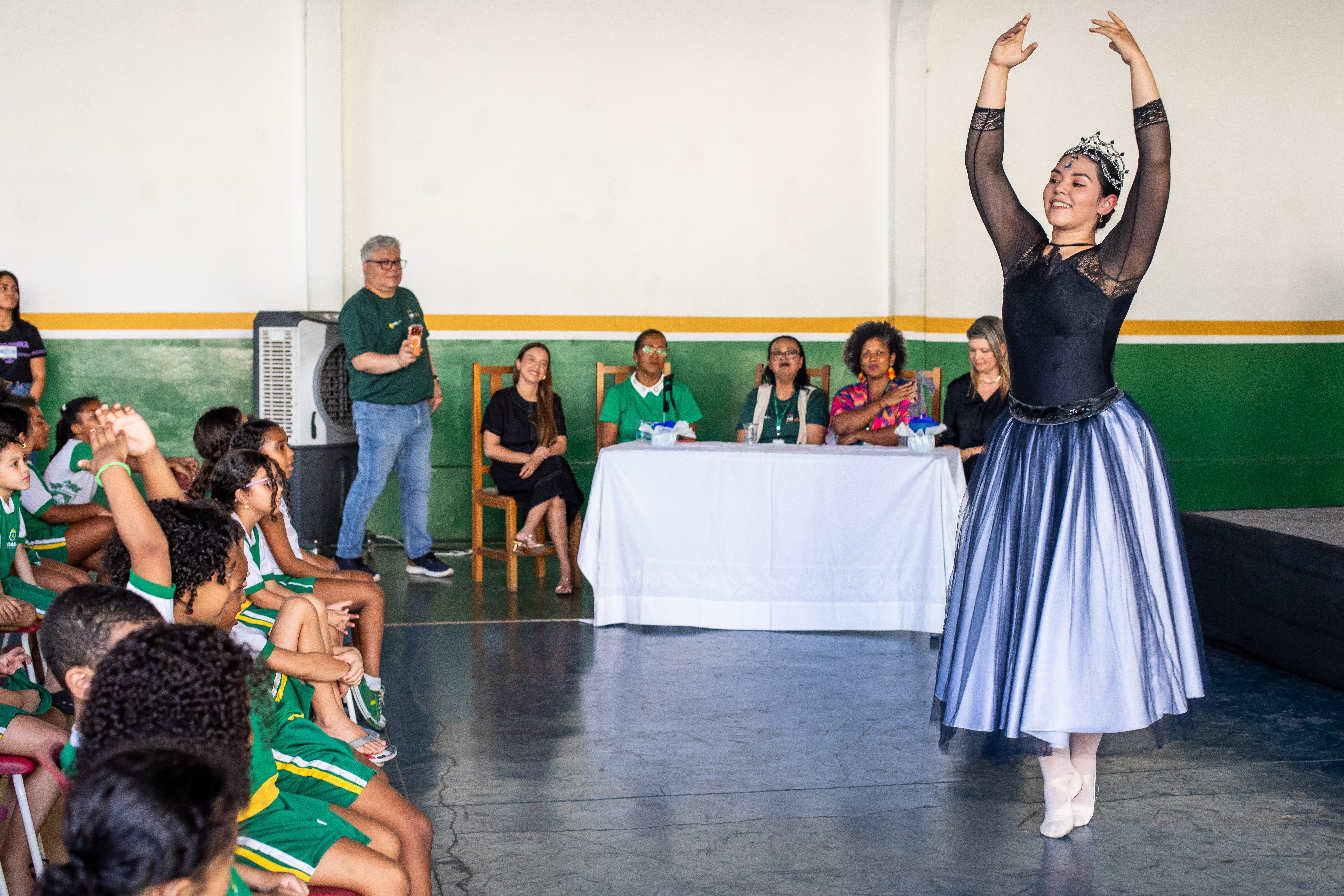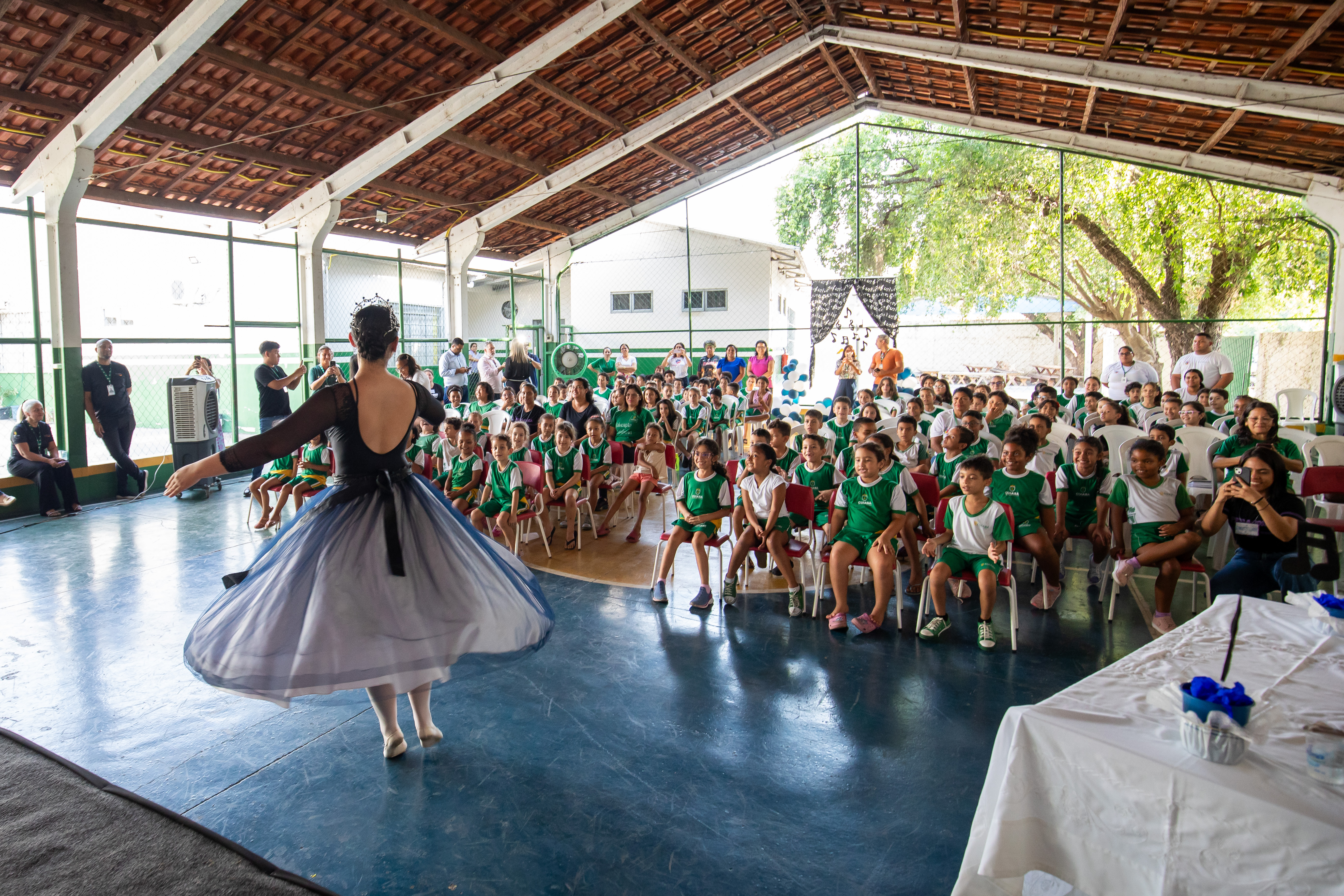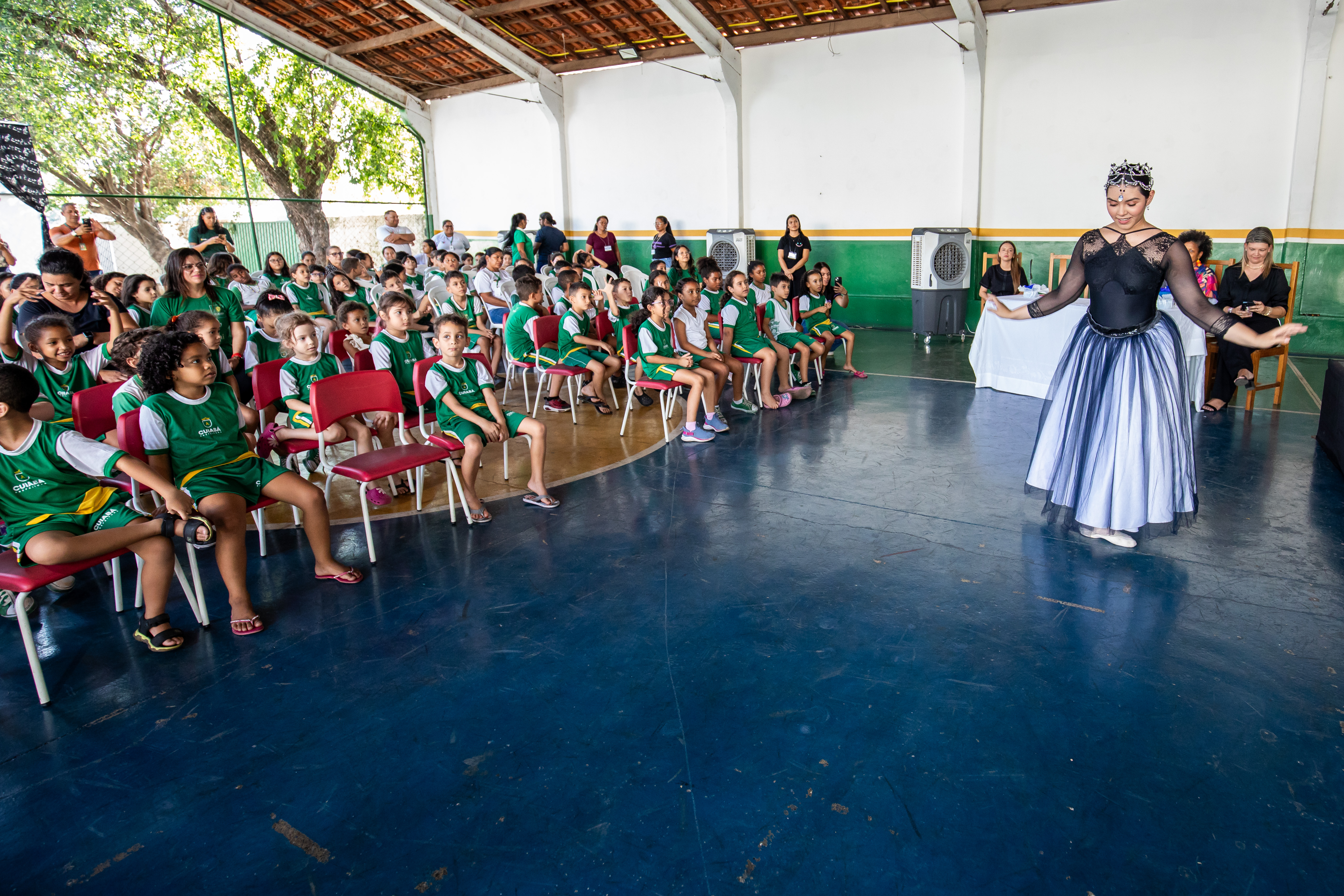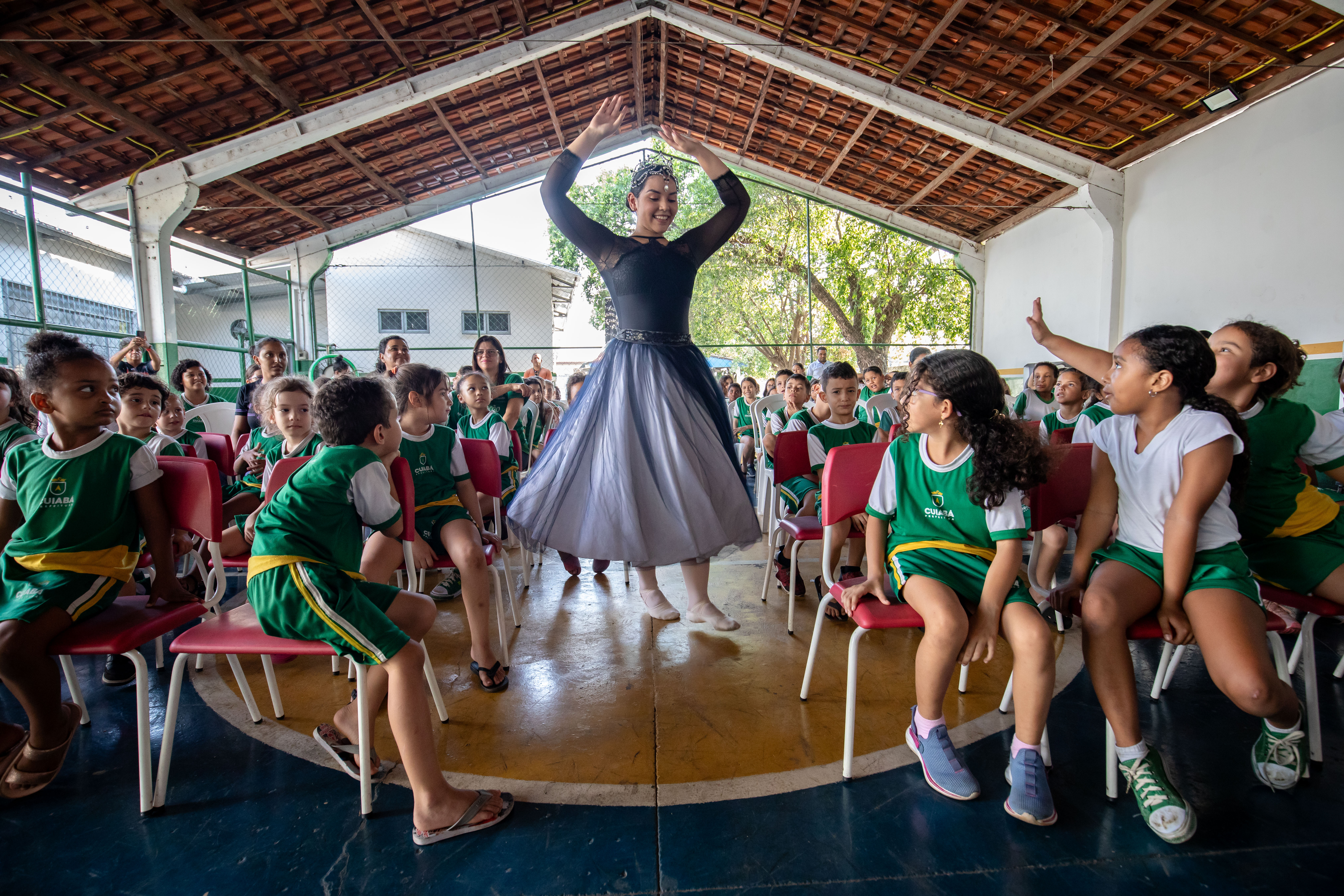 A foto ilustra uma bailarina dançando numa quadra esportiva de piso azul. No local, estão crianças sentadas em cadeiras, todas devidamente vestidas com uniforme oficial da Prefeitura de Cuiabá, prestando atenção na exibição da arte.