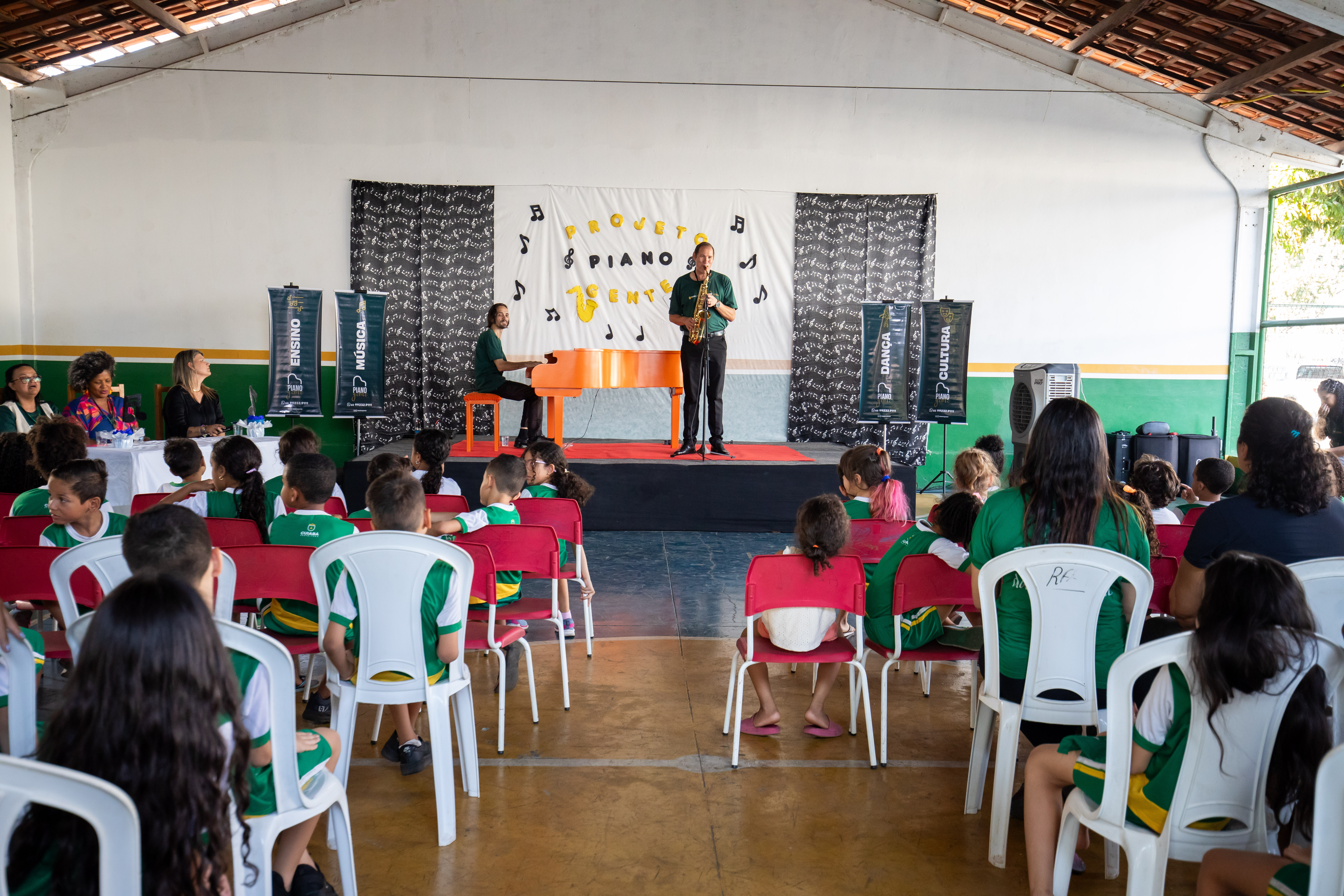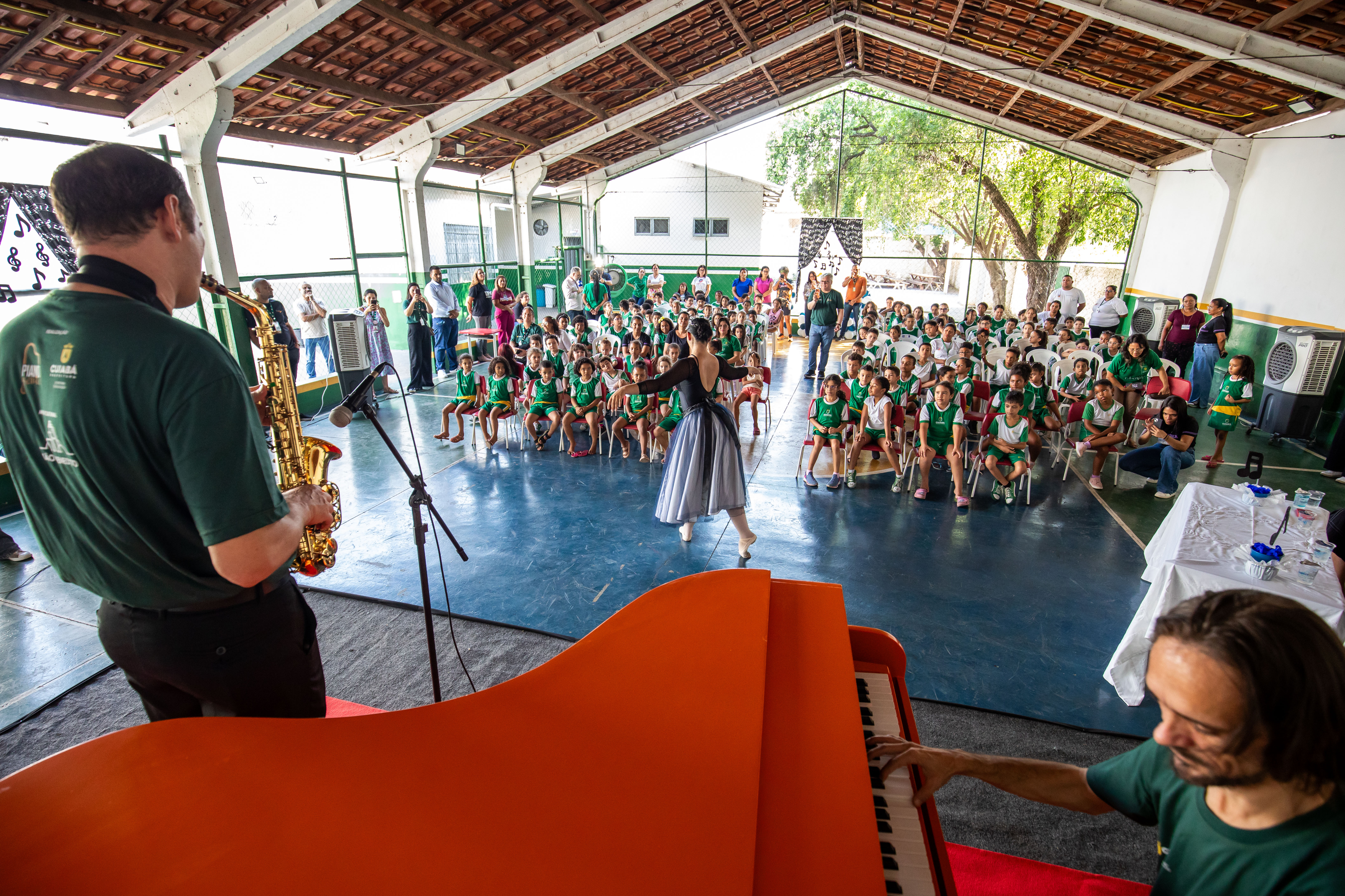Um espetáculo de apresentação de piano, balé e saxofone foi iniciado na tarde desta segunda-feira (16) nas escolas de Cuiabá.