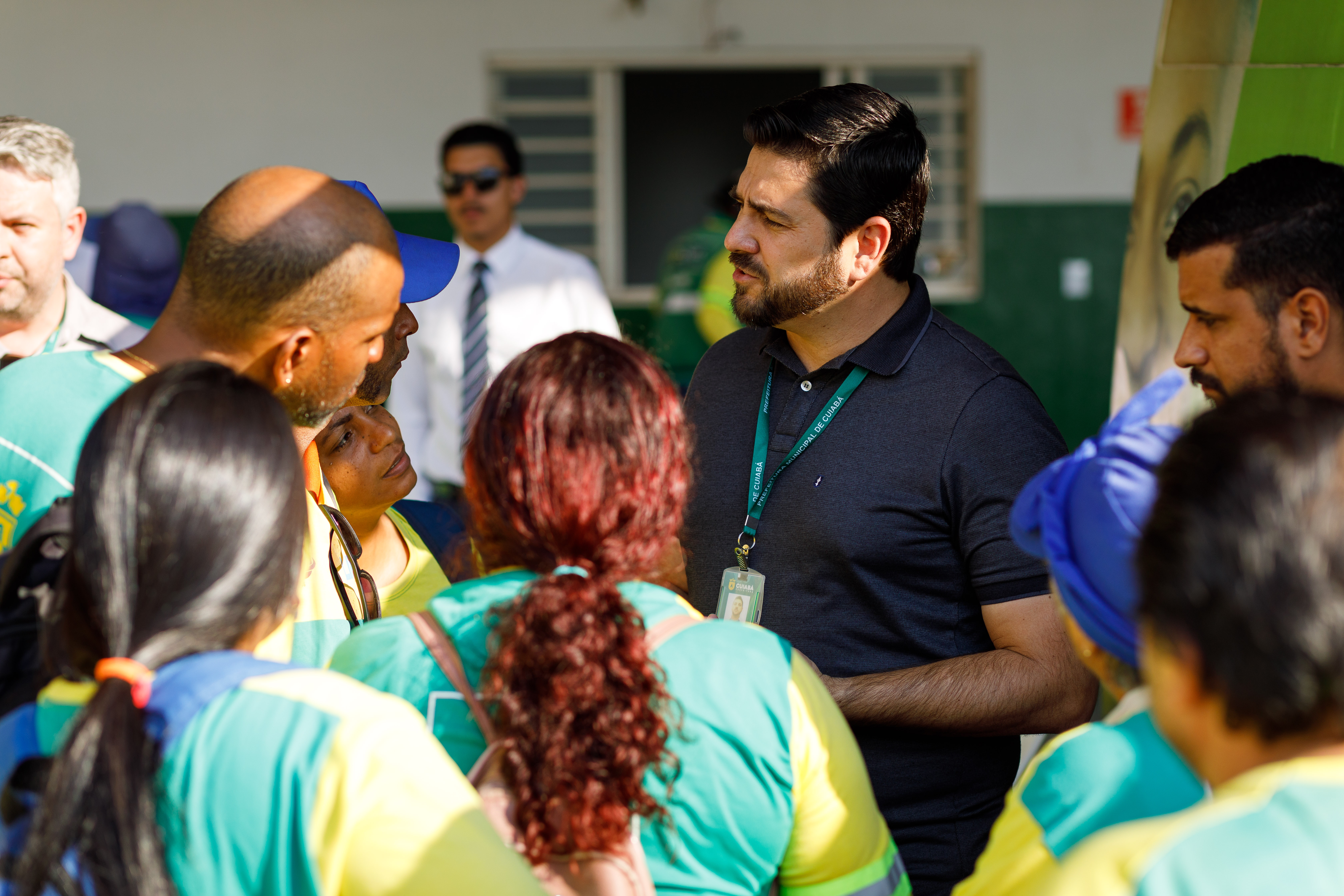 A imagem mostra o prefeito Abilio Brunini em diálogo com os colaboradores da Empresa Cuiabana de Zeladoria e Serviços Urbanos - Limpurb.
