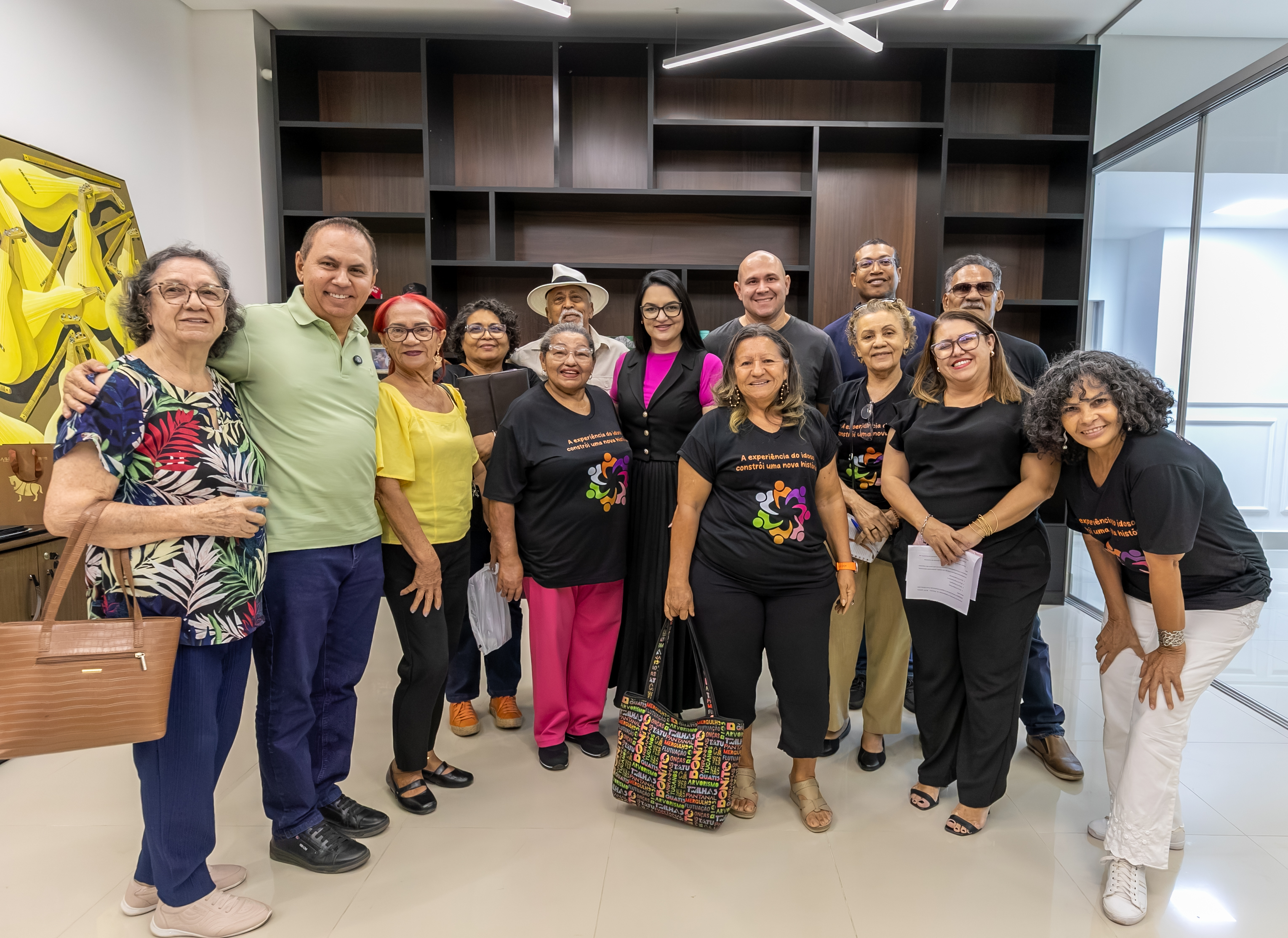 A imagem que ilustra a matéria mostra o prefeito Abílio Brunini, a vereadora e primeira-dama Samantha Iris, o vereador Dilário Alencar e representantes do Coletivo dos Centros de Convivência de Idosos durante reunião.