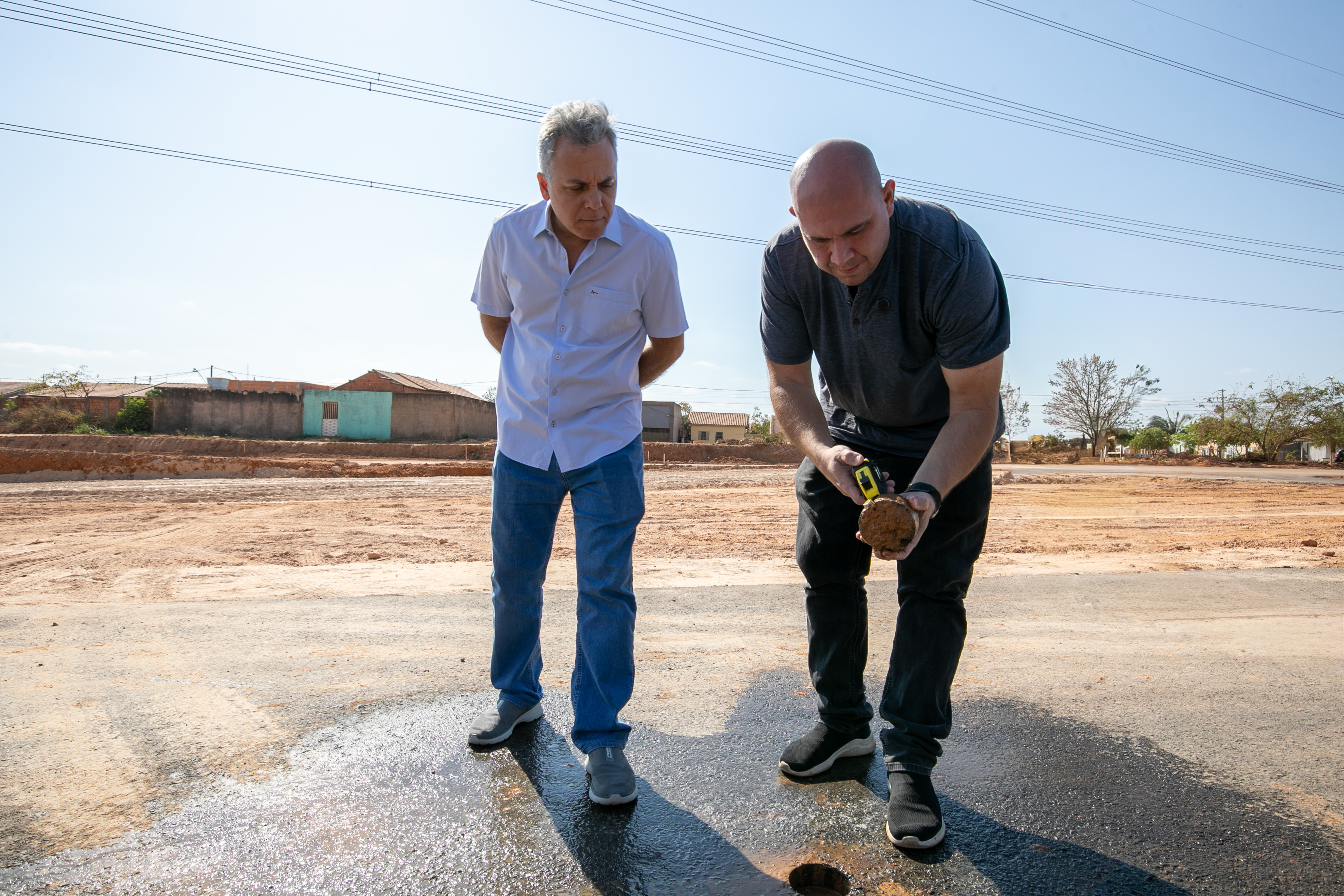 A foto mostra o secretário de Infraestrutura e Obras, Reginaldo Teixeira, de camisa branca, e o prefeito de Cuiabá, Abilio Brunini, de camisa cinza, medindo a espessura do asfalto. Abaixo, há uma galeria de imagens que registra o momento da fiscalização.