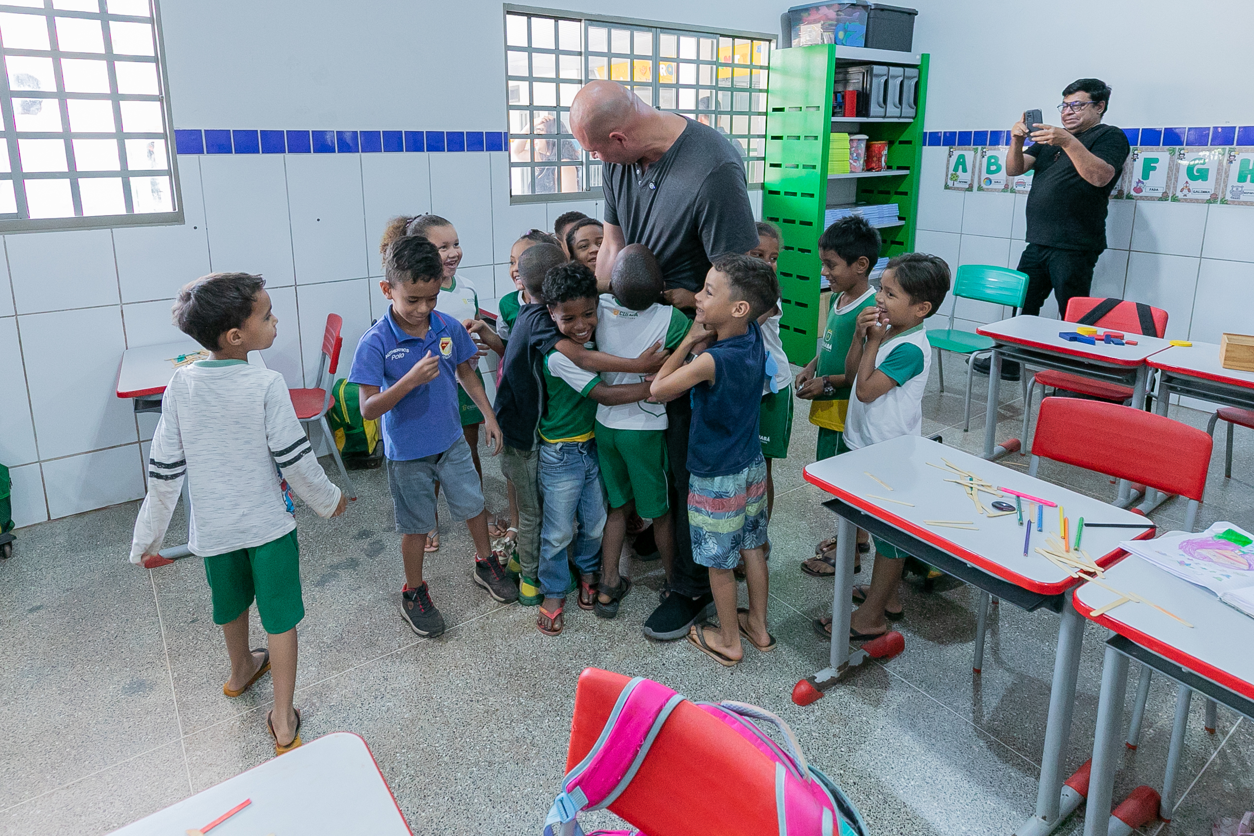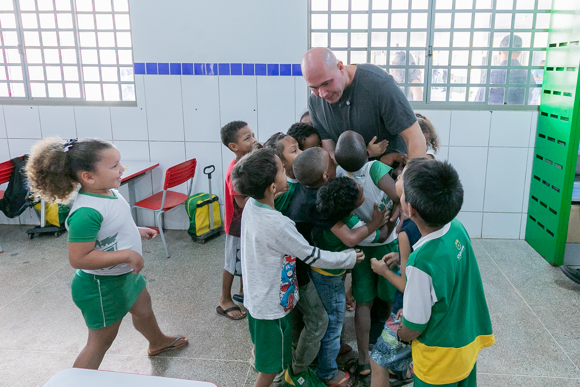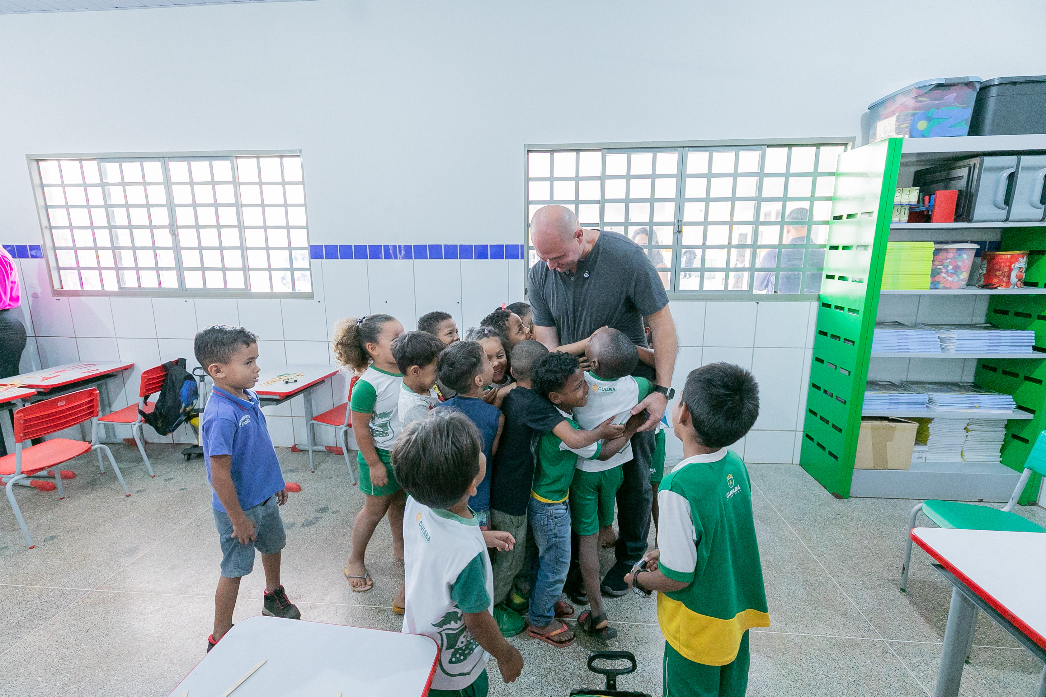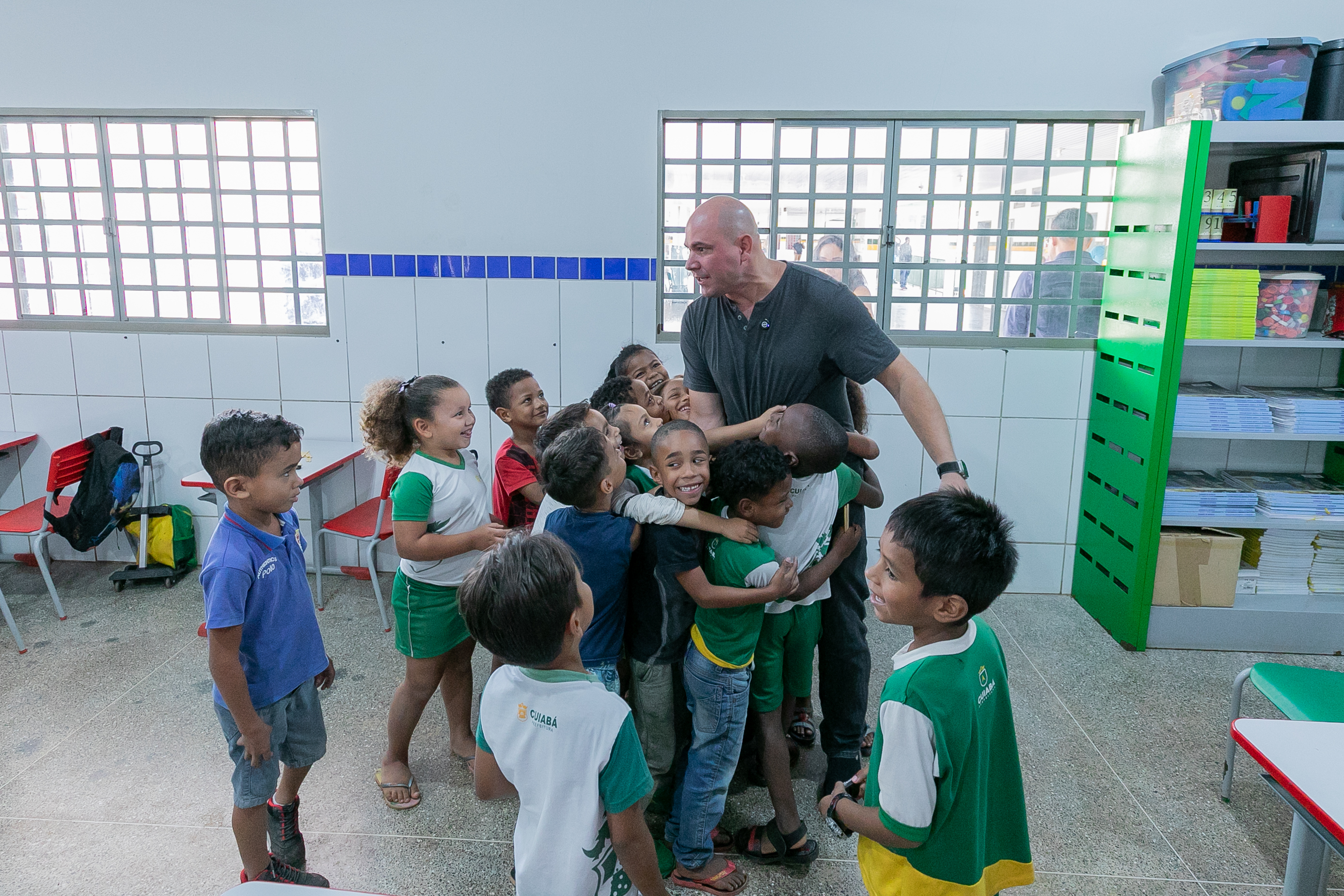 A foto ilustra o prefeito Abilio Brunini vestido de camisa cinza e ajoelhado numa posição de foto. Ele está cercado de crianças que exibem a capa de livros.