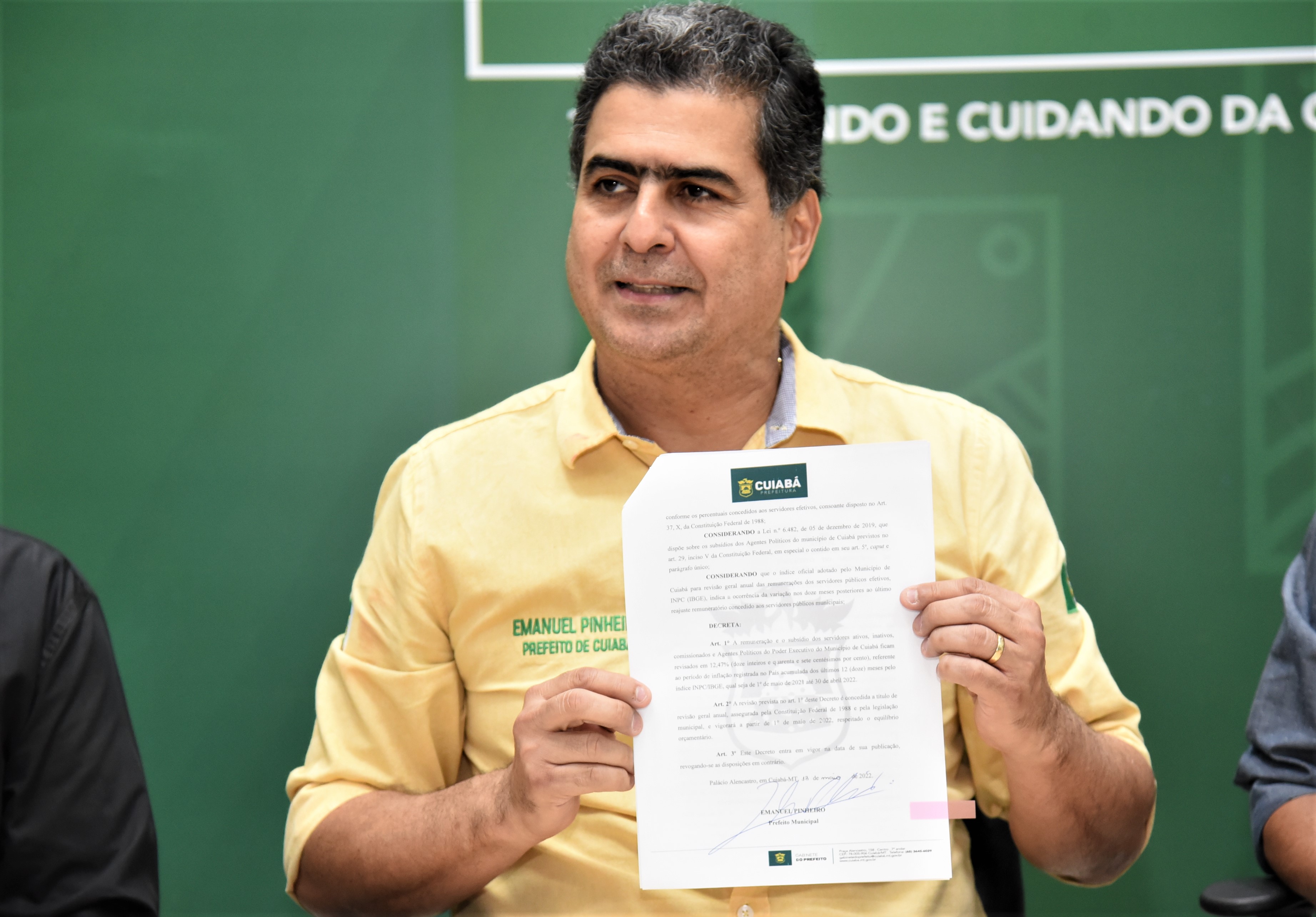 O prefeito Emanuel Pinheiro assinou, na sexta-feira (13), o decreto nº 9.091/2022 que estabelece o Reajuste Geral Anual (RGA) de 12,47% aos servidores municipais ativos e inativos. A revisão será creditada na folha de pagamento já do mês de maio, ratificando a política da gestão atual de reconhecimento e valorização dos agentes públicos. O ato ocorreu no Palácio Alencastro, juntamente com a presença do Fórum Sindical de Cuiabá e será publicado no diário da Gazeta Municipal.