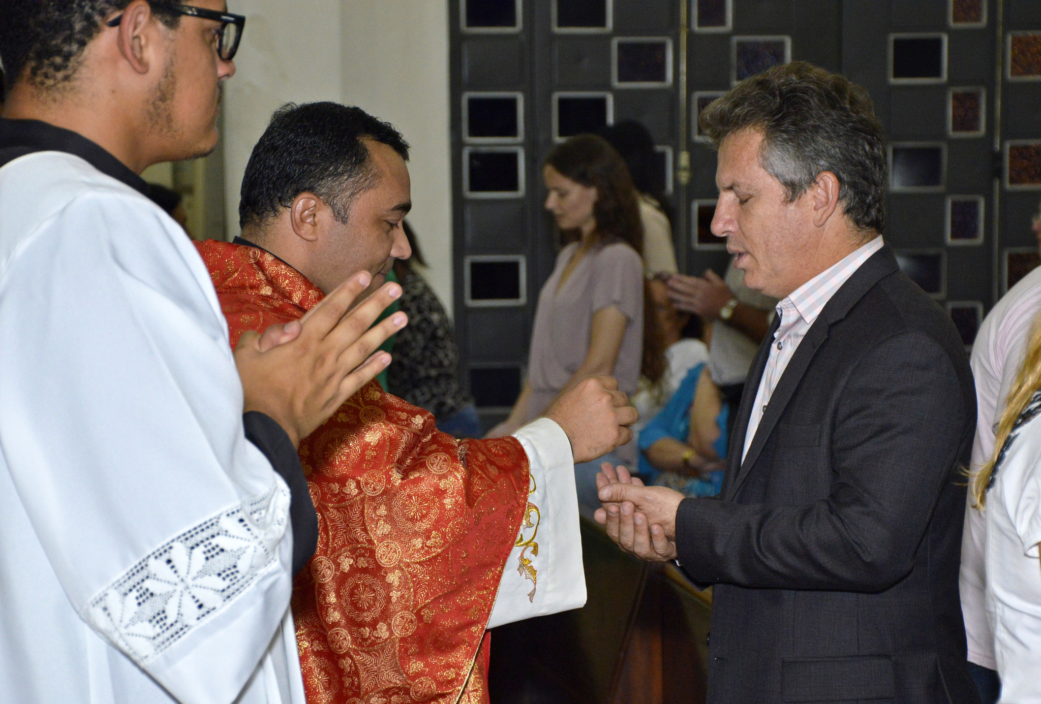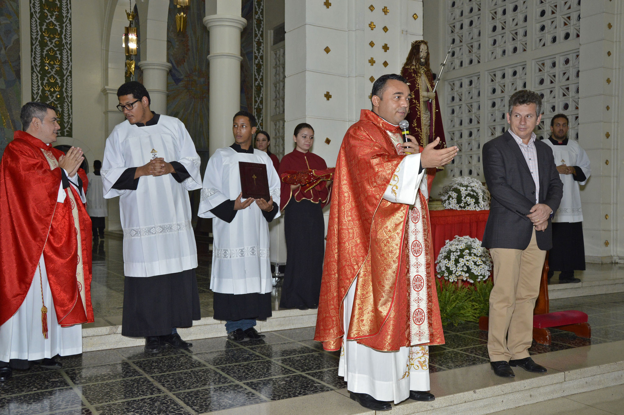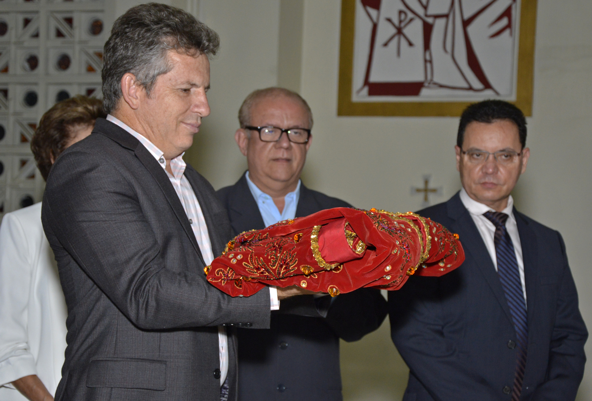 O prefeito Mauro Mendes recebeu na noite de segunda-feira (14) o manto que cobre a imagem do Senhor Bom Jesus de Cuiabá, padroeiro da capital. A entrega foi feita na Catedral Metropolitana pelo padre Edimilto Mota e faz parte da tradição cuiabana há quase 300 anos.