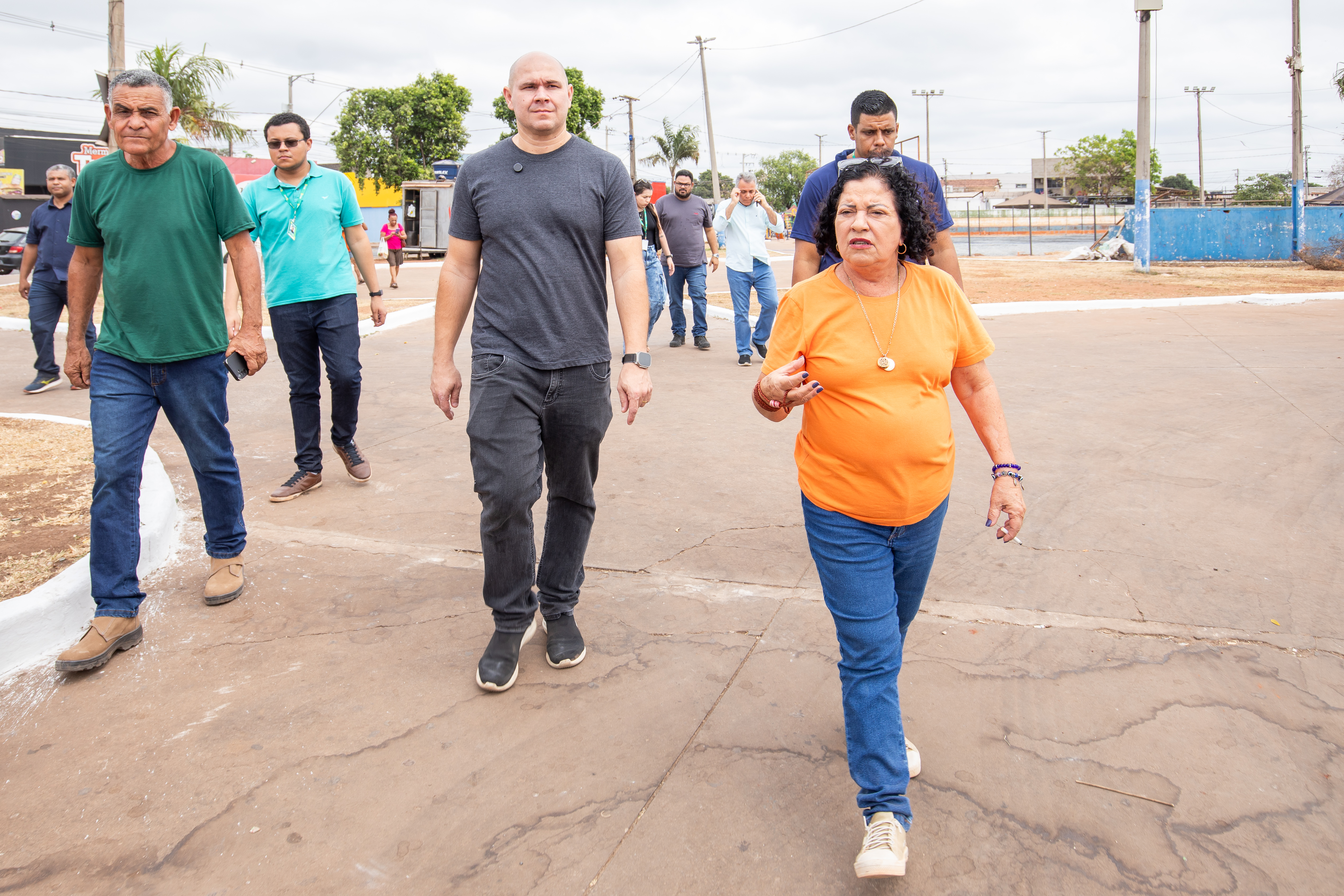 A imagem mostra o prefeito de Cuiabá, Abilio Brunini, e a vereadora Baixinha Geraldelli durante vistoria nas obras de revitalização do espaço esportivo da Praça do Pedra 90.