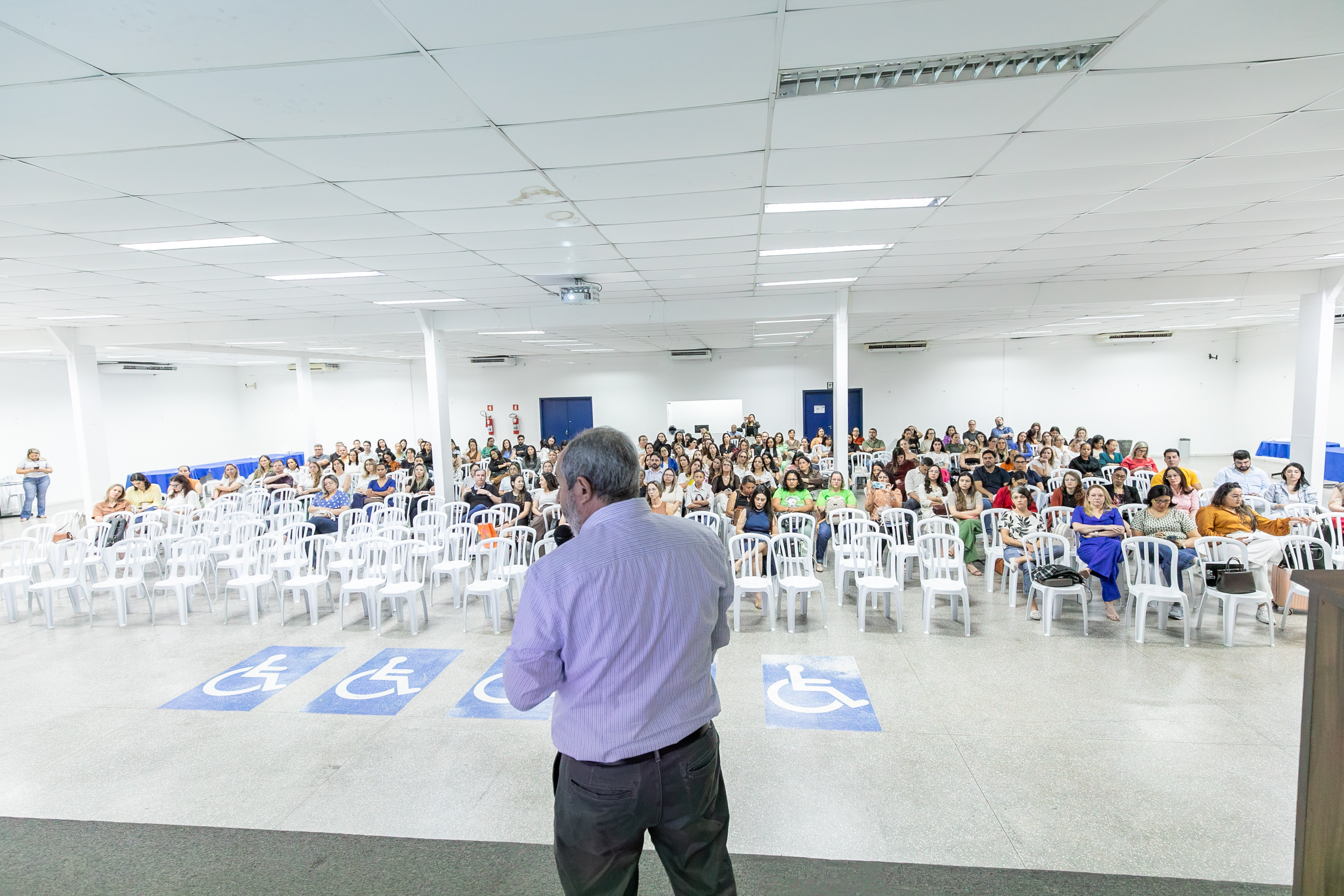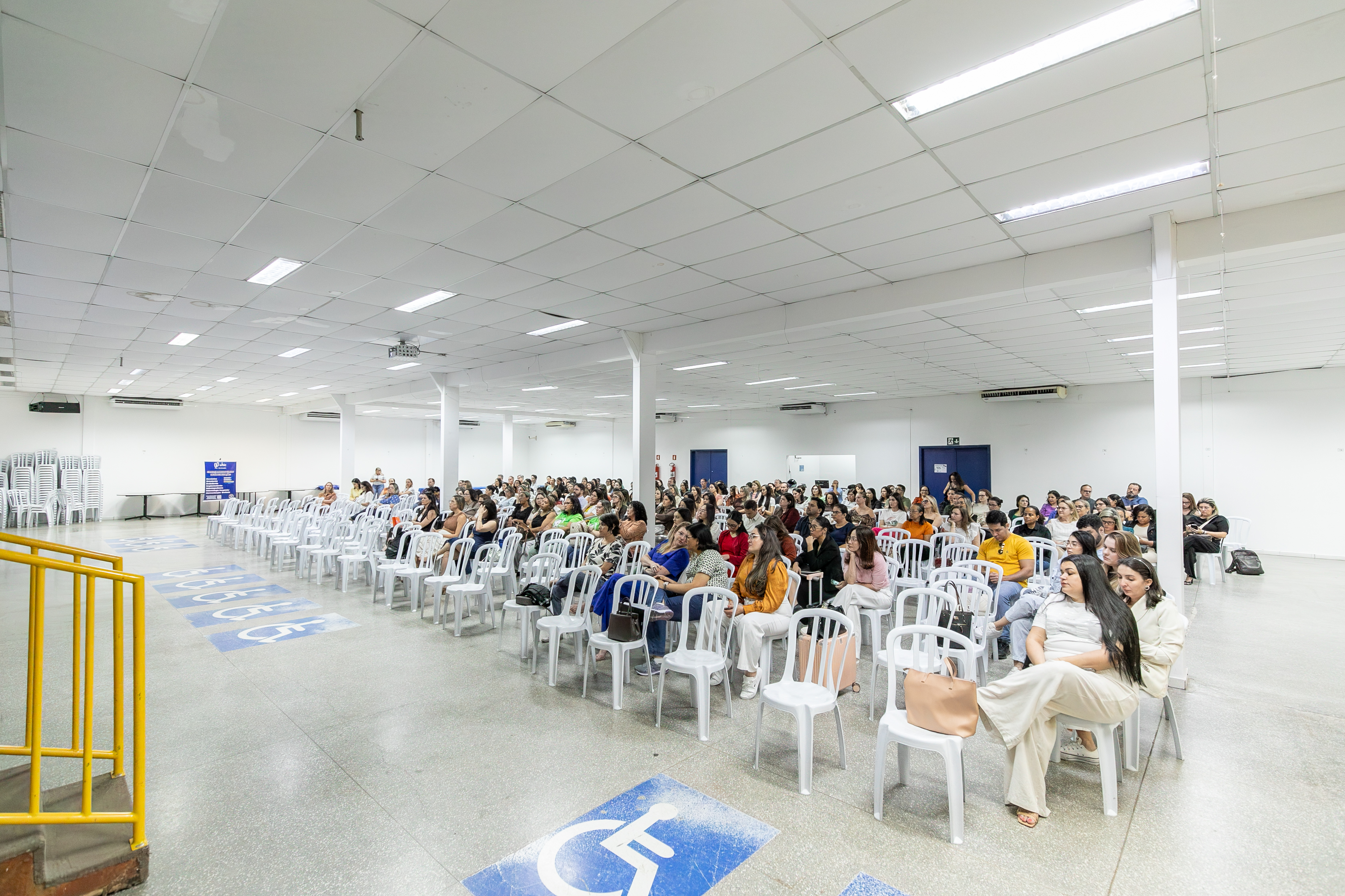 A imagem mostra um grupo de pessoas participando de uma palestra de capacitação dos servidores da Saúde de Cuiabá. À frente, estão as autoridades que compõem a mesa diretora, e ao fundo, os demais servidores que receberam a capacitação.