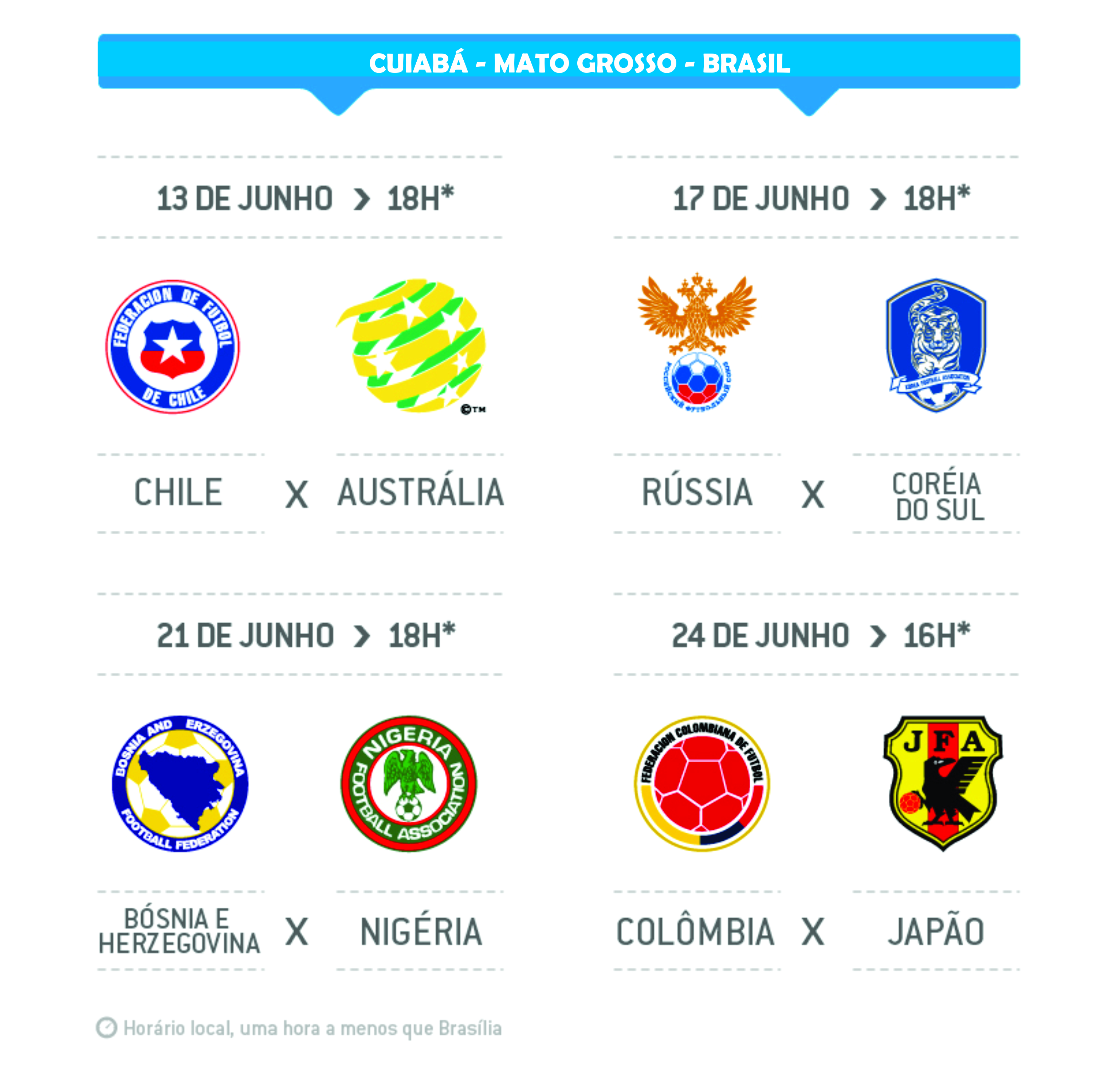 A Colômbia jogará em Cuiabá no dia 24 de junho, às 16h, contra o Japão. Além das duas seleções, também disputarão partidas na Capital os times do Chile, Austrália, Rússia, Coreia do Sul, Bósnia e Nigéria.