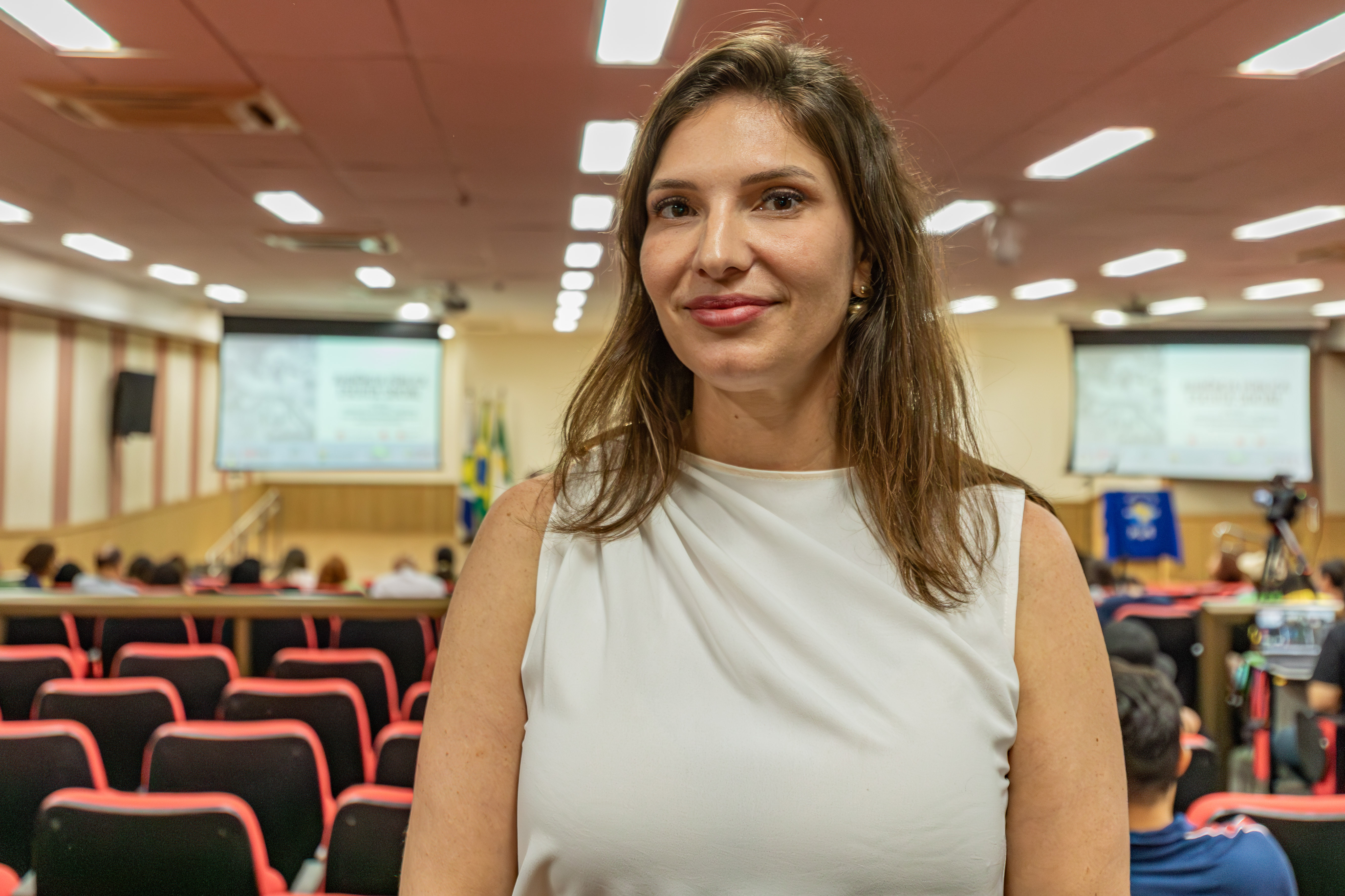 A foto que ilustra a matéria mostra a procuradora-chefe judicial, Bianca Botter Zanardi, durante a audiência pública intitulada “Escuta Social”, realizada no MPMT. Ela está sentada, segurando um microfone, ao lado de três autoridades. Veste uma blusa branca e uma saia longa.
