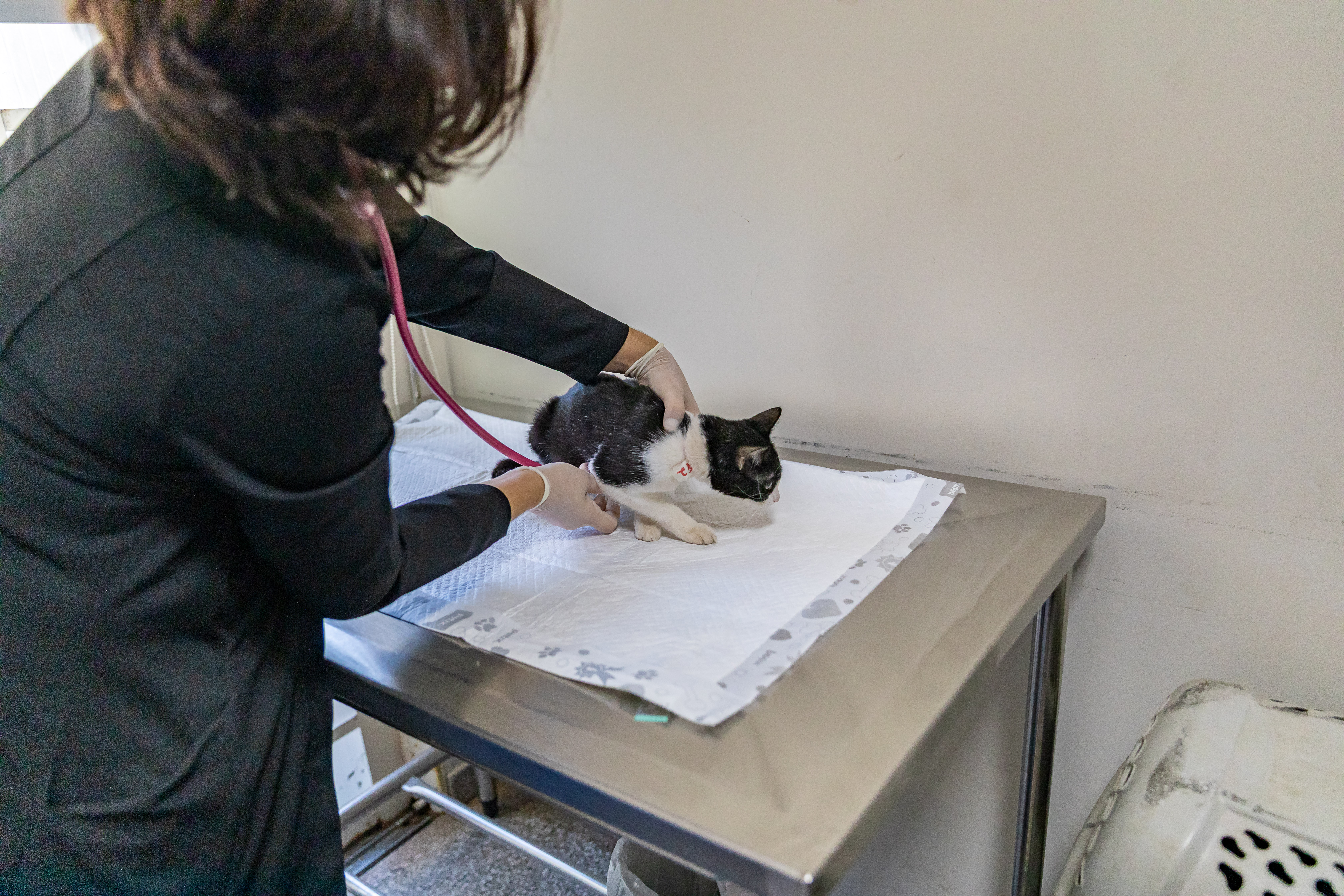 A foto que ilustra a matéria registra um atendimento sendo realizado por médica veterinária. No caso, um gato nas cores preto e branco está sobre uma mesa, que está forrada com pano branco e a médica segurando o felino para examiná-lo.