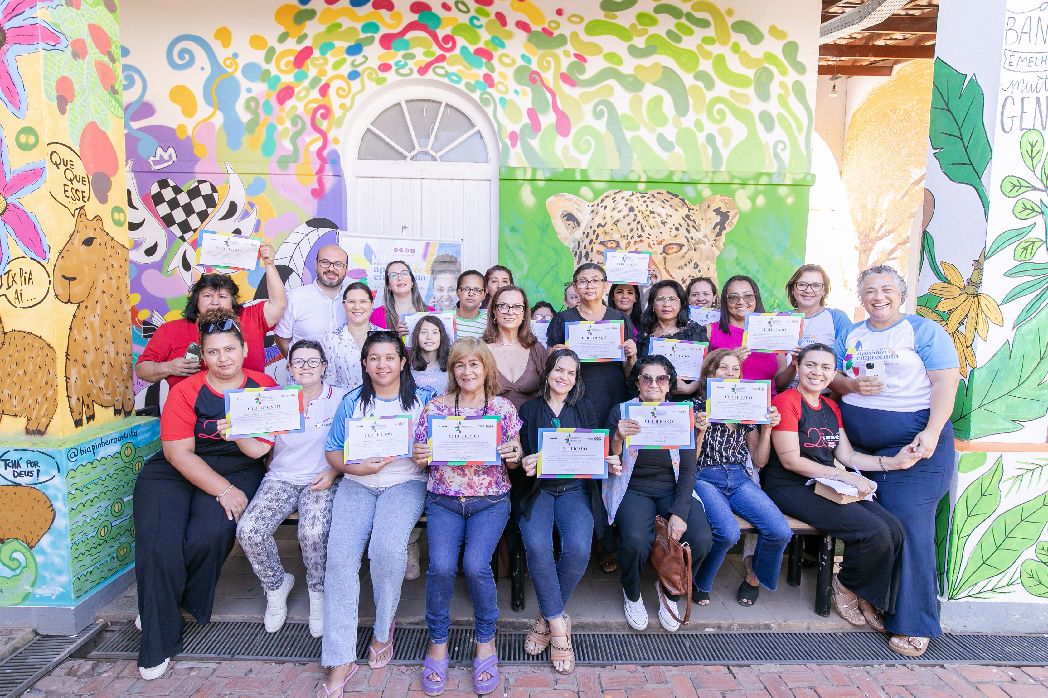 A imagem mostra as mulheres permissionárias do Mercado do Porto e do Shopping Orla que receberam os certificados no Museu do Rio e as equipes da Prefeitura de Cuiabá e do Instituto Inca envolvidas na capacitação.
